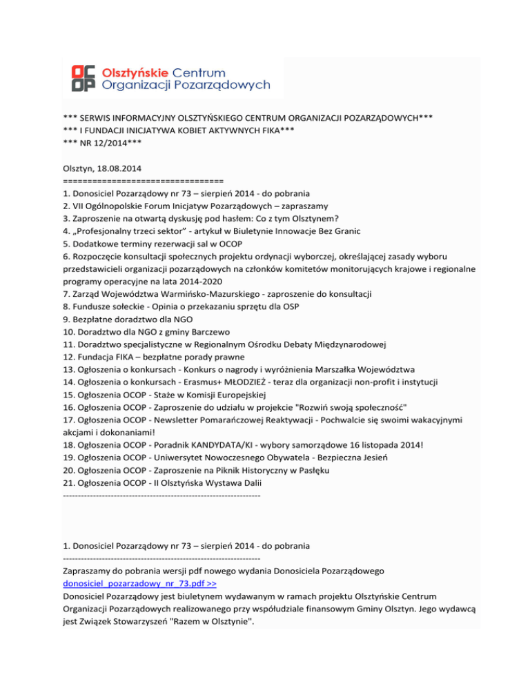 *** SERWIS INFORMACYJNY OLSZTYŃSKIEGO CENTRUM ORGANIZACJI POZARZĄDOWYCH*** *** I FUNDACJI INICJATYWA KOBIET AKTYWNYCH FIKA*** *** NR 12/2014*** Olsztyn, 18.08.2014 ================================= 1. Donosiciel Pozarządowy nr 73 – sierpień 2014 - do pobrania 2. VII Ogólnopolskie Forum Inicjatyw Pozarządowych – zapraszamy 3. Zaproszenie na otwartą dyskusję pod hasłem: Co z tym Olsztynem? 4. „Profesjonalny trzeci sektor” - artykuł w Biuletynie Innowacje Bez Granic 5. Dodatkowe terminy rezerwacji sal w OCOP 6. Rozpoczęcie konsultacji społecznych projektu ordynacji wyborczej, określającej zasady wyboru przedstawicieli organizacji pozarządowych na członków komitetów monitorujących krajowe i regionalne programy operacyjne na lata 2014-2020 7. Zarząd Województwa Warmińsko-Mazurskiego - zaproszenie do konsultacji 8. Fundusze sołeckie - Opinia o przekazaniu sprzętu dla OSP 9. Bezpłatne doradztwo dla NGO 10. Doradztwo dla NGO z gminy Barczewo 11. Doradztwo specjalistyczne w Regionalnym Ośrodku Debaty Międzynarodowej 12. Fundacja FIKA – bezpłatne porady prawne 13. Ogłoszenia o konkursach - Konkurs o nagrody i wyróżnienia Marszałka Województwa 14. Ogłoszenia o konkursach - Erasmus+ MŁODZIEŻ - teraz dla organizacji non-profit i instytucji 15. Ogłoszenia OCOP - Staże w Komisji Europejskiej 16. Ogłoszenia OCOP - Zaproszenie do udziału w projekcie "Rozwiń swoją społeczność" 17. Ogłoszenia OCOP - Newsletter Pomarańczowej Reaktywacji - Pochwalcie się swoimi wakacyjnymi akcjami i dokonaniami! 18. Ogłoszenia OCOP - Poradnik KANDYDATA/KI - wybory samorządowe 16 listopada 2014! 19. Ogłoszenia OCOP - Uniwersytet Nowoczesnego Obywatela - Bezpieczna Jesień 20. Ogłoszenia OCOP - Zaproszenie na Piknik Historyczny w Pasłęku 21. Ogłoszenia OCOP - II Olsztyńska Wystawa Dalii ------------------------------------------------------------------ 1. Donosiciel Pozarządowy nr 73 – sierpień 2014 - do pobrania -----------------------------------------------------------------Zapraszamy do pobrania wersji pdf nowego wydania Donosiciela Pozarządowego donosiciel_pozarzadowy_nr_73.pdf >> Donosiciel Pozarządowy jest biuletynem wydawanym w ramach projektu Olsztyńskie Centrum Organizacji Pozarządowych realizowanego przy współudziale finansowym Gminy Olsztyn. Jego wydawcą jest Związek Stowarzyszeń "Razem w Olsztynie". Archiwum DP >> 2. VII Ogólnopolskie Forum Inicjatyw Pozarządowych – zapraszamy -----------------------------------------------------------------W dniach 8 – 15 września 2014 r. w Warszawie odbędzie się VII Ogólnopolskie Forum Inicjatyw Pozarządowych. Jest to największe święto organizacji pozarządowych w naszym kraju, które organizowane jest, co 3 lata przez Ogólnopolską Federację Organizacji Pozarządowych. Wiodącym wydarzeniem OFIP jest Forum – konferencja odbywająca się na Uniwersytecie Warszawskim (14-15 września 2014). Przedstawicieli samorządu i organizacji pozarządowych szczególnie zapraszamy 15 września do wzięcia udziału w panelu pn. „Zlecanie zadań organizacjom pozarządowym przez jednostki samorządu terytorialnego – modele współpracy dzięki funduszom europejskim” współorganizowanym m.in. przez przedstawicieli Związku Stowarzyszeń „Razem w Olsztynie”. Zobacz więcej >> 3. Zaproszenie na otwartą dyskusję pod hasłem: Co z tym Olsztynem? -----------------------------------------------------------------Stowarzyszenie Społeczno-Kulturalnego „Pojezierze”, w porozumieniu z Olsztyńskim Centrum Organizacji Pozarządowych oraz z „Gazetą Olsztyńską”, zapraszają na otwartą dyskusję pod hasłem: CO Z TYM OLSZTYNEM? Zobacz więcej >> 4. „Profesjonalny trzeci sektor” - artykuł w Biuletynie Innowacje Bez Granic -----------------------------------------------------------------Zapraszamy do lektury nowego numeru Biuletynu Innowacje Bez Granic, w którym znajduje się artykuł pt. „Profesjonalny trzeci sektor” - rozmowa z Moniką Falej i Martą Podsiad oraz z ekspertką Dorotą Czarzastą-Wardyn ze Związku Stowarzyszeń „Razem w Olsztynie", realizującego projekt „Razem w kierunku profesjonalizacji działań” s.35. Zobacz więcej >> 5. Dodatkowe terminy rezerwacji sal w OCOP --------------------------------------------------------------------Wychodząc naprzeciw życzeniom klientów Olsztyńskiego Centrum Organizacji Pozarządowych informujemy, że istnieje możliwość wynajęcia sal szkoleniowych w soboty do końca listopada 2014. Zapraszamy! Zespół OCOP Zobacz więcej >> 6. Rozpoczęcie konsultacji społecznych projektu ordynacji wyborczej, określającej zasady wyboru przedstawicieli organizacji pozarządowych na członków komitetów monitorujących krajowe i regionalne programy operacyjne na lata 2014-2020 ------------------------------------------------------------------ Rozpoczęły się konsultacje społeczne projektu ordynacji wyborczej, określającej zasady wyboru przedstawicieli organizacji pozarządowych na członków komitetów monitorujących krajowe i regionalne programy operacyjne na lata 2014-2020. Konsultacje będą trwać do 24 sierpnia 2014. Zobacz więcej >> 7. Zarząd Województwa Warmińsko-Mazurskiego - zaproszenie do konsultacji -----------------------------------------------------------------Zaproszenie skierowane jest do młodzieży, środowisk młodzieżowych i działających na rzecz młodzieży i dotyczy wyrażania opinii nt. projektu programu wsparcia inicjatyw młodzieżowych oraz sposobów i warunków upowszechniania sportu wśród młodzieży (konsultacje dot. 2 dokumentów w obszarach dot. młodzieży). Zobacz więcej >> 8. Fundusze sołeckie - Opinia o przekazaniu sprzętu dla OSP -----------------------------------------------------------------W skali kraju kilka procent wydatków z funduszy sołeckich dotyczy zakupów sprzętu dla OSP. Kto jest właścicielem wyposażenia? W jaki sposób zgodnie z prawem przekazać sprzęt OSP