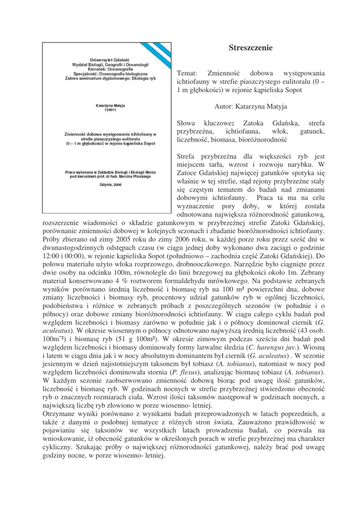 Streszczenie Temat: Zmienno dobowa wyst powania ichtiofauny w strefie piaszczystego eulitoralu (0 – 1 m gł boko ci) w rejonie k pieliska Sopot Autor: Katarzyna Matyja Słowa kluczowe: Zatoka Gda ska, strefa przybrze na, ichtiofauna, włok, gatunek, liczebno , biomasa, bioró norodno Strefa przybrze na dla wi kszo ci ryb jest miejscem tarła, wzrost i rozwoju narybku. W Zatoce Gda skiej najwi cej gatunków spotyka si wła nie w tej strefie, st d rejony przybrze ne stały si cz stym tematem do bada nad zmianami dobowymi ichtiofauny. Praca ta ma na celu wyznaczenie pory doby, w której została odnotowana najwi ksza ró norodno gatunkow , rozszerzenie wiadomo ci o składzie gatunkowym w przybrze nej strefie Zatoki Gda skiej, porównanie zmienno ci dobowej w kolejnych sezonach i zbadanie bioró norodno ci ichtiofauny. Próby zbierano od zimy 2005 roku do zimy 2006 roku, w ka dej porze roku przez sze dni w dwunastogodzinnych odst pach czasu (w ci gu jednej doby wykonano dwa zaci gi o godzinie 12:00 i 00:00), w rejonie k pieliska Sopot (południowo – zachodnia cz Zatoki Gda skiej). Do połowu materiału u yto włoka rozprzowego, drobnooczkowego. Narz dzie było ci gni te przez dwie osoby na odcinku 100m, równolegle do linii brzegowej na gł boko ci około 1m. Zebrany materiał konserwowano 4 % roztworem formaldehydu mrówkowego. Na podstawie zebranych wyników porównano redni liczebno i biomas ryb na 100 m² powierzchni dna, dobowe zmiany liczebno ci i biomasy ryb, procentowy udział gatunków ryb w ogólnej liczebno ci, podobie stwa i ró nice w zebranych próbach z poszczególnych sezonów (w południe i o północy) oraz dobowe zmiany bioró norodno ci ichtiofauny. W ci gu całego cyklu bada pod wzgl dem liczebno ci i biomasy zarówno w południe jak i o północy dominował ciernik (G. aculeatus). W okresie wiosennym o północy odnotowano najwy sz redni liczebno (43 osob. 100m ²) i biomas ryb (51 g 100m²). W okresie zimowym podczas sze ciu dni bada pod wzgl dem liczebno ci i biomasy dominowały formy larwalne ledzia (C. harengus juv.). Wiosn i latem w ci gu dnia jak i w nocy absolutnym dominantem był ciernik (G. aculeatus) . W sezonie jesiennym w dzie najistotniejszym taksonem był tobiasz (A. tobianus), natomiast w nocy pod wzgl dem liczebno ci dominowała stornia (P. flesus), analizuj c biomas tobiasz (A. tobianus). W ka dym sezonie zaobserwowano zmienno dobow bior c pod uwag ilo gatunków, liczebno i biomas ryb. W godzinach nocnych w strefie przybrze nej stwierdzono obecno ryb o znacznych rozmiarach ciała. Wzrost ilo ci taksonów nast pował w godzinach nocnych, a najwi ksz liczb ryb złowiono w porze wiosenno- letniej. Otrzymane wyniki porównano z wynikami bada przeprowadzonych w latach poprzednich, a tak e z danymi o podobnej tematyce z ró nych stron wiata. Zauwa ono prawidłowo w pojawianiu si taksonów we wszystkich latach prowadzenia bada , co pozwala na wnioskowanie, i obecno gatunków w okre lonych porach w strefie przybrze nej ma charakter cykliczny. Szukaj c próby o najwi kszej ró norodno ci gatunkowej, nale y bra pod uwag godziny nocne, w porze wiosenno- letniej.