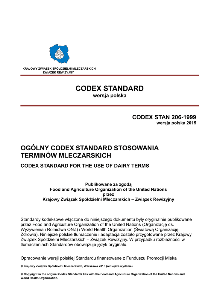 KRAJOWY ZWIĄZEK SPÓŁDZIELNI MLECZARSKICH ZWIĄZEK REWIZYJNY CODEX STANDARD wersja polska CODEX STAN 206-1999 wersja polska 2015 OGÓLNY CODEX STANDARD STOSOWANIA TERMINÓW MLECZARSKICH CODEX STANDARD FOR THE USE OF DAIRY TERMS Publikowane za zgodą Food and Agriculture Organization of the United Nations przez Krajowy Związek Spółdzielni Mleczarskich – Związek Rewizyjny Standardy kodeksowe włączone do niniejszego dokumentu były oryginalnie publikowane przez Food and Agriculture Organization of the United Nations (Organizację ds. Wyżywienia i Rolnictwa ONZ) i World Health Organization (Światową Organizację Zdrowia). Niniejsze polskie tłumaczenie i adaptacja zostało przygotowane przez Krajowy Związek Spółdzielni Mleczarskich – Związek Rewizyjny. W przypadku rozbieżności w tłumaczeniach Standardów obowiązuje język oryginału. Opracowanie wersji polskiej Standardu finansowane z Funduszu Promocji Mleka Krajowy Związek Spółdzielni Mleczarskich, Warszawa 2015 (niniejsze wydanie) Copyright in the original Codex Standards lies with the Food and Agriculture Organization of the United Nations and World Health Organization. Przedmowa Niniejszy Standard został przetłumaczony przez Krajowy Związek Spółdzielni Mleczarskich – Związek Rewizyjny z udziałem ekspertów krajowych z Komitetu Technicznego PKN nr 35 ds. Mleka i Przetworów Mlecznych. Krajowy Związek pragnie przekazać wszystkim zainteresowanym tłumaczenia Standardów Kodeksowych, wytycznych, zaleceń czy innych dokumentów Komisji Kodeksu Żywnościowego FAO/WHO (zbiór Codex Alimentarius). Organizacja FAO/WHO jest największym światowym forum w zakresie bezpieczeństwa i jakości żywności. Z uwagi na szeroką reprezentację w pracach kodeksowych organizacji rządowych, w tym Polski i Unii Europejskiej, tworzone Standardy czy inne dokumenty są powszechnie akceptowane i praktykowane, zwłaszcza w handlu międzynarodowym żywnością, w tym przetworami mlecznymi. Część przepisów, na przykład w odniesieniu do substancji dodatkowych dozwolonych, jest niezgodna z prawodawstwem unijnym w danym zakresie, co zostało zaznaczone w komentarzach bezpośrednio w treści Standardu. Niniejszy dokument obejmuje tłumaczenie aktualnego kodeksowego Standardu CODEX STAN 206-1999 General Codex Standard for the Use of Dairy Terms z komentarzami krajowych ekspertów. Oryginał jest dostępny na stronie www.codexalimentarius.net . CODEX STAN 206-1999 General Codex Standard for the Use of Dairy Terms był poprzedzony następującym dokumentem: The Code of Principles Concerning Milk and Milk Products. Komentarze krajowych ekspertów dotyczą: wykazania różnic w stosunku do prawa Unii Europejskiej bądź wskazania na przepisy odrębne, w szczególności w zakresie dozwolonych substancji dodatkowych, zanieczyszczeń mikrobiologicznych i innych, praktycznie stosowanych w Polsce technologii, technik lub ich modyfikacji, polskiego nazewnictwa przetworów mlecznych, terminologii, innych praktyk stosowanych w Polsce. 3 Komentarze ekspertów krajowych są ujęte w odnośnikach oznaczonych symbolem K… ze wskazaniem kolejnego numeru i umieszczone w treści Standardu. Wszystkie powoływane w Standardzie dokumenty mają pozostawione oryginalne tytuły. Załącznik krajowy do niniejszego Standardu zawiera tłumaczenia na język polski tytułów powoływanych dokumentów jak również wskazanie ostatniej zmiany lub rewizji. 4 OGÓLNY STANDARD STOSOWANIA TERMINÓW MLECZARSKICH (CODEX STAN 206-1999) OGÓLNY CODEX STANDARD STOSOWANIA TERMINÓW MLECZARSKICH CODEX STAN 206-19991 1. ZAKRES Niniejszy Standard dotyczy stosowania terminów mleczarskich w odniesieniu do żywności oferowanej konsumentowi lub do dalszego przetwarzania. 2. DEFINICJE 2.1 Mleko jest wydzieliną gruczołu mlecznego zwierząt użytkowanych mlecznie uzyskaną z jednego lub więcej dojów, do którego nic nie dodano ani niczego nie odjęto, przeznaczone do konsumpcji jako płynne mleko lub do dalszego przetwarzania. 2.2 Produkt mleczny jest produktem otrzymanym przez jakąkolwiek obróbkę mleka, który może zawierać dodatki do żywności i inne składniki funkcjonalnie niezbędne w procesie przetwarzania. 2.3 Produkt mleczny złożony jest produktem dla którego mleko, produkt mleczny lub składniki mleczne są istotną częścią w znaczeniu ilościowym w produkcie końcowym do spożycia, pod warunkiem że składniki niepochodzące z mleka nie mają na celu zastąpienia ani w części ani w całości jakiegokolwiek składnika mleka. 2.4 Produkt mleczny odtworzony jest produktem będącym wynikiem dodania wody do produktu w postaci proszku lub koncentratu w ilości niezbędnej do odtworzenia odpowiedniej proporcji wody do suchej masy. 2.5 Produkt mleczny rekombinowany jest produktem będącym wynikiem połączenia tłuszczu mlecznego i suchej masy beztłuszczowej mleka w ich postaciach utrwalonych z dodatkiem lub bez dodatku wody, tak aby osiągnąć odpowiedni skład produktu mlecznego. 2.6 Terminy mleczarskie oznaczają nazwy, oznaczenia, symbole, ilustracje lub inne formy, które odnoszą się do lub sugerują, bezpośrednio lub pośrednio, mleko lub produkt mleczny. 3. ZASADY OGÓLNE Żywność powinna być opisana lub prezentowana w taki sposób, aby zapewnić poprawne stosowanie terminów mleczarskich przeznaczonych dla mleka i przetworów mlecznych, aby chronić konsumenta przed dezinformacją lub wprowadzeniem w błąd oraz aby zapewnić uczciwe praktyki w handlu żywnością. 1 Niniejszy Standard zastąpił the Code of Principles Concerning Milk and Milk Products . 1 MLEKO I PRZETWORY MLECZNE (2-gie wydanie) 4. STOSOWANIE TERMINÓW MLECZARSKICH K1 4.1 Wymagania ogólne 4.1.1 Nazwa żywności powinna być deklarowana zgodnie z Sekcją 4.1 General Standard for the Labelling of Prepackaged Foods (CODEX STAN 1-1985). 4.1.2 Słowo lub słowa wskazujące zwierzę lub, w przypadku mieszanin, wszystkie zwierzęta, od których mleko zostało pozyskane, powi