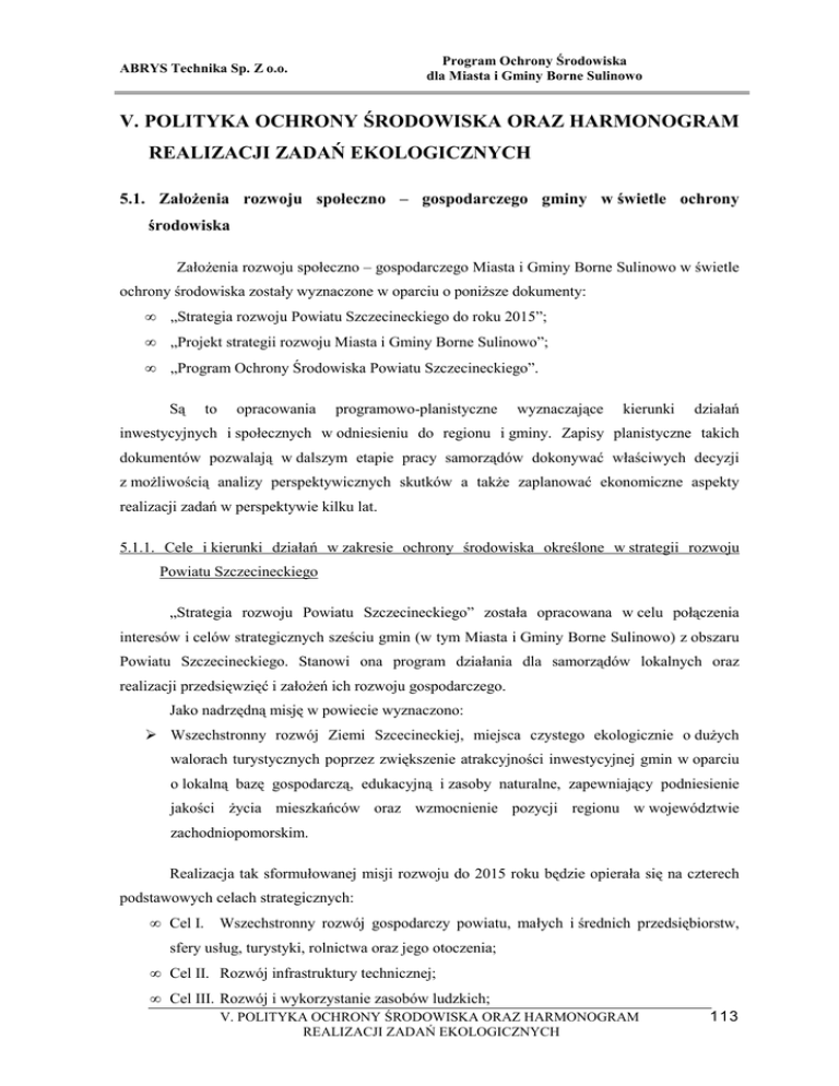 Program Ochrony Środowiska dla Miasta i Gminy Borne Sulinowo ABRYS Technika Sp. Z o.o. V. POLITYKA OCHRONY ŚRODOWISKA ORAZ HARMONOGRAM REALIZACJI ZADAŃ EKOLOGICZNYCH 5.1. ZałoŜenia rozwoju społeczno – gospodarczego gminy w świetle ochrony środowiska ZałoŜenia rozwoju społeczno – gospodarczego Miasta i Gminy Borne Sulinowo w świetle ochrony środowiska zostały wyznaczone w oparciu o poniŜsze dokumenty: • „Strategia rozwoju Powiatu Szczecineckiego do roku 2015”; • „Projekt strategii rozwoju Miasta i Gminy Borne Sulinowo”; • „Program Ochrony Środowiska Powiatu Szczecineckiego”. Są to opracowania programowo-planistyczne wyznaczające kierunki działań inwestycyjnych i społecznych w odniesieniu do regionu i gminy. Zapisy planistyczne takich dokumentów pozwalają w dalszym etapie pracy samorządów dokonywać właściwych decyzji z moŜliwością analizy perspektywicznych skutków a takŜe zaplanować ekonomiczne aspekty realizacji zadań w perspektywie kilku lat. 5.1.1. Cele i kierunki działań w zakresie ochrony środowiska określone w strategii rozwoju Powiatu Szczecineckiego „Strategia rozwoju Powiatu Szczecineckiego” została opracowana w celu połączenia interesów i celów strategicznych sześciu gmin (w tym Miasta i Gminy Borne Sulinowo) z obszaru Powiatu Szczecineckiego. Stanowi ona program działania dla samorządów lokalnych oraz realizacji przedsięwzięć i załoŜeń ich rozwoju gospodarczego. Jako nadrzędną misję w powiecie wyznaczono: Wszechstronny rozwój Ziemi Szcecineckiej, miejsca czystego ekologicznie o duŜych walorach turystycznych poprzez zwiększenie atrakcyjności inwestycyjnej gmin w oparciu o lokalną bazę gospodarczą, edukacyjną i zasoby naturalne, zapewniający podniesienie jakości Ŝycia mieszkańców oraz wzmocnienie pozycji regionu w województwie zachodniopomorskim. Realizacja tak sformułowanej misji rozwoju do 2015 roku będzie opierała się na czterech podstawowych celach strategicznych: • Cel I. Wszechstronny rozwój gospodarczy powiatu, małych i średnich przedsiębiorstw, sfery usług, turystyki, rolnictwa oraz jego otoczenia; • Cel II. Rozwój infrastruktury technicznej; • Cel III. Rozwój i wykorzystanie zasobów ludzkich; V. POLITYKA OCHRONY ŚRODOWISKA ORAZ HARMONOGRAM REALIZACJI ZADAŃ EKOLOGICZNYCH 113 ABRYS Technika Sp. Z o.o. Program Ochrony Środowiska dla Miasta i Gminy Borne Sulinowo • Cel IV. Ochrona Środowiska. Do osiągnięcia celów strategicznych prowadzić będą konkretne cele pośrednie i cele operacyjne. NajwaŜniejsze (wybrane) cele pośrednie i cele operacyjne związane w sposób bezpośredni lub pośredni z ochroną środowiska i zrównowaŜonym rozwojem regionu przedstawiono w poniŜszej tabeli: Cele pośrednie i operacyjne wynikające ze „Strategii rozwoju Powiatu Szczecineckiego” CELE POŚREDNIE T a b e l a 25 CELE OPERACYJNE Stymulowanie przedsiębiorczości, nowoczesności o tworzenie mechanizmów i struktur sprzyjających i innowacyjności gospodarki lokalnej działalności innowacyjnej. Dostosowanie kierunków rozwoju powiatu do zmian o wspieranie rozwoju rolnictwa ekologicznego, o zagospodarowanie gruntów nieprzydatnych zachodzących w rolnictwie rolniczo Stworzenie systemu promocji powiatu o integracja działań promocyjnych powiatu i gmin z uwzględnieniem specyfiki poszczególnych gmin powiatu szczecineckiego Rozwój sieci wodno-kanalizacyjnej wraz o stworzenie efektywnego systemu zaopatrzenia z oczyszczalniami ścieków w wodę poprzez budowę nowych i modernizację istniejących ujęć wody, stacji uzdatniania, magistrali przesyłowych i spinanie ich w sieć, o osiągnięcie wysokiego stopnia oczyszczania ścieków poprzez budowę nowych i modernizację istniejących oczyszczalni oraz rozbudowę sieci kanalizacyjnej Realizacja kompleksowego programu zabezpieczenia o działania na rzecz tworzenia proekologicznych energetycznego powiatu poprzez rozwój źródeł energii gazownictwa, energetyki i ciepłownictwa Tworzenie warunków dla rozwoju kultury, sportu o rozwój turystyki w ścisłej korelacji z ochroną turystyki i wypoczynku środowiska, o kształtowanie postaw proturystycznych oraz upowszechnianie wiedzy krajoznawczej o regionie wśród dzieci i młodzieŜy, o stworzenie spójnego programu rozwoju turystyki w Powiecie Szczecineckim Działania z zakresu ochrony środowiska z uwagi na ich podstawowe znaczenie dla rozwoju powiatu znalazły się jako odrębny cel strategiczny w strategii rozwoju. Ochrona Środowiska ze względu na swoje ponadlokalne znaczenie wymaga zbieŜności poglądów i działań na szczeblu regionalnym i lokalnym. Wymusza ona potrzebę ukierunkowania praktycznie wszystkich sfer Ŝycia i działalności na zrównowaŜony rozwój. Cele pośrednie i operacyjne w zakresie ochrony środowiska kształtują się następująco: Cele pośrednie i operacyjne wynikające ze „Strategii rozwoju Powiatu Szczecineckiego” związane bezpośrednio z ochroną środowiska T a b e l a 26 CELE POŚREDNIE CELE OPERACYJNE Kompleksowe rozwiązanie problemu zagospodarowania odpadów 114 o inwentaryzacja stanu środowiska i istniejącej gospodarki odpadami niebezpiecznymi i innymi niŜ niebezpieczne, o rozwiązanie problemu gospodarki odpadami z uwzględnieniem odpadów niebezpiecznych V. POLITYKA OCHRONY ŚRODOWISKA ORAZ HARMONOGRAM REALIZACJI ZADAŃ EKOLOGICZNYCH ABRYS Technika Sp. Z o.o. Program Ochrony Środowiska dla Miasta i Gminy Borne Sulinowo o Ochrona gleb, powietrza oraz wód powierzchniowych i podziemnych o o o o Działania na rzecz zachowania walorów przyrodniczo-krajobrazowych, dziedzictwa kulturowego oraz świata roślinnego i zwierzęcego o o o Ochrona środowiska przed hałąsem, wibracjami o i promieniowaniem niejonizującym w oparciu o istniejącą infrastrukturę oraz nowe dostępne technologie, propagowanie inicjatyw umoŜliwiających segregację odpadów w miejscu ich powstawania oraz programów minimalizacji powstających o