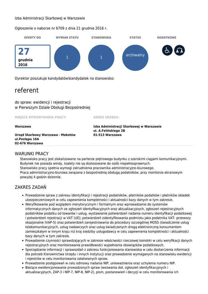 Izba Administracji Skarbowej w Warszawie Ogłoszenie o naborze nr 6709 z dnia 21 grudnia 2016 r. OFERTY DO 27 grudnia 2016 WYMIAR ETATU STANOWISKA 1 1 STATUS DODATKOWE archiwalny Dyrektor poszukuje kandydatów\kandydatek na stanowisko: referent do spraw: ewidencji i rejestracji w Pierwszym Dziale Obsługi Bezpośredniej MIEJSCE WYKONYWANIA PRACY: ADRES URZĘDU: Warszawa Izba Administracji Skarbowej w Warszawie ul. A.Felińskiego 2B 01-513 Warszawa Urząd Skarbowy Warszawa - Mokotów ul.Postępu 16A 02-676 Warszawa WARUNKI PRACY Stanowisko pracy jest zlokalizowane na parterze piętrowego budynku z szerokimi ciągami komunikacyjnymi. Budynek nie posiada windy, toalety nie są dostosowane do osób niepełnosprawnych. Stanowisko pracy spełnia wymogi zatrudnienia pracownika administracyjno-biurowego. Praca administracyjno-biurowa związana z bezpośrednią obsługą podatników, przy monitorze ekranowym powyżej 4 godzin dziennie. ZAKRES ZADAŃ Prowadzenie spraw z zakresu identyfikacji i rejestracji podatników, płatników podatków i płatników składek ubezpieczeniowych w celu zapewnienia kompletności i aktualności bazy danych w tym zakresie. Weryfikowanie pod względem merytorycznym i formalnym oraz wprowadzanie do systemów informatycznych danych ze zgłoszeń identyfikacyjnych oraz aktualizacyjnych, zgłoszeń rejestracyjnych podatników podatku od towarów i usług, wystawianie potwierdzeń nadania numeru identyfikacji podatkowej i potwierdzeń rejestracji w VAT (UE); potwierdzeń zidentyfikowania podmiotu jako podatnika VAT- przewozy okazjonalne (VAP-5) oraz potwierdzeń zarejestrowania do procedury szczególnej MOSS (świadczenie usług telekomunikacyjnych, usług nadawczych oraz usług świadczonych drogą elektroniczną konsumentom zamieszkałym w innym kraju niż kraj siedziby usługodawcy w celu zapewnienia kompletności i aktualności bazy danych w tym zakresie. Prowadzenie czynności sprawdzających w zakresie właściwości rzeczowej komórki w celu weryfikacji danych rejestracyjnych oraz monitorowania prawidłowości wypełniania obowiązków podatkowych. Sporządzanie informacji i sprawozdań z zakresu funkcjonowania stanowiska w celu dostarczenia informacji dla potrzeb Kierownictwa Urzędu i innych instytucji oraz prowadzenie wymaganych na stanowisku ewidencji i rejestrów w celu monitorowania załatwianych spraw. Prowadzenie postępowań w celu odmowy nadania NIP, unieważnienia oraz uchylenia numeru NIP. Bieżące ewidencjonowanie prowadzonych spraw (wezwania dot. zgłoszeń identyfikacyjnych i aktualizacyjnych, ZAP-3 i NIP-7, NIP-8, NIP-2), pism, postanowień i decyzji w celu monitorowania ich załatwienia. Ewidencjonowanie danych w Centralnym Rejestrze Podmiotów Krajowej Ewidencji Podatników (CRP KEP) w celu zapewnienia kompletności i aktualności bazy danych w tym zakresie. Wykreślanie podatników z rejestru podatników VAT i VAT-UE w celu zapewnienia kompletności i aktualności bazy danych w tym zakresie. WYMAGANIA NIEZBĘDNE Wykształcenie: średnie Komunikatywność, umiejętność analitycznego myślenia Dobra znajomość obsługi komputera (edytor tekstu, arkusz kalkulacyjny) Podstawowa znajomość przepisów prawa podatkowego, procesowego i materialnego oraz podstaw ustawy o służbie cywilnej Posiadanie obywatelstwa polskiego Korzystanie z pełni praw publicznych Nieskazanie prawomocnym wyrokiem za umyślne przestępstwo lub umyślne przestępstwo skarbowe WYMAGANIA DODATKOWE Wykształcenie: wyższe DOKUMENTY I OŚWIADCZENIA NIEZBĘDNE Życiorys/CV i list motywacyjny Kopie dokumentów potwierdzających spełnienie wymagania niezbędnego w zakresie wykształcenia Oświadczenie o posiadaniu obywatelstwa polskiego albo kopia dokumentu potwierdzającego posiadanie polskiego obywatelstwa Oświadczenie o wyrażeniu zgody na przetwarzanie danych osobowych do celów naboru Oświadczenie o korzystaniu z pełni praw publicznych Oświadczenie o nieskazaniu prawomocnym wyrokiem za umyślne przestępstwo lub umyślne przestępstwo skarbowe DOKUMENTY I OŚWIADCZENIA DODATKOWE kopia dokumentu potwierdzającego niepełnosprawność - w przypadku kandydatek/kandydatów, zamierzających skorzystać z pierwszeństwa w zatrudnieniu w przypadku, gdy znajdą się w gronie najlepszych kandydatek/kandydatów Kopie dokumentów potwierdzających spełnienie wymagania dodatkowego w zakresie wykształcenia TERMINY I MIEJSCE SKŁADANIA DOKUMENTÓW Dokumenty należy złożyć do: 27 grudnia 2016 r. Decyduje data: stempla pocztowego / osobistego dostarczenia oferty do urzędu Miejsce składania dokumentów: Izba Administracji Skarbowej w Warszawie ul. A.Felińskiego 2B 01-513 Warszawa z dopiskiem: US W-wa Mokotów, nr ogł. 6709 INNE INFORMACJE: W miesiącu poprzedzającym datę upublicznienia ogłoszenia wskaźnik zatrudnienia osób niepełnosprawnych w urzędzie, w rozumieniu przepisów o rehabilitacji zawodowej i społecznej oraz zatrudnianiu osób niepełnosprawnych, nie wynosi co najmniej 6%. Nasz urząd jest pracodawcą równych szans i wszystkie aplikacje są rozważane z równą uwagą bez względu na płeć, wiek, niepełnosprawność, rasę, narodowość, przekonania polityczne, przynależność związkową, pochodzenie etniczne, wyznanie, orientację seksualną czy też jakąkolwiek inną cechę prawnie chronioną. Zachęcamy osoby niepełnosprawne do składania ofert. UMOWA NA ZASTĘPSTWO. Prosimy o zaznaczanie na przesyłanych dokumentach numeru ogłoszenia na jakie składana jest oferta. Oferty niekompletne oraz nadane po terminie nie będą rozpatrywane /decyduje data stempla pocztowego/. ŻYCIORYS/CV, LIST MOTYWACYJNY POWINNY ZAWIERAĆ ORYGINALNY PODPIS KANDYDATA. WSZYSTKIE SKŁADANE OŚWIADCZENIA POWINNY BYĆ OPATRZONE BIEŻĄCĄ DATĄ ORAZ ZAWIERAĆ ORYGINALNY PODPIS KANDYDATA. W przypadku przedstawienia dokumentów w języku obcym należy dołączyć również ich tłumaczenie na język polski dokonane przez tłumacza przysięgłego. Oferty odrzucone zostaną komis