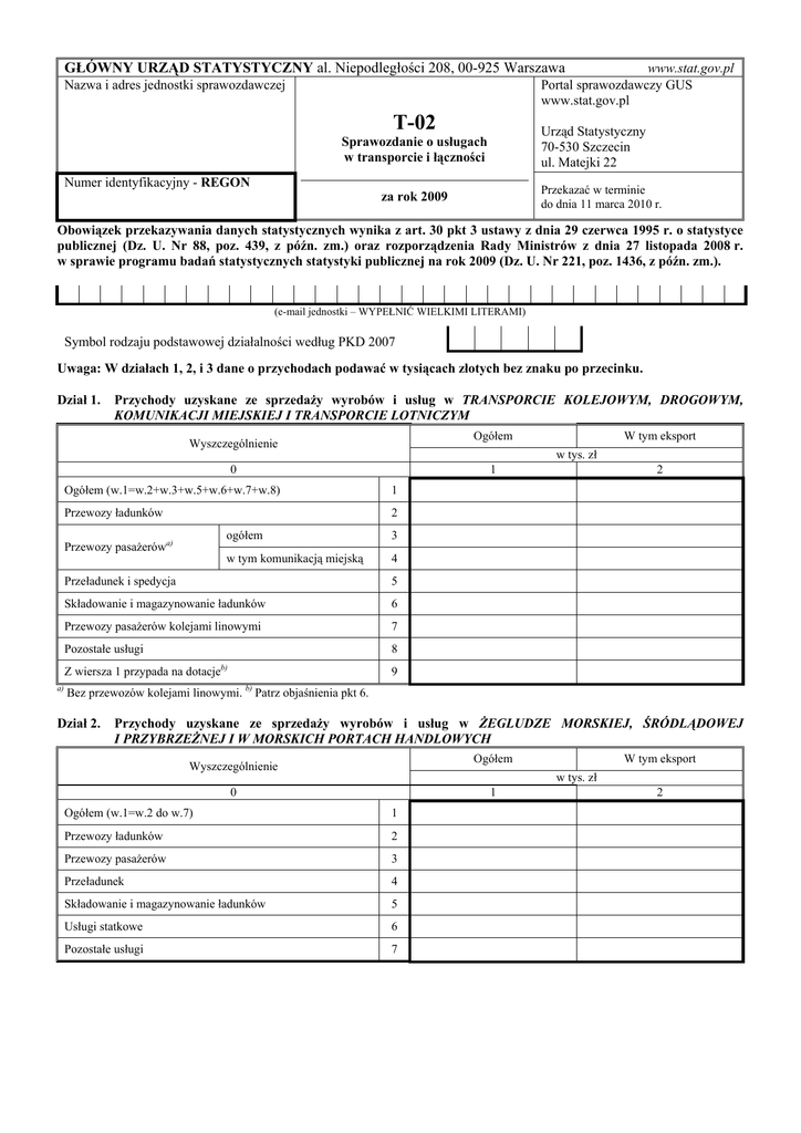 GŁÓWNY URZĄD STATYSTYCZNY al. Niepodległości 208, 00-925 Warszawa www.stat.gov.pl Portal sprawozdawczy GUS www.stat.gov.pl Nazwa i adres jednostki sprawozdawczej T-02 Urząd Statystyczny 70-530 Szczecin ul. Matejki 22 Sprawozdanie o usługach w transporcie i łączności Numer identyfikacyjny - REGON Przekazać w terminie do dnia 11 marca 2010 r. za rok 2009 Obowiązek przekazywania danych statystycznych wynika z art. 30 pkt 3 ustawy z dnia 29 czerwca 1995 r. o statystyce publicznej (Dz. U. Nr 88, poz. 439, z późn. zm.) oraz rozporządzenia Rady Ministrów z dnia 27 listopada 2008 r. w sprawie programu badań statystycznych statystyki publicznej na rok 2009 (Dz. U. Nr 221, poz. 1436, z późn. zm.). (e-mail jednostki – WYPEŁNIĆ WIELKIMI LITERAMI) Symbol rodzaju podstawowej działalności według PKD 2007 Uwaga: W działach 1, 2, i 3 dane o przychodach podawać w tysiącach złotych bez znaku po przecinku. Dział 1. Przychody uzyskane ze sprzedaży wyrobów i usług w TRANSPORCIE KOLEJOWYM, DROGOWYM, KOMUNIKACJI MIEJSKIEJ I TRANSPORCIE LOTNICZYM Ogółem Wyszczególnienie w tys. zł 0 1 Ogółem (w.1=w.2+w.3+w.5+w.6+w.7+w.8) 1 Przewozy ładunków 2 Przewozy pasażerówa) ogółem 3 w tym komunikacją miejską 4 Przeładunek i spedycja 5 Składowanie i magazynowanie ładunków 6 Przewozy pasażerów kolejami linowymi 7 Pozostałe usługi 8 b) Z wiersza 1 przypada na dotacje a) 2 9 Bez przewozów kolejami linowymi. Dział 2. W tym eksport b) Patrz objaśnienia pkt 6. Przychody uzyskane ze sprzedaży wyrobów i usług w ŻEGLUDZE MORSKIEJ, ŚRÓDLĄDOWEJ I PRZYBRZEŻNEJ I W MORSKICH PORTACH HANDLOWYCH Ogółem Wyszczególnienie W tym eksport w tys. zł 0 1 Ogółem (w.1=w.2 do w.7) 1 Przewozy ładunków 2 Przewozy pasażerów 3 Przeładunek 4 Składowanie i magazynowanie ładunków 5 Usługi statkowe 6 Pozostałe usługi 7 2 Dział 3. Przychody uzyskane ze sprzedaży wyrobów i usług w JEDNOSTKACH ŁĄCZNOŚCI Ogółem Wyszczególnienie 0 1 Ogółem (w.1=w.2+w.3+w.4+w.5+w.6+w.8+w.9+w.10) 1 Usługi pocztowea) (łącznie z kurierskimib)) 2 Usługi telefonii stacjonarnej 3 Usługi transmisji telewizyjnej i radiofonicznej 4 Usługi transmisji danych i poczty elektronicznej Usługi telefonii ruchomej (telefonia komórkowa) W tym eksport w tys. zł 2 5 ogółem 6 w tym roaming 7 Usługi radiokomunikacyjne 8 Usługi transportowe (łącznie z kurierskimic)) 9 Pozostałe usługi 10 Łącznie z przesyłkami ekspresowymi (o wartości dodanej). b) Realizowane na podstawie przepisów prawa pocztowego. c) Bez usług świadczonych na podstawie przepisów prawa pocztowego. a) (e-mail osoby sporządzającej sprawozdanie – WYPEŁNIĆ WIELKIMI LITERAMI) (imię, nazwisko i telefon osoby sporządzającej sprawozdanie) (miejscowość, data) (pieczątka imienna i podpis osoby działającej w imieniu sprawozdawcy) Objaśnienia do formularza T-02 Uwaga: W e-mailu każdy znak powinien zostać wpisany w odrębnej kratce. Przykład wypełnienia e-maila: Z E N O N . K O W A L S K I @ X X X . Y Y Y . P L 1. W działach: 1, 2, 3 w wierszu 1 należy wykazać przychody netto (na które są wystawione faktury odbiorcom) ze sprzedaży w kraju i na eksport wytworzonych przez jednostkę usług, wyrobów gotowych oraz półfabrykatów, a także usług obcych, łącznie z produktami. Przychody netto ze sprzedaży produktów obejmują należne, bez podatku od towarów i usług, kwoty za sprzedane usługi i towary (niezależnie od tego, czy zostały zapłacone), skorygowane o należne dopłaty i udzielone rabaty lub bonifikaty. Dla jednostek zobowiązanych do sporządzania sprawozdania F-01/I-01 dane wykazywane w wierszach 1 sprawozdania T-02 powinny być zgodne z wierszem 02 sprawozdania F-01/I-01 za rok. Uwaga: w rubryce 2 należy wykazać przychody z tytułu usług świadczonych kontrahentom zagranicznym na terenie Rzeczypospolitej Polskiej lub poza granicami kraju. 2. W działach: 1 i 2 w wierszach: 2 i 3 należy wykazać przychody z tytułu dokonanych przewozów ładunków (w. 2) i przewozów pasażerów (w. 3) zarówno w komunikacji krajowej, jak i międzynarodowej. Jednostki transportu lotniczego (dz. 1) wykazują przychody za przewozy ładunków, poczty i bagażu (w. 2) oraz pasażerów (w. 3) na liniach krajowych i zagranicznych dla lotów rozkładowych, dodatkowych i wynajętych. 3. W dziale 1 w wierszu 4 należy wykazać przychody uzyskane z tytułu przewozów pasażerów komunikacją miejską (przewozami regularnymi wykonywanymi w ramach lokalnego transportu zbiorowego w granicach administracyjnych miasta albo miasta i gminy lub w granicach administracyjnych sąsiadujących miast albo miast i gmin – jeśli zawarły porozumienie lub utworzyły związek międzygminny w sprawie wspólnej realizacji komunikacji na swoim obszarze). 4. W dziale 1 w wierszu 5 należy wykazać przychody z tytułu załadunku, rozładunku i przeładunku towarów i bagażu pasażerów oraz spedycji (działalność zarobkowa polegająca na organizowaniu przesyłania towarów i wykonywaniu czynności związanych z nadaniem lub odbiorem przesyłek). 5. W dziale 1 w wierszu 7 należy wykazać przewozy kolejami linowymi, tj. koleją, której pojazdy są ciągnione przez linę napędową (np. linowe kolejki naziemne, wyciągi narciarskie). 6. W dziale 1 w wierszu 9 wykazuje się otrzymane i należne dotacje z budżetu państwa i jednostek samorządu terytorialnego zwiększające przychód jednostki, a przeznaczone na częściowe pokrycie kosztów sprzedaży wyrobów i usług, które realizowane są po cenach niższych niż poniesione koszty. 7. W dziale 2 w wierszu 6 należy wykazać przychody uzyskane za usługi statkowe obejmujące usługi: holowania, pchania, cumowania. 8. W dziale 3 w wierszu 2 należy wykazać przychody za wykonywane w obrocie krajowym lub zagranicznym czynności: przyjmowania, przemieszczania i doręczania przesyłek oraz druków bezadresowych, a także przesyłek ekspresowych (o wartości dodanej), prowadzenie pun