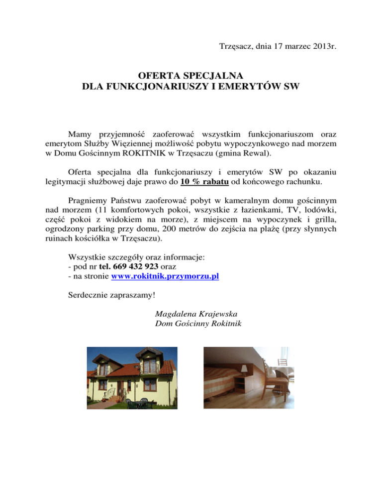 Trzęsacz, dnia 17 marzec 2013r. OFERTA SPECJALNA DLA FUNKCJONARIUSZY I EMERYTÓW SW Mamy przyjemność zaoferować wszystkim funkcjonariuszom oraz emerytom Służby Więziennej możliwość pobytu wypoczynkowego nad morzem w Domu Gościnnym ROKITNIK w Trzęsaczu (gmina Rewal). Oferta specjalna dla funkcjonariuszy i emerytów SW po okazaniu legitymacji służbowej daje prawo do 10 % rabatu od końcowego rachunku. Pragniemy Państwu zaoferować pobyt w kameralnym domu gościnnym nad morzem (11 komfortowych pokoi, wszystkie z łazienkami, TV, lodówki, część pokoi z widokiem na morze), z miejscem na wypoczynek i grilla, ogrodzony parking przy domu, 200 metrów do zejścia na plażę (przy słynnych ruinach kościółka w Trzęsaczu). Wszystkie szczegóły oraz informacje: - pod nr tel. 669 432 923 oraz - na stronie www.rokitnik.przymorzu.pl Serdecznie zapraszamy! Magdalena Krajewska Dom Gościnny Rokitnik