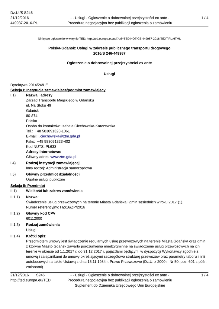 Dz.U./S S246 21/12/2016 449987-2016-PL - - Usługi - Ogłoszenie o dobrowolnej przejrzystości ex ante Procedura negocjacyjna bez publikacji ogłoszenia o zamówieniu 1/4 Niniejsze ogłoszenie w witrynie TED: http://ted.europa.eu/udl?uri=TED:NOTICE:449987-2016:TEXT:PL:HTML Polska-Gdańsk: Usługi w zakresie publicznego transportu drogowego 2016/S 246-449987 Ogłoszenie o dobrowolnej przejrzystości ex ante Usługi Dyrektywa 2014/24/UE Sekcja I: Instytucja zamawiająca/podmiot zamawiający I.1) Nazwa i adresy Zarząd Transportu Miejskiego w Gdańsku ul. Na Stoku 49 Gdańsk 80-874 Polska Osoba do kontaktów: Izabela Ciechowska-Karczewska Tel.: +48 583091323-1061 E-mail: [email protected] Faks: +48 583091323-402 Kod NUTS: PL633 Adresy internetowe: Główny adres: www.ztm.gda.pl I.4) Rodzaj instytucji zamawiającej Inny rodzaj: Administracja samorządowa I.5) Główny przedmiot działalności Ogólne usługi publiczne Sekcja II: Przedmiot II.1) Wielkość lub zakres zamówienia II.1.1) Nazwa: Świadczenie usług przewozowych na terenie Miasta Gdańska i gmin sąsiednich w roku 2017 (1). Numer referencyjny: HZ/16/ZP/2016 II.1.2) Główny kod CPV 60112000 II.1.3) Rodzaj zamówienia Usługi II.1.4) Krótki opis: Przedmiotem umowy jest świadczenie regularnych usług przewozowych na terenie Miasta Gdańska oraz gmin z którymi Miasto Gdańsk zawarło porozumienia międzygminne na świadczenie usług przewozowych na ich terenie w okresie od 1.1.2017 r. do 31.12.2017 r. pojazdami będącymi w dyspozycji Wykonawcy zgodnie z umową i załącznikami do umowy określającymi szczegółowo strukturę przewozów oraz parametry taboru i linii autobusowych a także Ustawą z dnia 15.11.1984 r. Prawo Przewozowe (Dz.U. z 2000 r. Nr 50, poz. 601 z późn. zmianami). 21/12/2016 S246 http://ted.europa.eu/TED - - Usługi - Ogłoszenie o dobrowolnej przejrzystości ex ante Procedura negocjacyjna bez publikacji ogłoszenia o zamówieniu Suplement do Dziennika Urzędowego Unii Europejskiej 1/4 Dz.U./S S246 21/12/2016 449987-2016-PL - - Usługi - Ogłoszenie o dobrowolnej przejrzystości ex ante Procedura negocjacyjna bez publikacji ogłoszenia o zamówieniu 2/4 II.1.6) Informacje o częściach To zamówienie podzielone jest na części: nie II.1.7) Całkowita wartość zamówienia (bez VAT) Wartość bez VAT: 8 417 280.00 PLN II.2) Opis II.2.1) Nazwa: II.2.2) Dodatkowy kod lub kody CPV II.2.3) Miejsce świadczenia usług Kod NUTS: PL63 Główne miejsce lub lokalizacja realizacji: Usługi będą świadczone na terenie miasta Gdańska i Gmin Ościennych. II.2.4) Opis zamówienia: Przedmiotem umowy jest świadczenie regularnych usług przewozowych na terenie Miasta Gdańska oraz gmin z którymi Miasto Gdańsk zawarło porozumienia międzygminne na świadczenie usług przewozowych na ich terenie w okresie od 1.1.2017 r. do 31.12.2017 r. pojazdami będącymi w dyspozycji Wykonawcy zgodnie z umową i załącznikami do umowy określającymi szczegółowo strukturę przewozów oraz parametry taboru i linii autobusowych a także Ustawą z dnia 15.11.1984 r. Prawo Przewozowe (Dz.U. z 2000 r. Nr 50, poz. 601 z późn. zmianami). II.2.5) Kryteria udzielenia zamówienia Cena II.2.11) Informacje o opcjach Opcje: nie II.2.13) Informacje o funduszach Unii Europejskiej Zamówienie dotyczy projektu/programu finansowanego ze środków Unii Europejskiej: nie II.2.14) Informacje dodatkowe Sekcja IV: Procedura IV.1) Opis IV.1.1) Rodzaj procedury Procedura negocjacyjna bez uprzedniej publikacji • Ze względu na wystąpienie pilnej konieczności spowodowanej wydarzeniami, których instytucja zamawiająca nie mogła przewidzieć, oraz zgodnie z warunkami ściśle określonymi w dyrektywie Wyjaśnienie: Mając na uwadze zbliżający się termin zakończenia obecnie obowiązujących umów na świadczenie usług przewozowych (31.12.2016 r.) z przedsiębiorstwem PKS Gdańsk Sp. z o.o., Zamawiający zobowiązany jest zapewnić odpowiednią liczbę pojazdów do ruchu pozwalających na utrzymanie obecnie zaplanowanej oferty przewozowej. Zamawiający zamierza udzielić zamówienia w trybie z wolnej ręki dotychczasowym wykonawcom wyłącznie na czas niezbędny do rozpoczęcia świadczenia usługi przez wykonawcę wyłonionego w trybie przetargu nieograniczonego. Należy podkreślić, że dla zapewnienia prawidłowej obsługi komunikacyjnej niezbędne jest co najmniej zachowanie dotychczasowej liczby autobusów. Jednocześnie należy wskazać, że brak podpisania przedmiotowej umowy w wyniku zamówienia z „wolnej ręki”, a w konsekwencji brak zapewnienia przez ZTM Gdańsk odpowiedniej ilości pojazdów do obsługi komunikacji miejskiej od dnia 1.01.2017 r., będzie skutkował paraliżem komunikacji i sposób znaczący utrudni przemieszczanie się mieszkańców miasta Gdańska oraz gmin ościennych. 21/12/2016 S246 http://ted.europa.eu/TED - - Usługi - Ogłoszenie o dobrowolnej przejrzystości ex ante Procedura negocjacyjna bez publikacji ogłoszenia o zamówieniu Suplement do Dziennika Urzędowego Unii Europejskiej 2/4 Dz.U./S S246 21/12/2016 449987-2016-PL - - Usługi - Ogłoszenie o dobrowolnej przejrzystości ex ante Procedura negocjacyjna bez publikacji ogłoszenia o zamówieniu IV.1.3) Informacje na temat umowy ramowej IV.1.8) Informacje na temat Porozumienia w sprawie zamówień rządowych (GPA) Zamówienie jest objęte Porozumieniem w sprawie zamówień rządowych: nie IV.2) Informacje administracyjne IV.2.1) Poprzednia publikacja dotycząca przedmiotowego postępowania 3/4 Sekcja V: Udzielenie zamówienia/koncesji V.2) Udzielenie zamówienia/koncesji V.2.1) Data zawarcia umowy/decyzji o udzieleniu koncesji: 16/12/2016 V.2.2) Informacje o ofertach Zamówienie zostało udzielone grupie wykonawców: nie V.2.3) Nazwa i adres wykonawcy/koncesjonariusza Przedsiębiorstwo Komunikacji Samochodowej Gdańsk Sp. z o.o. ul. 3 Maja 12 Gdańsk 80-802 Polska Tel.: +48 583238100 Faks: +48 583238179 Kod NUTS: PL63 Wykonawcą/koncesjonariuszem będzi