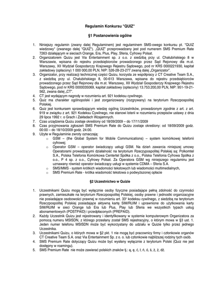 Regulamin Konkursu "QUIZ" §1 Postanowienia ogólne 1. Niniejszy regulamin (zwany dalej Regulaminem) jest regulaminem SMS-owego konkursu pt. "QUIZ wiedzowy" (zwanego dalej "QUIZ"). „QUIZ” przeprowadzany jest pod numerem SMS Premium Rate 7263 działającym w sieciach Orange, Era, Plus, Play, Sferia, Cyfrowy Polsat. 2. Organizatorem Quizu jest Via Entertainment sp. z o.o. z siedzibą przy ul. Chałubińskiego 8 w Warszawie, wpisana do rejestru przedsiębiorców prowadzonego przez Sąd Rejonowy dla m.st. Warszawy, XII Wydział Gospodarczy Krajowego Rejestru Sądowego, pod nr KRS 0000221930, kapitał zakładowy (opłacony) 1 000 000,00 PLN, NIP: 526-28-23-277 zwaną dalej „Organizator”. 3. Organizator, przy realizacji technicznej części Quizu, korzysta ze współpracy z CT Creative Team S.A., z siedzibą przy ul. Chałubińskiego 8, 00-613 Warszawa, wpisana do rejestru przedsiębiorców prowadzonego przez Sąd Rejonowy dla m.st. Warszawy, XII Wydział Gospodarczy Krajowego Rejestru Sądowego, pod nr KRS 0000035069, kapitał zakładowy (opłacony) 13.753.200,00 PLN, NIP: 951-19-21562, zwana dalej „CT”. 4. CT jest wydającym nagrody w rozumieniu art. 921 kodeksu cywilnego. 5. Quiz ma charakter ogólnopolski i jest zorganizowany (rozgrywany) na terytorium Rzeczpospolitej Polskiej. 6. Quiz jest konkursem sprawdzającym wiedzę ogólną Uczestników, prowadzonym zgodnie z art. z art. 919 w związku z art. 921 Kodeksu Cywilnego, nie stanowi loterii w rozumieniu przepisów ustawy z dnia 29 lipca 1992 r. o Grach i Zakładach Wzajemnych. 7. Czas urządzenia Quizu zostaje określony od 18/09/2009 – do 17/11/2009 8. Czas przyjmowania zgłoszeń SMS Premium Rate do Quizu zostaje określony: od 18/09/2009 godz. 00:00 – do 18/10/2009 godz. 24:00. 9. UŜyte w Regulaminie zwroty oznaczają: o GSM – (the Global System for Mobile Communications) – system komórkowej telefonii cyfrowej; o Operator GSM – operator świadczący usługi GSM. Na dzień zawarcia niniejszej umowy Operatorami prowadzącymi działalność na terytorium Rzeczypospolitej Polskiej są: Polkomtel S.A., Polska Telefonia Komórkowa Centertel Spółka z o.o., Polska Telefonia Cyfrowa Spółka z o.o., P 4 sp. z o.o., Cyfrowy Polsat. Za Operatora GSM wg niniejszego regulaminu jest uznawany równieŜ operator świadczący usługi w systemie CDMA – Sferia S.A. o SMS/MMS - system krótkich wiadomości tekstowych lub wiadomości multimedialnych, o SMS Premium Rate - krótka wiadomość tekstowa o podwyŜszonej opłacie §2 Uczestnictwo w Quizie 1. Uczestnikami Quizu mogą być wyłącznie osoby fizyczne posiadające pełną zdolność do czynności prawnych, zamieszkałe na terytorium Rzeczpospolitej Polskiej, osoby prawne i jednostki organizacyjne nie posiadające osobowości prawnej w rozumieniu art. 33¹ kodeksu cywilnego, z siedzibą na terytorium Rzeczpospolitej Polskiej posiadające aktywną kartę SIM/RUIM i uprawnione do uŜytkowania karty SIM/RUIM w sieci Orange lub Era lub Plus, Play lub Sferia we wszystkich typach usług abonamentowych (POSTPAID) i przedpłaconych (PREPAID). 2. KaŜdy Uczestnik Quizu jest rejestrowany i identyfikowany w systemie komputerowym Organizatora za pomocą numeru MSISDN, z którego przesłany został SMS rejestracyjny, o którym mowa w §3 ust. 1. Jeden numer telefonu MSISDN moŜe być wykorzystany do udziału w Quizie tylko przez jednego Uczestnika. 3. Uczestnikami Quizu, o których mowa w §2 pkt. 1 nie mogą być pracownicy firmy i członkowie organów CT Creative Team S.A. oraz Via Entertainment Sp. z o. o. lub członkowie najbliŜszej rodziny tych osób. 4. SMS Premium Rate dotyczący Quizu moŜe być wysłany wyłącznie z terytorium Polski (Quiz nie jest dostępny w roamingu). 5. SMS Premium Rate nie moŜe zawierać polskich znaków tj.: ą, ę, ć, ł, ń, ó, ś, Ŝ, ź, dź. 6. Organizator ma prawo w kaŜdym momencie trwania Quizu wykluczyć z udziału w konkursie, jak równieŜ odmówić przyznania nagrody, tym Uczestnikom, w stosunku do których Organizator powziął podejrzenie o działania sprzeczne z Regulaminem. Uprawnienie to dotyczy w szczególności powzięcia wiedzy o generowaniu tzw. sztucznego ruchu, korzystaniu ze sprzętu komputerowego przy wysyłaniu wiadomości SMS Premium Rate lub w przypadku pozyskania informacji od Operatorów GSM o tym, Ŝe naleŜności za zgłoszenia SMS Premium Rate do Quizu, uznane zostały przez Operatora GSM za nieściągalne (naleŜności wynikające z wygenerowanego ruchu SMS Premium Rate nie zostały uregulowane). §3 Przystąpienie do Quizu 1. Przystąpienie do Quizu następuje przez wysłanie wyłącznie w okresie trwania przyjmowania zgłoszeń do Quizu tj. od 18/09/2009 godz. 00:00 – do 18/10/2009 godz. 24:00, SMS rejestracyjnego na specjalny numer darmowy 8064 lub na numer Premium Rate 7263 o dowolnej treści lub o treści wskazanej w reklamie konkursu publikowanej między innymi w prasie, internecie lub innych mediach. 2. Organizator po odebraniu od Uczestnika pierwszego SMS-a rejestracyjnego odeśle do Uczestnika komunikat MMS zawierający informacje na temat Quizu wraz z informacją o płatnym numerze SMS Premium Rate 7263, na który naleŜy wysyłać wszystkie odpowiedzi, a takŜe komunikat SMS zawierający pierwsze pytanie konkursowe. Dodatkowo Uczestnik po dokonaniu rejestracji w usłudze Quiz otrzyma od Organizatora informacje na temat produktów WapSter stanowiące element realizacji usługi. Przesłanie SMS rejestracyjnego nie skutkuje przyznaniem punktów w ramach prowadzonego Quizu. 3. W przypadku wysłania SMS Premium Rate na numer 7263 w innym okresie, niŜ wskazany w §1 ust. 7, Organizator odeśle zwrotny komunikat SMS z informacją zawierającą datę przyjmowania zgłoszeń SMS Premium Rate do Quizu. 4. Całkowity koszt jednego SMS, wysłanego na numer Premium Rate 7263, to 2,44 zł brutto (w tym 22% VAT) we wszystkich sieciach Operatorów GSM. Wysłanie SMS na numer 8064 jest bezpłatne. 5. Przez wysłanie S