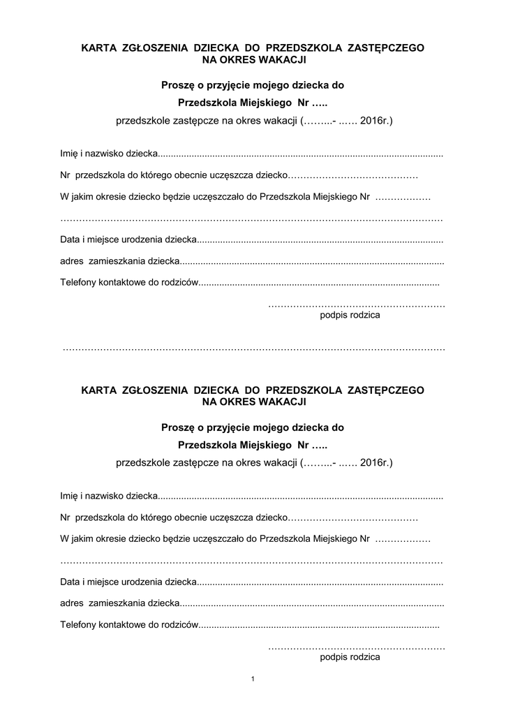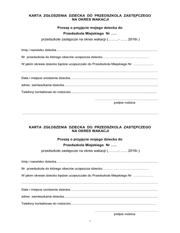 KARTA ZGŁOSZENIA DZIECKA DO PRZEDSZKOLA ZASTĘPCZEGO NA OKRES WAKACJI Proszę o przyjęcie mojego dziecka do Przedszkola Miejskiego Nr ….. przedszkole zastępcze na okres wakacji (……...- ..…. 2016r.) Imię i nazwisko dziecka.............................................................................................................. Nr przedszkola do którego obecnie uczęszcza dziecko…………………………………… W jakim okresie dziecko będzie uczęszczało do Przedszkola Miejskiego Nr ……………… …………………………………………………………………………………………………………… Data i miejsce urodzenia dziecka............................................................................................... adres zamieszkania dziecka...................................................................................................... Telefony kontaktowe do rodziców............................................................................................. ………………………………………………… podpis rodzica …………………………………………………………………………………………………………… KARTA ZGŁOSZENIA DZIECKA DO PRZEDSZKOLA ZASTĘPCZEGO NA OKRES WAKACJI Proszę o przyjęcie mojego dziecka do Przedszkola Miejskiego Nr ….. przedszkole zastępcze na okres wakacji (……...- ..…. 2016r.) Imię i nazwisko dziecka.............................................................................................................. Nr przedszkola do którego obecnie uczęszcza dziecko…………………………………… W jakim okresie dziecko będzie uczęszczało do Przedszkola Miejskiego Nr ……………… …………………………………………………………………………………………………………… Data i miejsce urodzenia dziecka............................................................................................... adres zamieszkania dziecka...................................................................................................... Telefony kontaktowe do rodziców............................................................................................. ………………………………………………… podpis rodzica 1