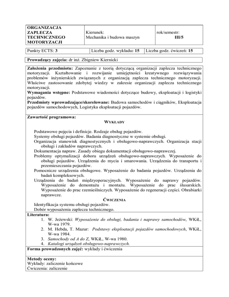 ORGANIZACJA ZAPLECZA TECHNICZNEGO MOTORYZACJI Punkty ECTS: 3 Kierunek: Mechanika i budowa maszyn Liczba godz. wykładu: 15 rok/semestr: III/5 Liczba godz. ćwiczeń: 15 Prowadzący zajęcia: dr inż. Zbigniew Kiernicki Założenia przedmiotu: Zapoznanie z teorią dotyczącą organizacji zaplecza technicznego motoryzacji. Kształtowanie i rozwijanie umiejętności kreatywnego rozwiązywania problemów inżynierskich związanych z organizacją zaplecza technicznego motoryzacji. Właściwe zastosowanie zdobytej wiedzy w zakresie organizacji zaplecza technicznego motoryzacji. Wymagania wstępne: Podstawowe wiadomości dotyczące budowy, eksploatacji i logistyki pojazdów. Przedmioty wprowadzające/skorelowane: Budowa samochodów i ciągników, Eksploatacja pojazdów samochodowych, Logistyka eksploatacji pojazdów. Zawartość programowa: WYKŁADY Podstawowe pojęcia i definicje. Rodzaje obsług pojazdów. Systemy obsługi pojazdów. Badania diagnostyczne w systemie obsługi. Organizacja stanowisk diagnostycznych i obsługowo-naprawczych. Organizacja stacji obsługi i zakładów naprawczych. Dokumentacja napraw. Zasady obiegu dokumentacji obsługowo-naprawczej. Problemy optymalizacji doboru urządzeń obsługowo-naprawczych. Wyposażenie do obsługi pojazdów. Urządzenia do mycia i smarowania. Urządzenia do transportu i przemieszczania pojazdów. Pomocnicze urządzenia obsługowe. Wyposażenie do badania pojazdów. Urządzenia do badań kompleksowych. Urządzenia do badań międzyoperacyjnych. Wyposażenie do naprawy pojazdów. Wyposażenie do demontażu i montażu. Wyposażenie do prac ślusarskich. Wyposażenie do prac rzemieślniczych. Wyposażenie do regeneracji części. Obrabiarki naprawcze. ĆWICZENIA Identyfikacja systemu obsługi pojazdów. Dobór wyposażenia zaplecza technicznego. Literatura: 1. W. Jeżewski: Wyposażenie do obsługi, badania i naprawy samochodów, WKiŁ, W-wa 1979. 2. M. Hebda, T. Mazur: Podstawy eksploatacji pojazdów samochodowych, WKiŁ, W-wa 1984. 3. Samochody od A do Z, WKiŁ, W-wa 1980. 4. Katalogi urządzeń obsługowo-naprawczych. Forma prowadzonych zajęć: wykłady i ćwiczenia Metody oceny: Wykłady: zaliczenie końcowe Ćwiczenia: zaliczenie
