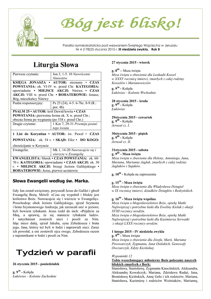 Bóg jest blisko! Parafia rzymskokatolicka pod wezwaniem Świętego Wojciecha w Jeruzalu Nr 4 (178)25 stycznia 2015 r. III niedziela zwykła, Rok B Liturgia Słowa Jon 3, 1-5. 10 Nawrócenie Niniwitów KSIĘGA JONASZA • AUTOR: nieznany • CZAS POWSTANIA: ok. VI-IV w. przed Chr. KATEGORIA: opowiadanie • MIEJSCE AKCJI: Niniwa • CZAS AKCJI: VIII w. przed Chr. • BOHATEROWIE: Jonasz, Bóg, mieszkańcy Niniwy Psalm responsoryjny: Ps 25 (24), 4-5. 6-7bc. 8-9 (R.: por. 4b) PSALM 25 • AUTOR: król Dawid/lewita • CZAS POWSTANIA: pierwotna forma ok. X w. przed Chr.; obecna forma po wygnaniu (po 538 r. przed Chr.) Drugie czytanie: 1 Kor 7, 29-31 Przemija postać tego świata Pierwsze czytanie: 1 List do Koryntian • AUTOR: św. Paweł • CZAS POWSTANIA: ok. 54 r. • SKĄD: Efez • DO KOGO: chrześcijanie w Koryncie Ewangelia: Mk 1, 14-20 Nawracajcie się i wierzcie w Ewangelię EWANGELISTA: Marek • CZAS POWSTANIA: ok. 6070 r. KATEGORIA: opowiadanie • CZAS AKCJI: ok. 30 r. • MIEJSCE AKCJI: brzegi Jeziora Galilejskiego • BOHATEROWIE: Jezus, pierwsi uczniowie Słowa Ewangelii według św. Marka. Gdy Jan został uwięziony, przyszedł Jezus do Galilei i głosił Ewangelię Bożą. Mówił: «Czas się wypełnił i bliskie jest królestwo Boże. Nawracajcie się i wierzcie w Ewangelię». Przechodząc obok Jeziora Galilejskiego, ujrzał Szymona i brata Szymonowego Andrzeja, jak zarzucali sieć w jezioro; byli bowiem rybakami. Jezus rzekł do nich: «Pójdźcie za Mną, a sprawię, że się staniecie rybakami ludzi». I natychmiast zostawili sieci i poszli za Nim. Idąc nieco dalej, ujrzał Jakuba, syna Zebedeusza i brata jego, Jana, którzy też byli w łodzi i naprawiali sieci. Zaraz ich powołał, a oni zostawili ojca swego, Zebedeusza razem z najemnikami w łodzi i poszli za Nim. Tydzień w parafii 26 stycznia 2015 - poniedziałek g. 930 - Kolęda Łukówiec - Kolonie Zachodnie 27 stycznia 2015 - wtorek g. 800 – Msza święta Msza święta o zbawienie dla Leokadii Koszel w XXXV rocznicę śmierci, zmarłych z całej rodziny Koszelów i Marianowiczów g. 930 - Kolęda Łukówiec - Kolonie Wschodnie 28 stycznia 2015 - środa g. 900 - Kolęda Łukówiec 29stycznia 2015 - czwartek g. 900 - Kolęda Jeruzal cz. I. 30stycznia 2015 - piątek g. 900 - Kolęda Jeruzal cz. II. 31stycznia 2015 - sobota g. 900 - Msza święta Msza święta o zbawienie dla Heleny, Antoniego, Jana, Mariana, Marianny Jaglak, zmarłych z całej rodziny Jaglaków i Sujaków. g. 1000 - Kolęda na zaproszenia g. 1530 - Msza święta Msza święta o zbawienie dla Władysława Dziugieł w IX rocznicę śmierci, dziadków Dziugłów i Redzyńskich. g. 1600 - Msza święta wspólna Msza święta o błogosławieństwo Boże, opiekę Matki Najświętszej i potrzebne łaski dla Eweliny Kielak z okazji XVIII rocznicy urodzin. Msza święta o błogosławieństwo Boże, opiekę Matki Najświętszej i potrzebne łaski dla Kazimierza Serwatki z okazji LXXX rocznicy urodzin. 1 lutego 2015 - IV niedziela zwykła g. 900 - Msza święta Msza święta o zbawienie dla Józefa, Marii, Mariana Piwowarczyk, Zygmunta, Jana Osińskich, Genowefy Owczarczyk, Edyty Kicińskiej. Wypominki 12 Tobie wszechmogący miłosierny Boże polecamy naszych bliskich zmarłych z Bork: Stanisława, Stanisławę, Zygmunta Knocińskich, Aleksandra, Aleksandrę Kowalczyk; Mariana, Zdzisława Rudaś, Jana, Bronisławę Kicińskich, Annę Gelo i ich rodziców; Mariana, Stanisława, Kazimierę i rodziców Woźniaków, Mariannę, Mariana, Józefa Piwowarczyków, Janinę, Henryka Kowalczyk, Genowefę Owczarczyk, dziadków i babcie; Halinę, Mariana, Andrzeja Gałązków, Bogusławę Tomczak, dziadków i babcie; Mariannę, Józefa, Helenę Żera, Mariannę, Józefa, Elżbietę, Edytę Kicińskich; Władysławę, Janinę, Mariana, Jana Kiełbasów, Edwarda, Jacka, Zofię, Jana Sujaków, dziadków i babcie; Kazimierza, Zofię, Jana, Kazimierza Sadowskich, Zofię, Mariana Karpińskich, dziadków i babcie; Kazimierza Kowalczyk i jego rodziców, Henryka Proczka i jego rodziców oraz dziadków Kowalczyków, Kicińskich i Proczków; Janinę, Józefa Żera, zmarłych z całej rodziny Kowalczyków i Żerów. abyś ich wszystkich do swego królestwa przyjąć raczył Ciebie prosimy. Adoracja Najświętszego Sakramentu Koronka do Miłosierdzia Bożego Czytanie Pisma Świętego Adoracja indywidualna Błogosławieństwo g. 1115 - Msza święta. Msza święta popogrzebowa - o zbawienie dla Stanisławy Tkaczyk - o zbawienie dla Mieczysława Żytkowicza. - o zbawienie dla Aleksandra Osińskiego. - o zbawienie dla Stefanii Miszkiewicz - o zbawienie dla Władysławy Włodarczyk - o zbawienie dla Jana Noceń - o zbawienie dla Janiny Mućko - o zbawienie dla Aliny Miszkiewicz - o zbawienie dla Kazimiery Koszel Wypominki 13 Tobie wszechmogący miłosierny Boże polecamy naszych bliskich zmarłych: Adama, Benedykta, Mieczysława Onufrzak, Mariana, Janinę Puchalskich, Jana Grądzkiego; Józefa, Jerzego, Mieczysława, Władysławę, Jana Podstawków; Zofię, Romana Sopińskich, Wandę, Stanisława Polak, Edwarda Branickiego, Marcela Brym; Kazimierza, Jana, Franciszkę Duczek Mariana Mariannę Niewiadomskich, Dariusza Piotrkowicza, Zygmunta Knora; abyś ich wszystkich do swego królestwa przyjąć raczył Ciebie prosimy. g. 1400 - Msza święta w Toporze Wypominki 14 Tobie wszechmogący miłosierny Boże polecamy naszych bliskich zmarłych z Topora: Karola, Kazimierę, Bronisława Kąców, Kazimierę, Stefana Tkaczyków; Tadeusza Szulca, Annę Franciszka Noskiewiczów; Stanisławę, Bolesława, Kazimierę, Jana, Walerię Tkaczyk; Stanisława, Jerzego, Stefanię Miśkiewicz, Józefa, Mariannę Kąca; Ignacego, Katarzynę, Aleksandrę Kielak, Wiktora, Wiktorię Tkaczyk, Bolesława, Stefanię Kozioł; Adolfa, Mariannę Kuśpiet, Tadeusza, Bożenę Sęktas, Adolfa Kuśpiet; Kazimierę, Jana, Tomasza Kowalczyk, dziadków Kowalczyków; Stanisławę, Józefa, Jacka Abramowskich, Ryszarda Kr