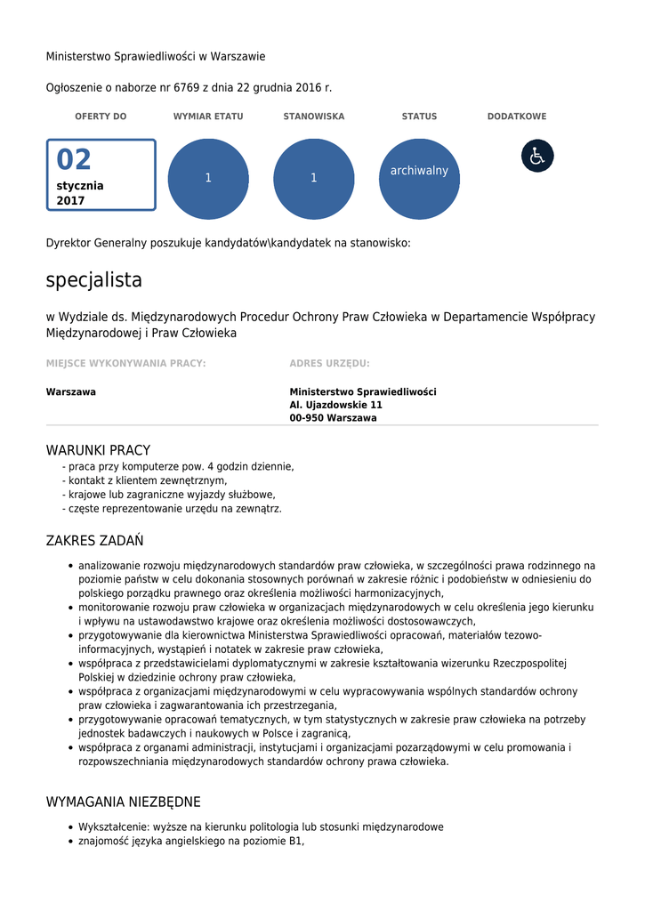 Ministerstwo Sprawiedliwości w Warszawie Ogłoszenie o naborze nr 6769 z dnia 22 grudnia 2016 r. OFERTY DO WYMIAR ETATU STANOWISKA 1 1 02 stycznia 2017 STATUS DODATKOWE archiwalny Dyrektor Generalny poszukuje kandydatów\kandydatek na stanowisko: specjalista w Wydziale ds. Międzynarodowych Procedur Ochrony Praw Człowieka w Departamencie Współpracy Międzynarodowej i Praw Człowieka MIEJSCE WYKONYWANIA PRACY: ADRES URZĘDU: Warszawa Ministerstwo Sprawiedliwości Al. Ujazdowskie 11 00-950 Warszawa WARUNKI PRACY - praca przy komputerze pow. 4 godzin dziennie, - kontakt z klientem zewnętrznym, - krajowe lub zagraniczne wyjazdy służbowe, - częste reprezentowanie urzędu na zewnątrz. ZAKRES ZADAŃ analizowanie rozwoju międzynarodowych standardów praw człowieka, w szczególności prawa rodzinnego na poziomie państw w celu dokonania stosownych porównań w zakresie różnic i podobieństw w odniesieniu do polskiego porządku prawnego oraz określenia możliwości harmonizacyjnych, monitorowanie rozwoju praw człowieka w organizacjach międzynarodowych w celu określenia jego kierunku i wpływu na ustawodawstwo krajowe oraz określenia możliwości dostosowawczych, przygotowywanie dla kierownictwa Ministerstwa Sprawiedliwości opracowań, materiałów tezowoinformacyjnych, wystąpień i notatek w zakresie praw człowieka, współpraca z przedstawicielami dyplomatycznymi w zakresie kształtowania wizerunku Rzeczpospolitej Polskiej w dziedzinie ochrony praw człowieka, współpraca z organizacjami międzynarodowymi w celu wypracowywania wspólnych standardów ochrony praw człowieka i zagwarantowania ich przestrzegania, przygotowywanie opracowań tematycznych, w tym statystycznych w zakresie praw człowieka na potrzeby jednostek badawczych i naukowych w Polsce i zagranicą, współpraca z organami administracji, instytucjami i organizacjami pozarządowymi w celu promowania i rozpowszechniania międzynarodowych standardów ochrony prawa człowieka. WYMAGANIA NIEZBĘDNE Wykształcenie: wyższe na kierunku politologia lub stosunki międzynarodowe znajomość języka angielskiego na poziomie B1, znajomość zagadnień z zakresu międzynarodowej ochrony praw człowieka, w szczególności w oparciu o dokumenty wchodzące w skład Międzynarodowej Karty Praw Człowieka, Konwencji o prawach dziecka oraz Europejskiej Konwencji Praw Człowieka, umiejętność stosowania prawa w praktyce, ogólna znajomość przepisów kodeksu postępowania administracyjnego, znajomość ustawy o służbie cywilnej, umiejętność obsługi MS Office, zorientowanie na osiąganie celów, doskonalenie zawodowe, identyfikacja z misją urzędu, pozytywne podejście do klienta, otwartość na zmiany, umiejętność współpracy, myślenie analityczne, planowanie i myślenie strategiczne, Posiadanie obywatelstwa polskiego Korzystanie z pełni praw publicznych Nieskazanie prawomocnym wyrokiem za umyślne przestępstwo lub umyślne przestępstwo skarbowe WYMAGANIA DODATKOWE znajomość drugiego urzędowego języka Unii Europejskiej na poziomie A2, doświadczenie zawodowe w jednostkach sektora finansów publicznych, znajomość zasad protokołu dyplomatycznego. DOKUMENTY I OŚWIADCZENIA NIEZBĘDNE Życiorys/CV i list motywacyjny Kopie dokumentów potwierdzających spełnienie wymagania niezbędnego w zakresie wykształcenia Kopia dokumentu określonego w załączniku nr 2 do Rozporządzenia Prezesa Rady Ministrów, z dnia 16 grudnia 2009 r. w sprawie sposobu przeprowadzania postępowania kwalifikacyjnego w służbie cywilnej (Dz. U. Nr 218, poz. 1695), potwierdzająca znajomość języka angielskiego na poziomie B1; w przypadku składania dyplomu ukończenia Krajowej Szkoły Administracji Publicznej należy złożyć dodatkowo zaświadczenie potwierdzające znajomość języka angielskiego wydane przez KSAP, jeśli z treści dyplomu ukończenia KSAP nie wynika, że absolwent Szkoły posiada znajomość tego języka. Kandydatki/kandydaci, którzy nie złożą dokumentów potwierdzających znajomość wskazanego w wymaganiach niezbędnych języka obcego na wymaganym poziomie zostaną poddani procedurze sprawdzającej, Oświadczenie o posiadaniu obywatelstwa polskiego albo kopia dokumentu potwierdzającego posiadanie polskiego obywatelstwa Oświadczenie o wyrażeniu zgody na przetwarzanie danych osobowych do celów naboru Oświadczenie o korzystaniu z pełni praw publicznych Oświadczenie o nieskazaniu prawomocnym wyrokiem za umyślne przestępstwo lub umyślne przestępstwo skarbowe DOKUMENTY I OŚWIADCZENIA DODATKOWE kopia dokumentu potwierdzającego niepełnosprawność - w przypadku kandydatek/kandydatów, zamierzających skorzystać z pierwszeństwa w zatrudnieniu w przypadku, gdy znajdą się w gronie najlepszych kandydatek/kandydatów Kopia dokumentu określonego w załączniku nr 2 do Rozporządzenia Prezesa Rady Ministrów, z dnia 16 grudnia 2009 r. w sprawie sposobu przeprowadzania postępowania kwalifikacyjnego w służbie cywilnej (Dz. U. Nr 218, poz. 1695), potwierdzająca znajomość drugiego języka urzędowego UE na poziomie A2 (fakultatywnie); w przypadku składania dyplomu ukończenia Krajowej Szkoły Administracji Publicznej należy złożyć dodatkowo zaświadczenie potwierdzające znajomość języka obcego wydane przez KSAP, jeśli z treści dyplomu ukończenia KSAP nie wynika, że absolwent Szkoły posiada znajomość tego języka. Kandydatki/kandydaci, którzy nie złożą dokumentów potwierdzających znajomość wskazanego w wymaganiach dodatkowych języka obcego na wymaganym poziomie zostaną poddani procedurze sprawdzającej, Dokumenty potwierdzające spełnianie pozostałych wymagań dodatkowych (fakultatywnie). TERMINY I MIEJSCE SKŁADANIA DOKUMENTÓW Dokumenty należy złożyć do: 02 stycznia 2017 r. Decyduje data: stempla pocztowego / osobistego dostarczenia oferty do urzędu Miejsce składania dokumentów: Ministerstwo Sprawiedliwości Biuro Dyrektora Generalnego Wydział Zarządzania Zasoba