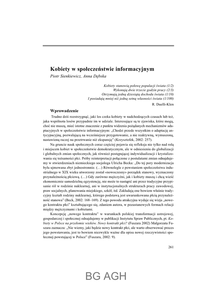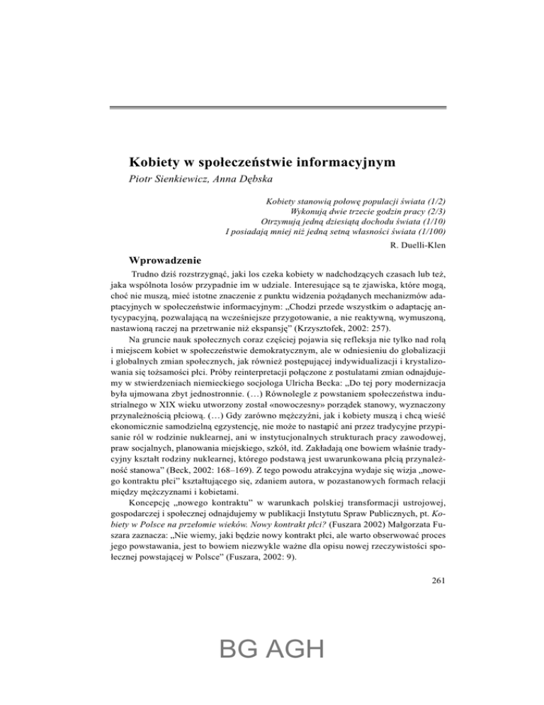 Kobiety w spo³eczeñstwie informacyjnym Piotr Sienkiewicz, Anna Dêbska Kobiety stanowi¹ po³owê populacji wiata (1/2) Wykonuj¹ dwie trzecie godzin pracy (2/3) Otrzymuj¹ jedn¹ dziesi¹t¹ dochodu wiata (1/10) I posiadaj¹ mniej ni¿ jedn¹ setn¹ w³asnoci wiata (1/100) R. Duelli-Klen Wprowadzenie Trudno dzi rozstrzygn¹æ, jaki los czeka kobiety w nadchodz¹cych czasach lub te¿, jaka wspólnota losów przypadnie im w udziale. Interesuj¹ce s¹ te zjawiska, które mog¹, choæ nie musz¹, mieæ istotne znaczenie z punktu widzenia po¿¹danych mechanizmów adaptacyjnych w spo³eczeñstwie informacyjnym: Chodzi przede wszystkim o adaptacjê antycypacyjn¹, pozwalaj¹c¹ na wczeniejsze przygotowanie, a nie reaktywn¹, wymuszon¹, nastawion¹ raczej na przetrwanie ni¿ ekspansjê (Krzysztofek, 2002: 257). Na gruncie nauk spo³ecznych coraz czêciej pojawia siê refleksja nie tylko nad rol¹ i miejscem kobiet w spo³eczeñstwie demokratycznym, ale w odniesieniu do globalizacji i globalnych zmian spo³ecznych, jak równie¿ postêpuj¹cej indywidualizacji i krystalizowania siê to¿samoci p³ci. Próby reinterpretacji po³¹czone z postulatami zmian odnajdujemy w stwierdzeniach niemieckiego socjologa Ulricha Becka: Do tej pory modernizacja by³a ujmowana zbyt jednostronnie. ( ) Równolegle z powstaniem spo³eczeñstwa industrialnego w XIX wieku utworzony zosta³ «nowoczesny» porz¹dek stanowy, wyznaczony przynale¿noci¹ p³ciow¹. ( ) Gdy zarówno mê¿czyni, jak i kobiety musz¹ i chc¹ wieæ ekonomicznie samodzieln¹ egzystencjê, nie mo¿e to nast¹piæ ani przez tradycyjne przypisanie ról w rodzinie nuklearnej, ani w instytucjonalnych strukturach pracy zawodowej, praw socjalnych, planowania miejskiego, szkó³, itd. Zak³adaj¹ one bowiem w³anie tradycyjny kszta³t rodziny nuklearnej, którego podstaw¹ jest uwarunkowana p³ci¹ przynale¿noæ stanowa (Beck, 2002: 168169). Z tego powodu atrakcyjna wydaje siê wizja nowego kontraktu p³ci kszta³tuj¹cego siê, zdaniem autora, w pozastanowych formach relacji miêdzy mê¿czyznami i kobietami. Koncepcjê nowego kontraktu w warunkach polskiej transformacji ustrojowej, gospodarczej i spo³ecznej odnajdujemy w publikacji Instytutu Spraw Publicznych, pt. Kobiety w Polsce na prze³omie wieków. Nowy kontrakt p³ci? (Fuszara 2002) Ma³gorzata Fuszara zaznacza: Nie wiemy, jaki bêdzie nowy kontrakt p³ci, ale warto obserwowaæ proces jego powstawania, jest to bowiem niezwykle wa¿ne dla opisu nowej rzeczywistoci spo³ecznej powstaj¹cej w Polsce (Fuszara, 2002: 9). 261 262 Czêæ VII Socjologiczne spojrzenie na rozwój technologii informacyjnych Kierunek zmian proponowanych w ramach umowy spo³ecznej miêdzy mê¿czyznami i kobietami, wychodzi naprzeciw globalnym przeobra¿eniom socjokulturowym i zapotrzebowaniu na osobowoæ bardziej funkcjonaln¹, sprzyjaj¹c¹ globalizacji. Nie chodzi tu o ¿mudne wyrównywanie szans kobiet, o przejmowanie przez kobiety ról mêskich i odwzorowywanie znanych struktur spo³ecznych. Potrzebny jest cz³owiek o mentalnoci globalnej homo mundialis, nastawiony na potrzebê osi¹gniêæ, wyzwolony z to¿samoci kolektywnej, ujednostkowiony, odpolityczniony, wyleczony z etnicyzmu, sprowadzony do wymiaru konsumenta (Krzysztofek, 2002: 264 cyt. za: Walicki, 1998: 12). Nieobecne nieusprawiedliwione Konceptualizacja wizji spo³eczeñstwa informacyjnego na obecnym etapie nie przes¹dza o tym, jaki bêdzie typowy, najbardziej po¿¹dany czy specyficzny u¿ytkownik cyberprzestrzeni. O ile jednak potrafimy wyobraziæ sobie kobietê w roli obywatelki spo³eczeñstwa postmodernistycznego, konsumentki, w znaczeniu nadanym jej przez kulturê Davos, to w przypadku spo³ecznoci sieciowych staje siê to trudniejsze. Nawet pobie¿ny przegl¹d literatury przedmiotu w¹tków teoretycznych i praktycznych dotycz¹cych spo³eczeñstwa informacyjnego zwraca uwagê na nieobecnoæ kobiet jako podmiotu i przedmiotu rozwa¿añ. Znikome zainteresowanie udzia³em i charakterystyk¹ socjologiczn¹ tej grupy u¿ytkowników Internetu mo¿e usprawiedliwiaæ ich niewielka reprezentacja. Dziewczêta i kobiety nie przekroczy³y, w zamieszczanych przy ró¿nych okazjach zestawieniach statystycznych, 30% populacji polskich internautów. Pojawiaj¹cy siê od czasu do czasu w¹tek wirtualnego feminizmu jawi siê bardziej jako postulat, uwiadomienie mo¿liwoci, jakie Internet narzêdzie stwarza dla kobiet i organizacji feministycznych, ni¿ jako egzemplifikacja uczestnictwa we wspólnocie (Róg, 2002; Witkowska, 2001). Warto zadaæ sobie pytanie, czy nieobecnoæ ta wynika z programowej afirmacji postulatu równouprawnienia, czy z tradycyjnie powielanej marginalizacji roli i znaczenia kobiet w spo³eczeñstwie, czy jest wreszcie odzwierciedleniem wspó³czesnych proporcji. Za t¹ ostatni¹ hipotez¹ przemawiaj¹ dane statystyczne konstatuj¹ce niewielki udzia³ personelu kobiecego zatrudnionego w obszarach zwi¹zanych z przetwarzaniem informacji. Tylko 9% amerykañskich in¿ynierów, 27% naukowców zwi¹zanych z technologi¹ i 29% programistów to kobiety. rednia wieku w firmach IT to 30 lat. Najczêciej zatrudniani s¹ tam m³odzi mê¿czyni, wolni i oddani karierze (Popio³ek, 2001). Inne wyjanienie znajdujemy w artykule Tomasza Sobczyka: Na temat budowy zespo³ów informatycznych powiedziano i napisano ju¿ niemal wszystko. Jednak dot¹d, zarówno w ksi¹¿kach, jak i w czasopismach fachowych, wci¹¿ pomija siê jeden z zasadniczych aspektów zagadnienia, a mianowicie p³eæ cz³onków zespo³u projektowego. Zapewne jest to skutek fa³szywie pojmowanej politycznej poprawnoci, a tak¿e zwyk³ych obaw przed poruszaniem tak trudnego tematu, jak ró¿nice w sposobie pracy charakterystyczne dla obu p³ci. Nie da siê jednak ukryæ, ¿e one istniej¹ i co wiêcej jak wynika z moich dowiadczeñ, w wiêkszoci przypadków sprzyjaj¹ owocnej pracy zespo³owej (Sobczyk, 2001). Au- P. Sienkiewicz, A. Dêbska Kobiety w spo³eczeñstwie informacyjnym 263 tor p