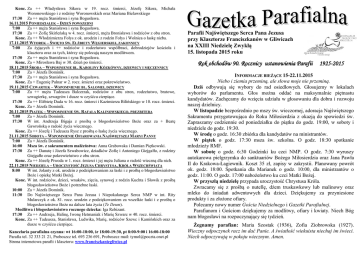 Konc. Za ++ Władysława Sikora w 19. rocz. śmierci, Józefę Sikora, Michała Woronowskiego i z rodziny Woronowskich oraz Mariana Bielawskiego 17:30 Za ++ męża Stanisława i syna Bogusława. 16.11.2015 PONIEDZIAŁEK – DZIEŃ POWSZEDNI 7:00 Za ++ męża Stanisława i syna Bogusława. 17:30 Za ++ Zofię Skirleńską w 4. rocz. śmierci, męża Bronisława i rodziców z obu stron. Konc. Za ++ Włodzimierza Fołys z ok. urodzin i z rodzin Fołys i Wolnica o łaskę nieba. 17.11.2015 WTOREK – ŚWIĘTO ŚW. ELŻBIETY WĘGIERSKIEJ, ZAKONNICY 7:00 Za żyjących i ++ rodziców i rodzeństwo współbraci, dobrodziejów kościoła i klasztoru oraz za tych, którzy się polecają naszym modlitwom. 17:30 Za ++ męża Stanisława i syna Bogusława. Konc. Za + Mirosława Baj w 30. dzień po śmierci. 18.11.2015 ŚRODA – WSPOMNIENIE BŁ. KAROLINY KÓZKÓWNY, DZIEWICY I MĘCZENNICY 7:00 Za + Józefa Dominik. 17:30 Za ++ męża Stanisława i syna Bogusława. Konc. Za + Eugenię Pulnar w 2. rocz. śmierci oraz pokrewieństwo. 19.11.2015 CZWARTEK – WSPOMNIENIE BŁ. SALOMEI, DZIEWICY 7:00 Za ++ męża Tadeusza Balcerzak, rodziców z obu stron, rodzeństwo, bratowe, szwagierkę, szwagrów i dusze w czyśćcu cierpiące. 17:30 Za ++ Elżbietę Duda w 16. rocz. śmierci i Kazimierza Bilińskiego w 10. rocz. śmierci. Konc. Za + Józefa Dominik. 20.11.2015 PIĄTEK – WSPOMNIENIE ŚW. RAFAŁA KALINOWSKIEGO, PREZBITERA 7:00 Za + Józefa Dominik. 17:30 W int. Andrzeja Bigaja z prośbą o błogosławieństwo Boże oraz za + Beatę Gawrońską o radość życia wiecznego. Konc. Za ++ Józefę i Tadeusza Rysz z prośbą o łaskę życia wiecznego. 21.11.2015 SOBOTA – WSPOMNIENIE OFIAROWANIA NAJŚWIĘTSZEJ MARYI PANNY 7:00 Za + Józefa Dominik. 16:00 Msza św. z sakramentem małżeństwa: Anna Grabowska i Damian Piętkowski. 17:30 Za ++ Danutę i Józefa Szwabowicz, dziadków Zofię i Antoniego Giejgałło, z rodziny Giejgałło oraz pokrewieństwo z obu stron. Konc. Za ++ Józefę Piwoda w 1. rocz. śmierci i jej męża Juliana o radość wieczną dla nich. 22.11.2015 NIEDZIELA – UROCZYSTOŚĆ JEZUSA CHRYSTUSA, KRÓLA WSZECHŚWIATA 8:00 W int. Jolanty z ok. urodzin z podziękowaniem za łaski i z prośbą o błogosławieństwo Boże i opiekę Matki Bożej. Konc. W int. rodziców, dzieci, wnuków, zięcia, synowej z rodzin Kuchta i Słowik z prośbą błogosławieństwo Boże i potrzebne łaski. 10:00 Za + Józefa Dominik. 11:30 Do Najświętszego Serca Pana Jezusa i Niepokalanego Serca NMP w int. Rity Mularczyk z ok. 81. rocz. urodzin z podziękowaniem za wszelkie łaski i z prośbą o błogosławieństwo Boże na dalsze lata życia (Te Deum). Modlitwa i błogosławieństwo rocznego dziecka: Iga Rebizant. 17:30 Za ++ Andrzeja, Halinę, Iwonę Hetmaniak i Marię Szwarc w 40. rocz. śmierci. Konc. Za ++ Tadeusza, Stanisława, Ludwika, Marię, rodziców Szewc i Kamińskich oraz za dusze w czyśćcu cierpiące. Kancelaria parafialna czynna: wt 16:00-18:00, śr 18:00-19:30, pt 8:00-9:00 i 16:00-18:00 Parafia tel. 32 333 21 21, Proboszcz tel. 693 236 691, Proboszcz mail: [email protected] Strona internetowa parafii i klasztoru: www.franciszkaniegliwice.pl Parafii Najświętszego Serca Pana Jezusa przy Klasztorze Franciszkanów w Gliwicach na XXIII Niedzielę Zwykłą 15. listopada 2015 roku Rok obchodów 90. Rocznicy ustanowienia Parafii 1925-2015 INFORMACJE BIEŻĄCE 15-22.11.2015 Niebo i ziemia przeminą, ale słowa moje nie przeminą. Dziś odbywają się wybory do rad osiedlowych. Głosujemy w lokalach wyborów do parlamentu. Głos można oddać na maksymalnie piętnastu kandydatów. Zachęcamy do wzięcia udziału w głosowaniu dla dobra i rozwoju naszej dzielnicy. W listopadzie bezpośrednio po mszy św. wieczornej, adoracja Najświętszego Sakramentu przygotowująca do Roku Miłosierdzia z okazją do spowiedzi św. Zapraszamy codziennie od poniedziałku do piątku do godz. 19:00, w soboty i niedziele do godz. 19:30. W środę o godz. 16:30 zbiórka dla kandydatów na ministrantów. W piątek o godz. 17:30 msza św. szkolna. O godz. 18:30 spotkanie młodzieży RMF. W sobotę o godz. 6:30 Godzinki ku czci NMP. O godz. 7:30 wyruszy autokarowa pielgrzymka do sanktuariów Bożego Miłosierdzia oraz Jana Pawła II do Krakowa-Łagiewnik. Koszt 35 zł, zapisy w zakrystii. Planowany powrót ok. godz. 18:00. Spotkania dla Marianek o godz. 10:00, dla ministrantów o godz. 11:00. O godz. 17:00 nabożeństwo ku czci Matki Bożej. W przyszłą niedzielę przypada uroczystość Chrystusa Króla. Zwracamy się z prośbą o nutellę, dżem truskawkowy lub malinowy oraz mleko do śniadań adwentowych dla dzieci. Dziękujemy za przyniesione produkty i za złożone ofiary. Polecamy nowy numer Gościa Niedzielnego i Gazetki Parafialnej. Parafianom i Gościom dziękujemy za modlitwy, ofiary i kwiaty. Niech Bóg nam błogosławi na rozpoczynający się tydzień. Żegnamy parafian: Maria Szostak (1936), Zofia Ziobrowska (1927). Wieczny odpoczynek racz im dać Panie. A światłość wiekuista niechaj im świeci. Niech odpoczywają w pokoju wiecznym. Amen. BŁOGOSŁAWIONA KAROLINA KÓZKÓWNA PATRONKA RUCHU CZYSTYCH SERC Była bardzo wstydliwa i skromna, nie lubiła płochych rozmów i dwuznacznych żartów. Nazywano Karolinkę powszechnie „aniołem w ludzkim ciele”... Nie słyszałam, żeby ją uważali za jakąś dziwaczkę, słyszałam natomiast, że ją wszyscy szanowali i kochali wspomina koleżanka. Nie chciała wyjść za mąż, aby – jak powiedziała – mogła w niebie przebywać z Matką Bożą. Umyśliła sobie, że dobuduje do domu rodzinnego komórkę, w której zamieszka, oddając się modlitwie, służąc Bogu i pomagając ludziom. Dziś ten rodzaj powołania do konsekracji pozostając w świecie, jest uznany przez Kościół. Czystość była dla niej wartością ponad inne. Przez nią czuła szczególną więź, jakby pokrewieństwo z Jezusem Chrystusem i Jego dziewiczą Matką. Oddać ją komukolwiek 