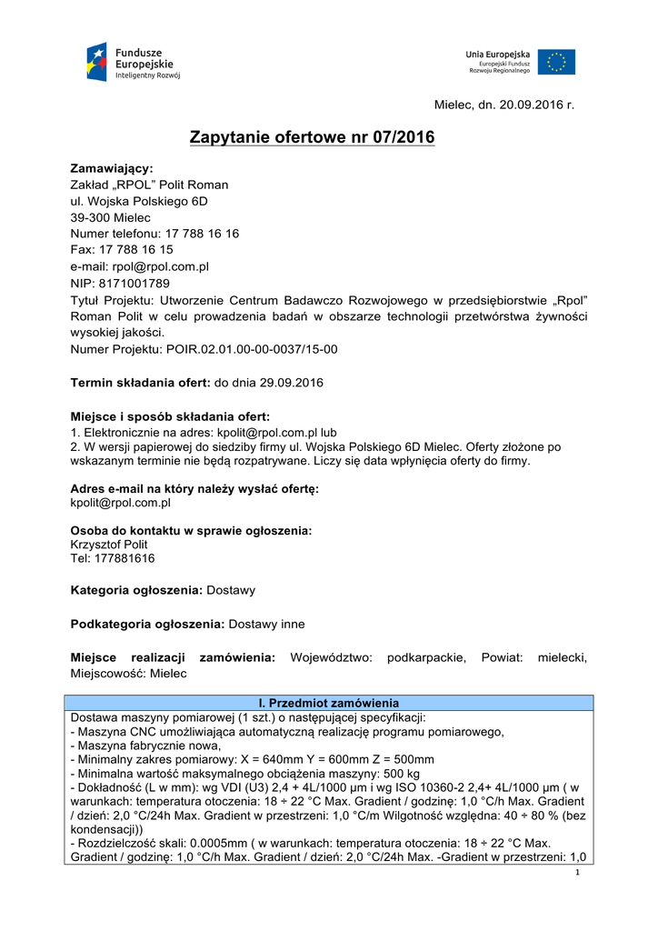 Mielec, dn. 20.09.2016 r. Zapytanie ofertowe nr 07/2016 Zamawiający: Zakład „RPOL” Polit Roman ul. Wojska Polskiego 6D 39-300 Mielec Numer telefonu: 17 788 16 16 Fax: 17 788 16 15 e-mail: [email protected] NIP: 8171001789 Tytuł Projektu: Utworzenie Centrum Badawczo Rozwojowego w przedsiębiorstwie „Rpol” Roman Polit w celu prowadzenia badań w obszarze technologii przetwórstwa żywności wysokiej jakości. Numer Projektu: POIR.02.01.00-00-0037/15-00 Termin składania ofert: do dnia 29.09.2016 Miejsce i sposób składania ofert: 1. Elektronicznie na adres: [email protected] lub 2. W wersji papierowej do siedziby firmy ul. Wojska Polskiego 6D Mielec. Oferty złożone po wskazanym terminie nie będą rozpatrywane. Liczy się data wpłynięcia oferty do firmy. Adres e-mail na który należy wysłać ofertę: [email protected] Osoba do kontaktu w sprawie ogłoszenia: Krzysztof Polit Tel: 177881616 Kategoria ogłoszenia: Dostawy Podkategoria ogłoszenia: Dostawy inne Miejsce realizacji Miejscowość: Mielec zamówienia: Województwo: podkarpackie, Powiat: mielecki, I. Przedmiot zamówienia Dostawa maszyny pomiarowej (1 szt.) o następującej specyfikacji: - Maszyna CNC umożliwiająca automatyczną realizację programu pomiarowego, - Maszyna fabrycznie nowa, - Minimalny zakres pomiarowy: X = 640mm Y = 600mm Z = 500mm - Minimalna wartość maksymalnego obciążenia maszyny: 500 kg - Dokładność (L w mm): wg VDI (U3) 2,4 + 4L/1000 µm i wg ISO 10360-2 2,4+ 4L/1000 µm ( w warunkach: temperatura otoczenia: 18 ÷ 22 °C Max. Gradient / godzinę: 1,0 °C/h Max. Gradient / dzień: 2,0 °C/24h Max. Gradient w przestrzeni: 1,0 °C/m Wilgotność względna: 40 ÷ 80 % (bez kondensacji)) - Rozdzielczość skali: 0.0005mm ( w warunkach: temperatura otoczenia: 18 ÷ 22 °C Max. Gradient / godzinę: 1,0 °C/h Max. Gradient / dzień: 2,0 °C/24h Max. -Gradient w przestrzeni: 1,0 °C/m Wilgotność względna: 40 ÷ 80 % (bez kondensacji)) - System pomiarowy: Skale Renishaw - Głowice w zestawie: Telecentryczna kamera CCD, półautomatyczna głowica RTP20, - Głowice z mocowaniem magnetycznym. - Możliwość montażu następujących głowic pomiarowych: RTP20 , PH10T , kamera CCD - Oś Z musi posiadać przeciwwagę 1 Kg - Wszystkie łożyska powietrzne - Maksymalna wartość zasilania powietrzem: 50 l/min w trybie ciągłym przy ciśnieniu 4 bar - Do maszyny musi być dołączona suszarka sprężonego powietrza o wydajności przynajmniej 25 m3/h - Maszyna musi zawierać magazynek do wymian końcówek MCR20 - Granitowy stół - Możliwość montażu maszyny w pomieszczeniu z drzwiami o szerokości światła 100cm. Specyfikacja kamery CCD: - Matryca: minimum 3 miliony pikseli; - Minimalna rozdzielczość: 2048 x 1536 (QXGA); Minimalne zakresy: - Dystans od kamery:125 mm - 1000mm - Pole widzenia: 9,5 mm - 125 mm - Wielkość piksela: 4,8 µm - 48 µm Specyfikacja oprogramowania do maszyny pomiarowej: - Pakiet z zaawansowanym interfejsem graficznym (rysującym mierzone elementy, robiącym raporty, posiadający moduł porównywania pomiarów do obiektów bryłowych), - Obsługa wymaganych głowic pomiarowych, - Oprogramowanie w języku polskim. - Rysunek mierzonej części (w trzech rzutach), rzeczywiste wymiary części oraz tolerancje muszą być widoczne w trakcie pomiarów na ekranie monitora. - Oprogramowanie musi umożliwiać kompleksową kontrolę elementów geometrycznych, pomiaru długości i kąta, określania parametrów GD&T (tolerancji kształtu i położenia), oprócz standardowych raportów musi być możliwy zapis wyników w postaci rysunku technicznego. Dodatkowo, musi być możliwy eksport raportu pomiarowego do programu Microsoft Excel. Musi być możliwy pomiar elementu z wykorzystaniem jego rysunku z modelu CAD, czyli przeprowadzenie kontroli powierzchni detalu względem modelu CAD. - Oprogramowanie ma umożliwiać współpracę z plikami CAD o rozszerzeniach *.stp oraz *igs. - Po wykonaniu pomiarów w trybie CNC użytkownik musi mieć możliwość wygenerowania raportu w postaci tabelarycznej (lista punktów pomiarowych, ich współrzędne oraz wartość odchyłki), lub w postaci graficznej (wydruk rysunku detalu z zaznaczonymi punktami pomiarowymi i odchyłkami zwizualizowanymi w postaci chorągiewek z podaną wartością odchyłki). KOD CPV: 42900000-5 – Różne maszyny ogólnego i specjalnego przeznaczenia II. Harmonogram realizacji zamówienia 6 tygodni od złożenia zamówienia, nie później niż 14.11.2016 III. Dodatkowe warunki 1. Zamawiający określa następujące kryteria dopuszczeniowe: a. Spełnienie wszystkich zdefiniowanych w przedmiocie zamówienia parametrów technicznych b. Autoryzowany serwis i magazyn części musi mieścić się na terenie Polski Po spełnieniu tych warunków oferty zostaną skierowane do oceny punktowej. 2. Zamawiający zastrzega sobie prawo do zmiany treści niniejszego zapytania. Jeżeli zmiany będą mogły mieć wpływ na treść składanych w postępowaniu ofert, Zamawiający przedłuży termin składania ofert. 3. Zamawiający może wezwać w wyznaczonym przez siebie terminie do złożenia wyjaśnień lub uzupełnienia oferty. 4. Zamawiający nie dopuszcza możliwości składania ofert częściowych. IV. Lista dokumentów/oświadczeń wymaganych od Wykonawcy Oferta przygotowana wg następujących wytycznych: a) Oferta musi mieć formę pisemną; b) Oferta powinna zawierać: • Pełne dane identyfikujące oferenta (nazwa, adres, nr NIP, nr KRS/EDG), • Datę przygotowania i termin ważności oferty • Cenę całkowitą brutto, • Warunki i termin płatności, • Dane osoby do kontaktu (imię nazwisko, numer telefonu, adres e-mail), • Podpis osoby upoważnionej do wystawienia oferty. • Pełne dane techniczne maszyny pomiarowej, kamery CCD oraz oprogramowania. Brak jakiegokolwiek z wyżej wymienionych elementów może skutkować odrzuceniem oferty. Oferent ponosi wszelkie koszty związane z przygotowaniem i złożeniem oferty.