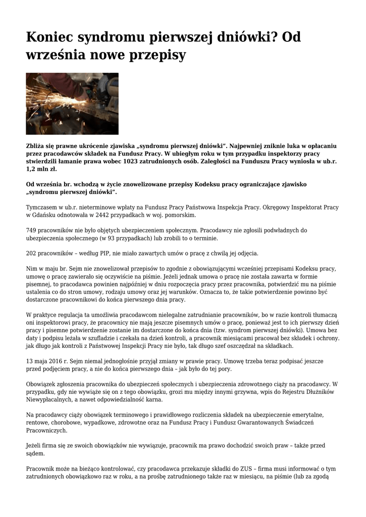 Koniec syndromu pierwszej dniówki? Od września nowe przepisy Zbliża się prawne ukrócenie zjawiska „syndromu pierwszej dniówki”. Najpewniej zniknie luka w opłacaniu przez pracodawców składek na Fundusz Pracy. W ubiegłym roku w tym przypadku inspektorzy pracy stwierdzili łamanie prawa wobec 1023 zatrudnionych osób. Zaległości na Funduszu Pracy wyniosła w ub.r. 1,2 mln zł. Od września br. wchodzą w życie znowelizowane przepisy Kodeksu pracy ograniczające zjawisko „syndromu pierwszej dniówki”. Tymczasem w ub.r. nieterminowe wpłaty na Fundusz Pracy Państwowa Inspekcja Pracy. Okręgowy Inspektorat Pracy w Gdańsku odnotowała w 2442 przypadkach w woj. pomorskim. 749 pracowników nie było objętych ubezpieczeniem społecznym. Pracodawcy nie zgłosili podwładnych do ubezpieczenia społecznego (w 93 przypadkach) lub zrobili to o terminie. 202 pracowników – według PIP, nie miało zawartych umów o pracę z chwilą jej odjęcia. Nim w maju br. Sejm nie znowelizował przepisów to zgodnie z obowiązującymi wcześniej przepisami Kodeksu pracy, umowę o pracę zawierało się oczywiście na piśmie. Jeżeli jednak umowa o pracę nie została zawarta w formie pisemnej, to pracodawca powinien najpóźniej w dniu rozpoczęcia pracy przez pracownika, potwierdzić mu na piśmie ustalenia co do stron umowy, rodzaju umowy oraz jej warunków. Oznacza to, że takie potwierdzenie powinno być dostarczone pracownikowi do końca pierwszego dnia pracy. W praktyce regulacja ta umożliwia pracodawcom nielegalne zatrudnianie pracowników, bo w razie kontroli tłumaczą oni inspektorowi pracy, że pracownicy nie mają jeszcze pisemnych umów o pracę, ponieważ jest to ich pierwszy dzień pracy i pisemne potwierdzenie zostanie im dostarczone do końca dnia (tzw. syndrom pierwszej dniówki). Umowa bez daty i podpisu leżała w szufladzie i czekała na dzień kontroli, a pracownik miesiącami pracował bez składek i ochrony. jak długo jak kontroli z Państwowej Inspekcji Pracy nie było, tak długo szef oszczędzał na składkach. 13 maja 2016 r. Sejm niemal jednogłośnie przyjął zmiany w prawie pracy. Umowę trzeba teraz podpisać jeszcze przed podjęciem pracy, a nie do końca pierwszego dnia – jak było do tej pory. Obowiązek zgłoszenia pracownika do ubezpieczeń społecznych i ubezpieczenia zdrowotnego ciąży na pracodawcy. W przypadku, gdy nie wywiąże się on z tego obowiązku, grozi mu między innymi grzywna, wpis do Rejestru Dłużników Niewypłacalnych, a nawet odpowiedzialność karna. Na pracodawcy ciąży obowiązek terminowego i prawidłowego rozliczenia składek na ubezpieczenie emerytalne, rentowe, chorobowe, wypadkowe, zdrowotne oraz na Fundusz Pracy i Fundusz Gwarantowanych Świadczeń Pracowniczych. Jeżeli firma się ze swoich obowiązków nie wywiązuje, pracownik ma prawo dochodzić swoich praw – także przed sądem. Pracownik może na bieżąco kontrolować, czy pracodawca przekazuje składki do ZUS – firma musi informować o tym zatrudnionych obowiązkowo raz w roku, a na prośbę zatrudnionego także raz w miesiącu, na piśmie (lub za zgodą pracownika w formie dokumentu elektronicznego) na formularzu ZUS RMUA lub w innej formie, na przykład na tzw. pasku z wynagrodzeniami. Każdy ubezpieczony może także sprawdzić stan swoich ubezpieczeń społecznych i zdrowotnych bezpośrednio w ZUS. Co może zrobić ZUS? Od nieopłaconych w terminie składek pracodawca musi zapłacić obowiązkowe odsetki za zwłokę. Wynoszą one 10 proc. w skali roku, ale nie nalicza się ich, jeżeli wyniosłyby mniej niż 6,60 zł. Ponadto ZUS może wystąpić do sądu z wnioskiem o ukaranie pracodawcy karą grzywny. W przypadku, gdy niesolidny pracodawca nadal nie chce płacić, ZUS może wszcząć postępowanie egzekucyjne, a także wystąpić do sądu o zabezpieczenie majątku płatnika (poprzez ustanowienie hipoteki na nieruchomości dłużnika i zastawu skarbowego), ogłoszenie upadłości płatnika lub zakazanie mu prowadzenia działalności gospodarczej. Niesolidny pracodawca może zostać także wykluczony z postępowania o udzielenie zamówienia publicznego. Sprawą nieuczciwego pracodawcy można zainteresować Państwową Inspekcję Pracy. PIP może wysłać kontrolę do firmy, w wyniku której inspektor pracy wyda decyzję, zastosuje wystąpienie, skieruje powództwo lub nałoży grzywnę. fot. pixabay.com/CC0 www.solidarnosc.gda.pl