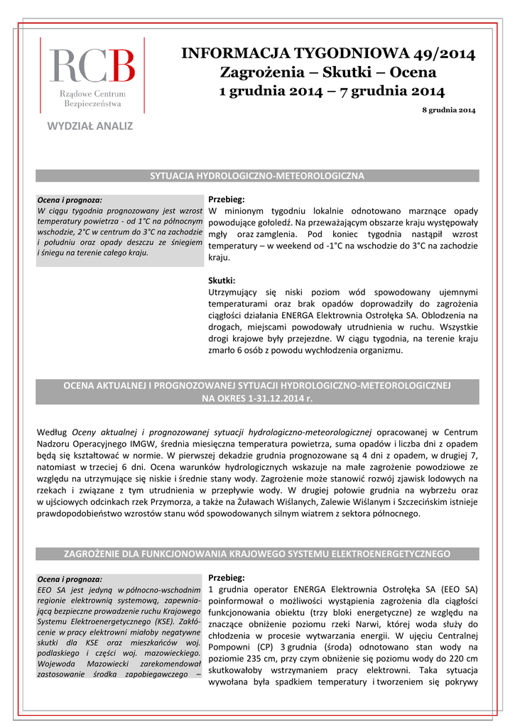 INFORMACJA TYGODNIOWA 49/2014 Zagrożenia – Skutki – Ocena 1 grudnia 2014 – 7 grudnia 2014 8 grudnia 2014 WYDZIAŁ ANALIZ SYTUACJA HYDROLOGICZNO-METEOROLOGICZNA Ocena i prognoza: W ciągu tygodnia prognozowany jest wzrost temperatury powietrza - od 1°C na północnym wschodzie, 2°C w centrum do 3°C na zachodzie i południu oraz opady deszczu ze śniegiem i śniegu na terenie całego kraju. Przebieg: W minionym tygodniu lokalnie odnotowano marznące opady powodujące gołoledź. Na przeważającym obszarze kraju występowały mgły oraz zamglenia. Pod koniec tygodnia nastąpił wzrost temperatury – w weekend od -1°C na wschodzie do 3°C na zachodzie kraju. Skutki: Utrzymujący się niski poziom wód spowodowany ujemnymi temperaturami oraz brak opadów doprowadziły do zagrożenia ciągłości działania ENERGA Elektrownia Ostrołęka SA. Oblodzenia na drogach, miejscami powodowały utrudnienia w ruchu. Wszystkie drogi krajowe były przejezdne. W ciągu tygodnia, na terenie kraju zmarło 6 osób z powodu wychłodzenia organizmu. OCENA AKTUALNEJ I PROGNOZOWANEJ SYTUACJI HYDROLOGICZNO-METEOROLOGICZNEJ NA OKRES 1-31.12.2014 r. Według Oceny aktualnej i prognozowanej sytuacji hydrologiczno-meteorologicznej opracowanej w Centrum Nadzoru Operacyjnego IMGW, średnia miesięczna temperatura powietrza, suma opadów i liczba dni z opadem będą się kształtować w normie. W pierwszej dekadzie grudnia prognozowane są 4 dni z opadem, w drugiej 7, natomiast w trzeciej 6 dni. Ocena warunków hydrologicznych wskazuje na małe zagrożenie powodziowe ze względu na utrzymujące się niskie i średnie stany wody. Zagrożenie może stanowić rozwój zjawisk lodowych na rzekach i związane z tym utrudnienia w przepływie wody. W drugiej połowie grudnia na wybrzeżu oraz w ujściowych odcinkach rzek Przymorza, a także na Żuławach Wiślanych, Zalewie Wiślanym i Szczecińskim istnieje prawdopodobieństwo wzrostów stanu wód spowodowanych silnym wiatrem z sektora północnego. ZAGROŻENIE DLA FUNKCJONOWANIA KRAJOWEGO SYSTEMU ELEKTROENERGETYCZNEGO Ocena i prognoza: EEO SA jest jedyną w północno-wschodnim regionie elektrownią systemową, zapewniającą bezpieczne prowadzenie ruchu Krajowego Systemu Elektroenergetycznego (KSE). Zakłócenie w pracy elektrowni miałoby negatywne skutki dla KSE oraz mieszkańców woj. podlaskiego i części woj. mazowieckiego. Wojewoda Mazowiecki zarekomendował zastosowanie środka zapobiegawczego – ścianki Przebieg: 1 grudnia operator ENERGA Elektrownia Ostrołęka SA (EEO SA) poinformował o możliwości wystąpienia zagrożenia dla ciągłości funkcjonowania obiektu (trzy bloki energetyczne) ze względu na znaczące obniżenie poziomu rzeki Narwi, której woda służy do chłodzenia w procesie wytwarzania energii. W ujęciu Centralnej Pompowni (CP) 3 grudnia (środa) odnotowano stan wody na poziomie 235 cm, przy czym obniżenie się poziomu wody do 220 cm skutkowałoby wstrzymaniem pracy elektrowni. Taka sytuacja wywołana była spadkiem temperatury i tworzeniem się pokrywy INFORMACJA TYGODNIOWA 1.12. 2014 – 7.12. 2014 Ocena i prognoza cd.: ścianki szczelnej podpiętrzającej wodę na Narwi (tzw. ścianki Larsena). Dodatkowo, w miejscach przeznaczonych do ustawienia przegrody, rozpoczęto przygotowanie odpowiedniego zapasu kruszywa do wypełnienia worków kontenerowych oraz urządzenia dźwigowego, co umożliwi podjęcie natychmiastowych działań w przypadku krótkotrwałego spadku poziomu wody poniżej 230 cm. lodowej na Narwi powyżej ujęcia elektrowni Ostrołęka, co spowodowało znaczące utrudnienie przepływu wody w rzece. W ciągu kolejnych dni (4, 5 grudnia) poziom wody na ujęciu EEO zaczął się podnosić i 5 grudnia (piątek) o godz. 15.00 osiągnął stan 275 cm. Obecnie wynosi 296 cm. Skutki: 3 grudnia w Ostrołęce odbyło się posiedzenie Zespołu Zarządzania Kryzysowego pod przewodnictwem wojewody mazowieckiego oraz prezydenta miasta Ostrołęki. Udział wzięli m.in. przedstawiciele WBiZK Starostwa Powiatowego w Ostrołęce, PSE, KM PSP, RZGW oraz RCB. Celem spotkania było omówienie zagrożeń związanych z wyłączeniem poszczególnych bloków energetycznych lub całości elektrowni. PAA NIE POTWIERDZA DONIESIEŃ MEDIALNYCH O AWARII W ELEKTROWNI ATOMOWEJ NA UKRAINIE Ocena i prognoza: Sytuacja radiacyjna Polski jest na bieżąco monitorowana przez Centrum do Spraw Zdarzeń Radiacyjnych CEZAR PAA. Na podstawie danych z systemu stacji wczesnego wykrywania skażeń promieniotwórczych, nie stwierdzono żadnych odchyleń od wartości normalnych – nie odnotowano wzrostu poziom mocy dawki promieniowania gamma na terenie Polski. Wszelkie informacje medialne dotyczące rzekomej chmury radioaktywnej przemieszczającej się nad Polską zostały zdementowane przez PAA. Przebieg: 3 grudnia (środa) w mediach pojawiły się informacje dotyczące awarii w Zaporoskiej Elektrowni Atomowej na Ukrainie znajdującej się ok. 700 km od granicy z Polską. Z informacji przekazanych Państwowej Agencji Atomistyki (PAA) przez ukraiński dozór jądrowy wynika, że 28 października wystąpiły problemy w części elektrycznej bloku III, który w związku z tym został wyłączony wraz z reaktorem. Incydentowi nie towarzyszyło uwolnienie do środowiska substancji promieniotwórczych. 5 grudnia (piątek) na terenie woj. wielkopolskiego rozpowszechniona została nieprawdziwa informacja o przechodzącej nad Polską chmurze radioaktywnej. Doniesienia te spowodowały m.in zatrzymanie dzieci w szkołach do godz. 14.00 i liczne pytania o płyn Lugola w aptekach. Rządowe Centrum Bezpieczeństwa zorganizowało wideokonferencję z udziałem przedstawiciela PAA, MAiC, urzędów wojewódzkich i służb MSW, której celem było skoordynowanie działań dementujących pogłoski. Wystosowano również odpowiednie rekomendacje. Skutki: Brak jest zagrożenia radiacyjnego zarówno na terenie elektrowni jądrowej, jak i poza nią. PROTEST GÓRNIKÓW (WOJ. ŚLĄSKIE) 