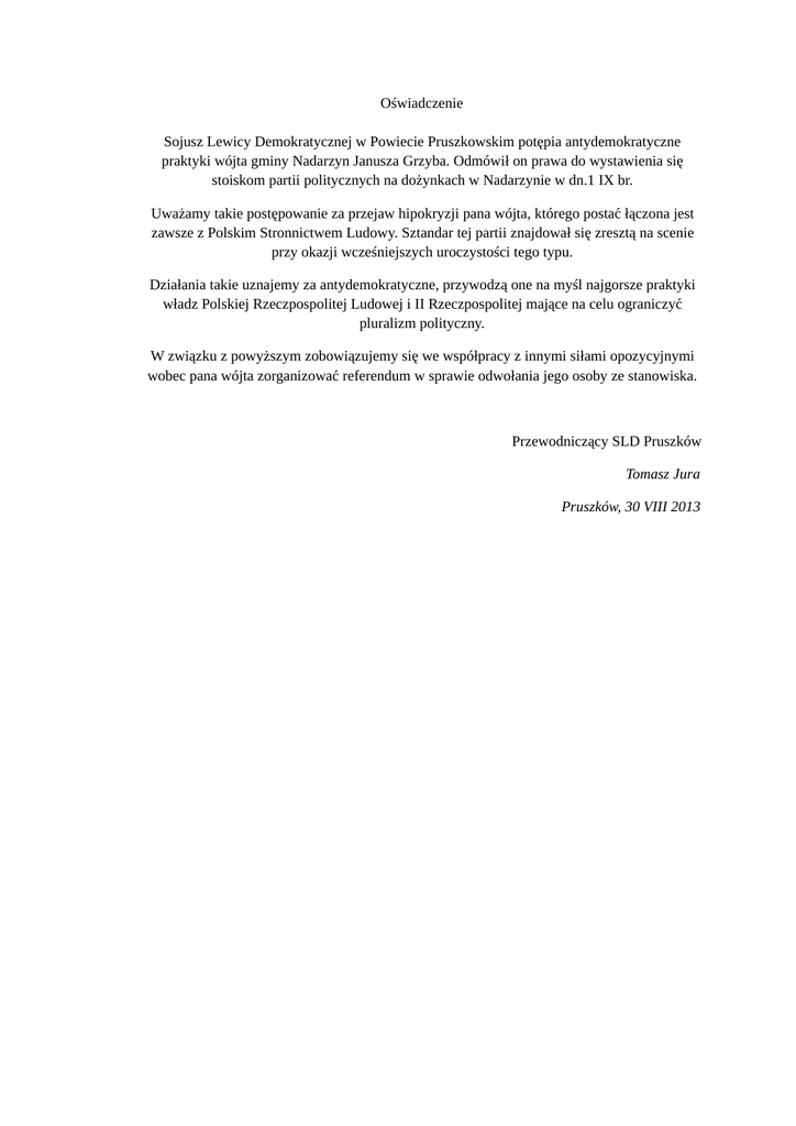 Oświadczenie Sojusz Lewicy Demokratycznej w Powiecie Pruszkowskim potępia antydemokratyczne praktyki wójta gminy Nadarzyn Janusza Grzyba. Odmówił on prawa do wystawienia się stoiskom partii politycznych na dożynkach w Nadarzynie w dn.1 IX br. Uważamy takie postępowanie za przejaw hipokryzji pana wójta, którego postać łączona jest zawsze z Polskim Stronnictwem Ludowy. Sztandar tej partii znajdował się zresztą na scenie przy okazji wcześniejszych uroczystości tego typu. Działania takie uznajemy za antydemokratyczne, przywodzą one na myśl najgorsze praktyki władz Polskiej Rzeczpospolitej Ludowej i II Rzeczpospolitej mające na celu ograniczyć pluralizm polityczny. W związku z powyższym zobowiązujemy się we współpracy z innymi siłami opozycyjnymi wobec pana wójta zorganizować referendum w sprawie odwołania jego osoby ze stanowiska. Przewodniczący SLD Pruszków Tomasz Jura Pruszków, 30 VIII 2013