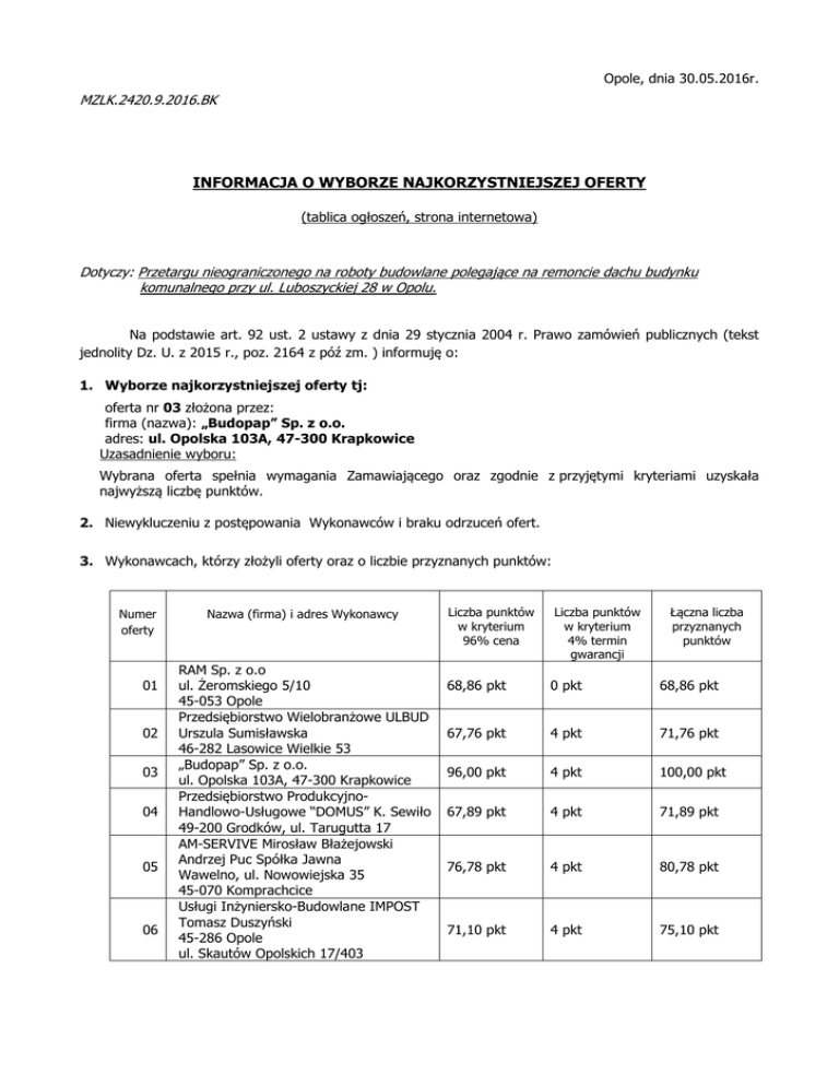 Opole, dnia 30.05.2016r. MZLK.2420.9.2016.BK INFORMACJA O WYBORZE NAJKORZYSTNIEJSZEJ OFERTY (tablica ogłoszeń, strona internetowa) Dotyczy: Przetargu nieograniczonego na roboty budowlane polegające na remoncie dachu budynku komunalnego przy ul. Luboszyckiej 28 w Opolu. Na podstawie art. 92 ust. 2 ustawy z dnia 29 stycznia 2004 r. Prawo zamówień publicznych (tekst jednolity Dz. U. z 2015 r., poz. 2164 z póź zm. ) informuję o: 1. Wyborze najkorzystniejszej oferty tj: oferta nr 03 złożona przez: firma (nazwa): „Budopap” Sp. z o.o. adres: ul. Opolska 103A, 47-300 Krapkowice Uzasadnienie wyboru: Wybrana oferta spełnia wymagania Zamawiającego oraz zgodnie z przyjętymi kryteriami uzyskała najwyższą liczbę punktów. 2. Niewykluczeniu z postępowania Wykonawców i braku odrzuceń ofert. 3. Wykonawcach, którzy złożyli oferty oraz o liczbie przyznanych punktów: Numer oferty 01 02 03 04 05 06 Nazwa (firma) i adres Wykonawcy RAM Sp. z o.o ul. Żeromskiego 5/10 45-053 Opole Przedsiębiorstwo Wielobranżowe ULBUD Urszula Sumisławska 46-282 Lasowice Wielkie 53 „Budopap” Sp. z o.o. ul. Opolska 103A, 47-300 Krapkowice Przedsiębiorstwo ProdukcyjnoHandlowo-Usługowe “DOMUS” K. Sewiło 49-200 Grodków, ul. Tarugutta 17 AM-SERVIVE Mirosław Błażejowski Andrzej Puc Spółka Jawna Wawelno, ul. Nowowiejska 35 45-070 Komprachcice Usługi Inżyniersko-Budowlane IMPOST Tomasz Duszyński 45-286 Opole ul. Skautów Opolskich 17/403 Liczba punktów w kryterium 96% cena Liczba punktów w kryterium 4% termin gwarancji Łączna liczba przyznanych punktów 68,86 pkt 0 pkt 68,86 pkt 67,76 pkt 4 pkt 71,76 pkt 96,00 pkt 4 pkt 100,00 pkt 67,89 pkt 4 pkt 71,89 pkt 76,78 pkt 4 pkt 80,78 pkt 71,10 pkt 4 pkt 75,10 pkt