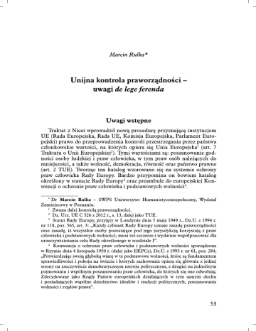 UE. Naruszenie pozostałych praw tylko w przypadku niewykonania orzeczeń ETPCz, szczególnie po przystąpieniu UE do EKPCz, powinno stanowić podstawę wszczęcia procedury kontroli praworządności. Ocena praworządności sensu stricto powinna natomiast zostać ograniczona do przypadków wykraczania przez organy państwowe poza granice określone prawem