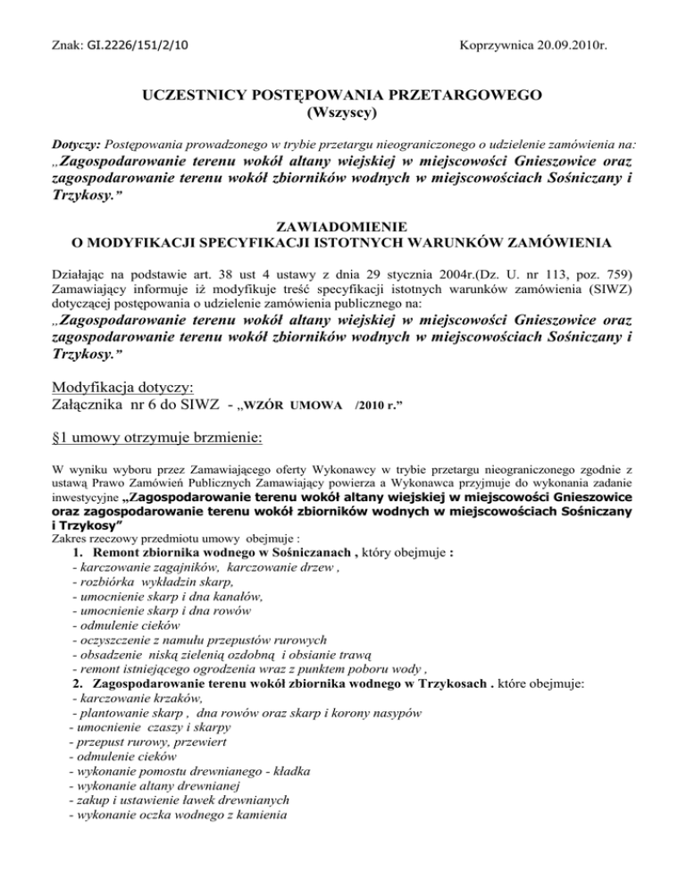Znak: GI.2226/151/2/10 Koprzywnica 20.09.2010r. UCZESTNICY POSTĘPOWANIA PRZETARGOWEGO (Wszyscy) Dotyczy: Postępowania prowadzonego w trybie przetargu nieograniczonego o udzielenie zamówienia na: „Zagospodarowanie terenu wokół altany wiejskiej w miejscowości Gnieszowice oraz zagospodarowanie terenu wokół zbiorników wodnych w miejscowościach Sośniczany i Trzykosy.” ZAWIADOMIENIE O MODYFIKACJI SPECYFIKACJI ISTOTNYCH WARUNKÓW ZAMÓWIENIA Działając na podstawie art. 38 ust 4 ustawy z dnia 29 stycznia 2004r.(Dz. U. nr 113, poz. 759) Zamawiający informuje iż modyfikuje treść specyfikacji istotnych warunków zamówienia (SIWZ) dotyczącej postępowania o udzielenie zamówienia publicznego na: „Zagospodarowanie terenu wokół altany wiejskiej w miejscowości Gnieszowice oraz zagospodarowanie terenu wokół zbiorników wodnych w miejscowościach Sośniczany i Trzykosy.” Modyfikacja dotyczy: Załącznika nr 6 do SIWZ - „WZÓR UMOWA /2010 r.” §1 umowy otrzymuje brzmienie: W wyniku wyboru przez Zamawiającego oferty Wykonawcy w trybie przetargu nieograniczonego zgodnie z ustawą Prawo Zamówień Publicznych Zamawiający powierza a Wykonawca przyjmuje do wykonania zadanie inwestycyjne „Zagospodarowanie terenu wokół altany wiejskiej w miejscowości Gnieszowice oraz zagospodarowanie terenu wokół zbiorników wodnych w miejscowościach Sośniczany i Trzykosy” Zakres rzeczowy przedmiotu umowy obejmuje : 1. Remont zbiornika wodnego w Sośniczanach , który obejmuje : - karczowanie zagajników, karczowanie drzew , - rozbiórka wykładzin skarp, - umocnienie skarp i dna kanałów, - umocnienie skarp i dna rowów - odmulenie cieków - oczyszczenie z namułu przepustów rurowych - obsadzenie niską zielenią ozdobną i obsianie trawą - remont istniejącego ogrodzenia wraz z punktem poboru wody , 2. Zagospodarowanie terenu wokół zbiornika wodnego w Trzykosach . które obejmuje: - karczowanie krzaków, - plantowanie skarp , dna rowów oraz skarp i korony nasypów - umocnienie czaszy i skarpy - przepust rurowy, przewiert - odmulenie cieków - wykonanie pomostu drewnianego - kładka - wykonanie altany drewnianej - zakup i ustawienie ławek drewnianych - wykonanie oczka wodnego z kamienia - sadzenie drzew i krzewów liściastych 3. Zagospodarowanie terenu wokół altany wiejskiej, które obejmuje: - drogę dojazdową – wewnętrzną do boiska o nawierzchni z tłucznia kamiennego - boisko ( wykopy, plantowanie, zagęszczanie, humusowanie i obsianie skarp, ustawienie słupków , stojaków i bramek stalowo-drewnianych do piłki nożnej , ławki parkowe) Szczegółowy zakres robót zawarty jest w przedmiarze robót, dokumentacji technicznej i specyfikacji technicznej wykonania i odbioru robót oraz w specyfikacji istotnych warunków zamówienia. 4. Wykonawca zobowiązuje się zrealizować przedmiot umowy zgodnie z dokumentacją techniczną, zasadami wiedzy technicznej, sztuką budowlaną i obowiązującymi przepisami w szczególności techniczno - budowlanymi oraz normami. 5. Wykonawca na własny koszt: 1) przygotuje zaplecze budowy tj. odpowiednie pomieszczenia magazynowe, socjalne dla swoich pracowników 2) sporządzi lub zapewni sporządzenie przed rozpoczęciem budowy, planu bezpieczeństwa i ochrony zdrowia w zakresie określonym w art. 21 a ustawy Prawo budowlane (Dz. U. z 2006 nr 156 poz 1118 z poźn. zm.) oraz Rozporządzenia Ministra Infrastruktury w sprawie informacji dotyczącej bezpieczeństwa i ochrony zdrowia oraz planu bezpieczeństwa i ochrony zdrowia (Dz. U. z 2003 nr 120 poz.1126) 3) w sytuacji gdy do prawidłowego wykonania zadania zachodzi konieczność czasowego zajęcia terenów prywatnych osób trzecich Wykonawca jest zobowiązany do możliwie najmniej uciążliwego dla nich prowadzenia robót i przywrócenia stanu pierwotnego terenu na własny koszt.