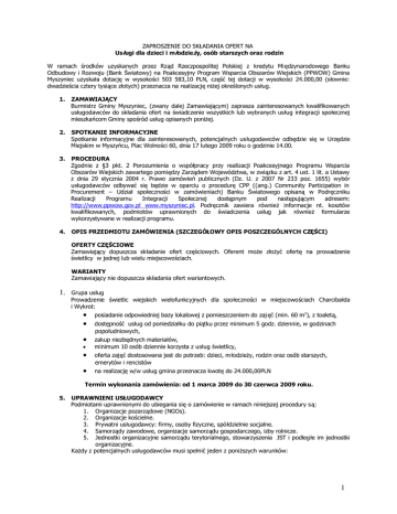 ZAPROSZENIE DO SKŁADANIA OFERT NA Usługi dla dzieci i młodzieży, osób starszych oraz rodzin W ramach środków uzyskanych przez Rząd Rzeczpospolitej Polskiej z kredytu Międzynarodowego Banku Odbudowy i Rozwoju (Bank Światowy) na Poakcesyjny Program Wsparcia Obszarów Wiejskich (PPWOW) Gmina Myszyniec uzyskała dotację w wysokości 503 583,10 PLN, część tej dotacji w wysokości 24.000,00 (słownie: dwadzieścia cztery tysiące złotych) przeznacza na realizację niżej określonych usług. 1. ZAMAWIAJĄCY Burmistrz Gminy Myszyniec, (zwany dalej Zamawiającym) zaprasza zainteresowanych kwalifikowanych usługodawców do składania ofert na świadczenie wszystkich lub wybranych usług integracji społecznej mieszkańcom Gminy spośród usług opisanych poniżej. 2. SPOTKANIE INFORMACYJNE Spotkanie informacyjne dla zainteresowanych, potencjalnych usługodawców odbędzie się w Urzędzie Miejskim w Myszyńcu, Plac Wolności 60, dnia 17 lutego 2009 roku o godzinie 14.00. 3. PROCEDURA Zgodnie z §3 pkt. 2 Porozumienia o współpracy przy realizacji Poakcesyjnego Programu Wsparcia Obszarów Wiejskich zawartego pomiędzy Zarządem Województwa, w związku z art. 4 ust. 1 lit. a Ustawy z dnia 29 stycznia 2004 r. Prawo zamówień publicznych (Dz. U. z 2007 Nr 233 poz. 1655) wybór usługodawców odbywać się będzie w oparciu o procedurę CPP ((ang.) Community Participation in Procurement – Udział społeczności w zamówieniach) Banku Światowego opisaną w Podręczniku Realizacji Programu Integracji Społecznej dostępnym pod następującym adresem: http://www.ppwow.gov.pl www.myszyniec.pl. Podręcznik zawiera również informacje nt. kosztów kwalifikowanych, podmiotów uprawnionych do świadczenia usług jak również formularze wykorzystywane w realizacji programu. 4. OPIS PRZEDMIOTU ZAMÓWIENIA (SZCZEGÓŁOWY OPIS POSZCZEGÓLNYCH CZĘŚCI) OFERTY CZĘŚCIOWE Zamawiający dopuszcza składanie ofert częściowych. Oferent może złożyć ofertę na prowadzenie świetlicy w jednej lub wielu miejscowościach. WARIANTY Zamawiający nie dopuszcza składania ofert wariantowych. 1. Grupa usług Prowadzenie świetlic wiejskich wielofunkcyjnych dla społeczności w miejscowościach Charcibałda i Wykrot: • • posiadanie odpowiedniej bazy lokalowej z pomieszczeniem do zaj ęć (min. 60 m2), z toaletą, • zakup niezbędnych materiałów, minimum 10 osób dziennie korzysta z usług świetlicy, • • • dostępność usług od poniedziałku do piątku przez minimum 5 godz. dziennie, w godzinach popołudniowych, oferta zajęć dostosowana jest do potrzeb: dzieci, m łodzieży, rodzin oraz osób starszych, emerytów i rencistów na realizację w/w usług gmina przeznacza kwotę do 24.000,00PLN Termin wykonania zamówienia: od 1 marca 2009 do 30 czerwca 2009 roku. 5. UPRAWNIENI USŁUGODAWCY Podmiotami uprawnionymi do ubiegania się o zamówienie w ramach niniejszej procedury są: 1. Organizacje pozarządowe (NGOs). 2. Organizacje kościelne. 3. Prywatni usługodawcy: firmy, osoby fizyczne, spółdzielnie socjalne. 4. Samorządy zawodowe, organizacje samorządu gospodarczego, izby rolnicze. 5. Jednostki organizacyjne samorządu terytorialnego, stowarzyszenia JST i podległe im jednostki organizacyjne. Każdy z potencjalnych usługodawców musi spełnić jeden z poniższych warunków: 1 a) usługa nie jest powtórzeniem dotychczasowego zakresu działań realizowanych przez danego usługodawcę lub też dotyczy usług świadczonych przez tego usługodawcę na rzecz dodatkowych beneficjentów, lub b) usługa będzie realizowana w partnerstwie z innymi usługodawcami 6. KRYTERIA OCENY TECHNICZNEJ 1. w odniesieniu do cz ęści I ( pkt. 4.1) a. zgodność z warunkami realizacji i zakresem zamawianych usług b. dysponowanie odpowiednią bazą lokalową (min. 60 m2) i toaletą, c. przedstawienie spójnego programu realizowanych zajęć d. poprawnie wypełniony budżet usług Zamawiający oceni spełnienie powyższych minimalnych kryteriów w oparciu o następujące dokumenty/oświadczenia: • Oświadczenie o posiadaniu pomieszczenia z wymaganym wyposażeniem • CV personelu mającego realizować usługi • Plan zajęć technicznych 7. PROCEDURY SKŁADANIA I OCENY OFERT SKŁADANIE OFERT α) β) χ) Oferty techniczno-finansowe przygotowane z użyciem formularzy załączonych do niniejszego ogłoszenia, należy składać w zaklejonej kopercie osobiście lub za pośrednictwem poczty do Urzędu Miejskiego w Myszyńcu, Plac Wolności 60; 07–430 Myszyniec w terminie do dnia 26 lutego 2009 roku do godziny 11.00 Oferta winna być ważna przez co najmniej [30] dni od daty określonej w pkt. a) Oferta winna być dostarczona w zamkniętej kopercie z dopiskiem „Oferta na świadczenie usług: [tytuł usługi taki jak w pkt. 4]”, ponadto na kopercie winny zostać umieszczone dane adresowe Usługodawcy. OCENA OFERT 1. Ocena ofert i wybór najkorzystniejszej oferty odbywa ć się będzie w 3 etapach: a. Ocena spełnienia minimalnych kryteriów technicznych określonych w pkt. 6 b. Wybór najkorzystniejszej oferty (ofert). Przy ocenie ofert, ustalaniu ich rankingu i podejmowaniu decyzji o udzieleniu zamówienia Komisja będzie brała pod uwagę zapisy przedstawionej oferty, współpracę z partnerami lokalnymi, oferowaną jakość usług ich innowacyjność, trwałość oraz ekonomiczność i efektywność działań zaproponowanych przez Usługodawcę. Negocjacje szczegółów umowy z wybranym(i) Usługodawcą (-ami) (jeśli takie negocjacje okażą się niezbędne), Ostateczna decyzja dotycząca złożonych wniosków zostanie ogłoszona w ciągu 2 tygodni od wyznaczonego terminu składania ofert, poprzez umieszczenie jej na stronie internetowej Urzędu Gminy oraz na tablicy ogłoszeń. Decyzja Zamawiającego jest ostateczna, nie wymaga uzasadnienia i nie podlega procedurom odwo ławczym. Jeśli Usługodawca nie zgadza się z decyzją Zamawiającego, winien złożyć umotywowany wniosek do Zamawiającego