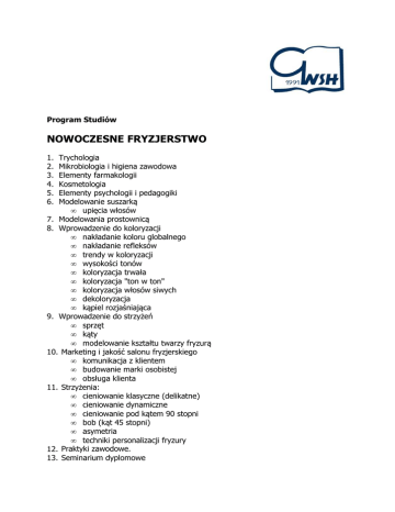 Program Studiów NOWOCZESNE FRYZJERSTWO 1. 2. 3. 4. 5. 6. Trychologia Mikrobiologia i higiena zawodowa Elementy farmakologii Kosmetologia Elementy psychologii i pedagogiki Modelowanie suszarką • upięcia włosów 7. Modelowania prostownicą 8. Wprowadzenie do koloryzacji • nakładanie koloru globalnego • nakładanie refleksów • trendy w koloryzacji • wysokości tonów • koloryzacja trwała • koloryzacja "ton w ton" • koloryzacja włosów siwych • dekoloryzacja • kąpiel rozjaśniająca 9. Wprowadzenie do strzyżeń • sprzęt • kąty • modelowanie kształtu twarzy fryzurą 10. Marketing i jakość salonu fryzjerskiego • komunikacja z klientem • budowanie marki osobistej • obsługa klienta 11. Strzyżenia: • cieniowanie klasyczne (delikatne) • cieniowanie dynamiczne • cieniowanie pod kątem 90 stopni • bob (kąt 45 stopni) • asymetria • techniki personalizacji fryzury 12. Praktyki zawodowe. 13. Seminarium dyplomowe