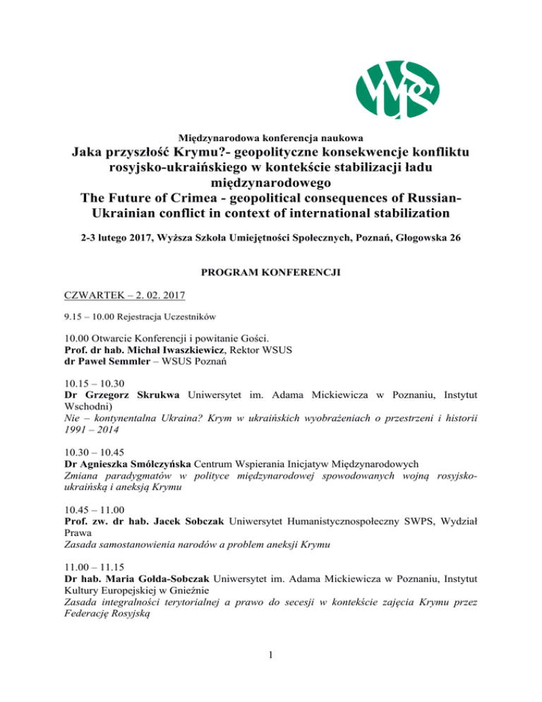 Międzynarodowa konferencja naukowa Jaka przyszłość Krymu?- geopolityczne konsekwencje konfliktu rosyjsko-ukraińskiego w kontekście stabilizacji ładu międzynarodowego The Future of Crimea - geopolitical consequences of RussianUkrainian conflict in context of international stabilization 2-3 lutego 2017, Wyższa Szkoła Umiejętności Społecznych, Poznań, Głogowska 26 PROGRAM KONFERENCJI CZWARTEK – 2. 02. 2017 9.15 – 10.00 Rejestracja Uczestników 10.00 Otwarcie Konferencji i powitanie Gości. Prof. dr hab. Michał Iwaszkiewicz, Rektor WSUS dr Paweł Semmler – WSUS Poznań 10.15 – 10.30 Dr Grzegorz Skrukwa Uniwersytet im. Adama Mickiewicza w Poznaniu, Instytut Wschodni) Nie – kontynentalna Ukraina? Krym w ukraińskich wyobrażeniach o przestrzeni i historii 1991 – 2014 10.30 – 10.45 Dr Agnieszka Smólczyńska Centrum Wspierania Inicjatyw Międzynarodowych Zmiana paradygmatów w polityce międzynarodowej spowodowanych wojną rosyjskoukraińską i aneksją Krymu 10.45 – 11.00 Prof. zw. dr hab. Jacek Sobczak Uniwersytet Humanistycznospołeczny SWPS, Wydział Prawa Zasada samostanowienia narodów a problem aneksji Krymu 11.00 – 11.15 Dr hab. Maria Gołda-Sobczak Uniwersytet im. Adama Mickiewicza w Poznaniu, Instytut Kultury Europejskiej w Gnieźnie Zasada integralności terytorialnej a prawo do secesji w kontekście zajęcia Krymu przez Federację Rosyjską 1 11.15 – 11.30 Mgr Łukasz Wolski Uniwersytet Wrocławski, Instytut Politologii Podziały socjopolityczne na Ukrainie po aneksji Krymu 11.30 – 12.00 przerwa (kawa, herbata, przekąski) 12.00 – 12.15 Prof. dr hab. Vasyl Gulay Uniwersytet Narodowy Politechnika Lwowska, Kierownik Wydziału Informacji Międzynarodowej Aneksja Krymu przez Federację Rosyjską oraz okupacja zbrojna części Obwodu Donieckiego i Ługańskiego jako mechanizmy niszczenia systemu równowagi sił w Europie ŚrodkowoWschodniej 12.15 – 12.30 Mgr Vladimir Petrov Uniwersytet Kazimierza Wielkiego w Bydgoszczy Oddziaływanie sankcji na sytuację gospodarczą Rosji 12.30 – 12.45 Mgr Kamil Pluta, Mgr Adam Starzyk Uniwersytet Wrocławski Konsekwencje konfliktu o Krym dla Ukrainy, Rosji, Europy i Świata”. 12.45 - 13.00 Dr Rafał Kęsek Uniwersytet Jagielloński w Krakowie, Katedra Ukrainoznawstwa Militaryzacja Półwyspu Krymskiego w latach 2014 – 2017 13.00 – 13.15 Mykhailo Samus Center for Army, Conversion and Disarmament Studies – Kiev, Deputy Director for International Affairs Militarization of Occupied Crimea – Threat for Europe 13.15 – 13.30 Dr Halina Czuba Uniwersytet Jagielloński w Krakowie Adaptacja społeczna weteranów ATO, członków ich rodzin oraz osób czasowo przemieszczonych na przykładzie Obwodu Lwowskiego 13.30 – 13.45 Mgr Mateusz Bartoszewicz Uniwersytet Wrocławski, Instytut Politologii Kategoria polskiej racji stanu w kontekście konfliktu rosyjsko – ukraińskiego 13.45 – 14.00 Anita Mycak Uniwersytet Warszawski, Prezes Koła Naukowego Analiz Medioznawczych Konteksty i porównania historyczne dotyczące kryzysu krymskiego w polskim publicystycznym dyskursie prasowym 14.00 – 14.30 przerwa (kawa, herbata, przekąski) 2 14.30 – 16.00 Dyskusja ekspercka Refat Chubarov Leader of Crimea Tatar National Movement in Ukraine and Worldwide, Chairman of the Mejlis of the Crimean Tatar People, Member of the Ukrainian Parliament Andrii Klymenko Chairman of the Supervisory Board and Director of the Department of Crimea of the Maidan of Foreign Affairs, Black Sea News Gulnara Bekirova Assistant Professor of History, Crimean Engineering and Pedagogical University, First Crimean Tatar TV Channel ATR Tetyana Guchakova Expert of Department of Crimea of the Maidan of Foreign Affairs, Black Sea News 16.00 – 16.45 dyskusja podsumowująca pierwszy dzień konferencji 16.45 – zakończenie pierwszego dnia konferencji 17.30 - raut dla czynnych uczestników konferencji Restauracja, Hotel Dorrian, ul. Wyspiańskiego 29 PIĄTEK, 3.02.2017 10.00 – 10.15 Nedim Useinov Coordination Council of the World Congress of Crimean Tatars, Poland Tatarzy Krymscy w myślach i czynach Ismaiła Gasprińskiego oraz Mustafy Dżemilewa 10.15 – 10.30 Mgr Maria Rajchert Uniwersytet Warszawski, Wydział Dziennkarstwa, Informacji i Bibliologii Krym pisany metaforą – wizerunek uczestników konfliktu krymskiego w polskiej prasie publicystycznej 10.30 – 10.45 Marlena Sztyber Uniwersytet Warszawski Status prawny Krymu w świetle prawa międzynarodowego i polskiej publicystyki prasowej 10.45 – 11.00 Natalia Tomaszewska Uniwersytet Wrocławski Wpływ konfliktu ukraińskiego i aneksji Krymu na stabilizację ładu międzynarodowego 11.00 – 11.15 Mgr Artur Jochlik Uniwersytet Śląski w Katowicach Ukraina w obliczu prezydentury Donalda Trumpa 3 11.15 – 11.30 Eugeniusz Kruk Uniwersytet Jagielloński w Krakowie Miejsce Krymu w świadomości narodowej i państwowej Ukrainy 11.30 – 11.45 Mgr Marlena Slomska Akademia Sztuki Wojennej Implikacje konfliktu krymskiego na stosunki Chiny – Rosja – Stany Zjednoczone. Stosunek CHRL do aneksji Krymu przez Rosję 11.45 – 12.00 Mgr Anna Piskorz Uniwersytet Przyrodniczo-Humanistyczny w Siedlcach Rola Federacji Rosyjskiej na Ukrainie i w Syryjskiej Republice Arabskiej 12.00 – 12.15 Mgr Damian Jarnicki Uniwersytet Przyrodniczo-Humanistyczny w Siedlcach Ukraiński egzamin z suwerenności. Wysiłek i przeciwności 12.15 zakończenie konferencji 12.30 Poczęstunek (kawa, herbata, przekąski) Sekretarz naukowy konferencji: dr Paweł Semmler; [email protected] 4