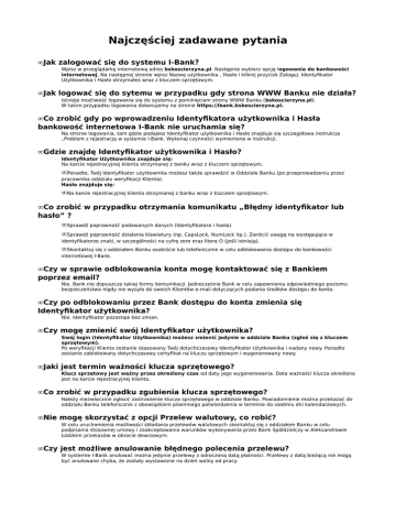 Najczęściej zadawane pytania • Jak zalogować się do systemu I-Bank? Wpisz w przeglądarkę internetową adres bskoscierzyna.pl. Następnie wybierz opcję logowania do bankowości internetowej. Na następnej stronie wpisz Nazwę użytkownika , Hasło i kliknij przycisk Zaloguj. Identyfikator Użytkownika i Hasło otrzymałeś wraz z kluczem sprzętowym. • Jak logować się do sytemu w przypadku gdy strona WWW Banku nie działa? Istnieje możliwość logowania się do systemu z pominięciem strony WWW Banku (bskoscierzyna.pl). W takim przypadku logowania dokonujemy na stronie https://ibank.bskoscierzyna.pl. • Co zrobić gdy po wprowadzeniu Identyfikatora użytkownika i Hasła bankowość internetowa I-Bank nie uruchamia się? Na stronie logowania, tam gdzie podajesz Identyfikator użytkownika i Hasło znajduje się szczegółowa instrukcja „Problem z rejestracją w systemie I-Bank. Wykonaj czynności wymienione w instrukcji. • Gdzie znajdę Identyfikator użytkownika i Hasło? Identyfikator Użytkownika znajduje się: Na karcie rejestracyjnej klienta otrzymanej z banku wraz z kluczem sprzętowym, • Ponadto, Twój Identyfikator użytkownika możesz także sprawdzić w Oddziale Banku (po przeprowadzeniu przez pracownika oddziału weryfikacji Klienta). Hasło znajduje się: • Na karcie rejestracyjnej klienta otrzymanej z banku wraz z kluczem sprzętowym. • Co zrobić w przypadku otrzymania komunikatu „Błędny identyfikator lub hasło” ? • Sprawdź poprawność podawanych danych (Identyfikatora i hasła). • Sprawdź poprawność działania klawiatury (np. CapsLock, NumLock itp.). Zwrócić uwagę na występujące w identyfikatorze znaki, w szczególności na cyfrę zero oraz literę O (jeśli istnieją). • Skontaktuj się z oddziałem Banku osobiście lub telefonicznie w celu odblokowania dostępu do bankowości internetowej I-Bank. • Czy w sprawie odblokowania konta mogę kontaktować się z Bankiem poprzez email? Nie. Bank nie dopuszcza takiej formy komunikacji. Jednocześnie Bank w celu zapewnienia odpowiedniego poziomu bezpieczeństwa nigdy nie wysyła do swoich Klientów e-mail dotyczących podania środków dostępu do konta. • Czy po odblokowaniu przez Bank dostępu do konta zmienia się Identyfikator użytkownika? Nie. Identyfikator pozostaje bez zmian. • Czy mogę zmienić swój Identyfikator użytkownika? Swój login (Identyfikator Użytkownika) możesz zmienić jedynie w oddziale Banku (zgłoś się z kluczem sprzętowym). Po weryfikacji Klienta zostanie skasowany Twój dotychczasowy Identyfikator Użytkownika i nadany nowy. Ponadto zostanie zablokowany dotychczasowy certyfikat na kluczu sprzętowym i wygenerowany nowy. • Jaki jest termin ważności klucza sprzętowego? Klucz sprzętowy jest ważny przez określony czas od daty jego wygenerowania. Data ważności klucza określona jest na karcie rejestracyjnej klienta. • Co zrobić w przypadku zgubienia klucza sprzętowego? Należy niezwłocznie zgłosić zastrzeżenie klucza sprzętowego w oddziale Banku. Powiadomienie można przekazać do oddziału Banku telefonicznie z obowiązkiem pisemnego potwierdzenia w terminie do siedmiu dni kalendarzowych. • Nie mogę skorzystać z opcji Przelew walutowy, co robić? W celu uruchomienia możliwości składania przelewów walutowych skontaktuj się z oddziałem Banku w celu podpisania stosownej umowy i zaakceptowania warunków wykonywania przez Bank Spółdzielczy w Aleksandrowie Łódzkim przekazów w obrocie dewizowym. • Czy jest możliwe anulowanie błędnego polecenia przelewu? W systemie I-Bank anulować można jedynie przelewy z odroczoną datą płatności. Przelewy z datą bieżącą nie mogą być anulowane chyba, że zostały wystawione na dzień wolny od pracy. • Dlaczego mam mniejsze dostępne środki od salda? • Dostępne środki to środki własne zgormadzone na rachunku powiększone o wysokość limitu kredytowego (jeśli posiadasz taki produkt) lub pomniejszone o kwotę zablokowaną (np.: z tytułu transakcji wykonywanej kartą płatniczą). • Saldo to środki własne zgromadzone na rachunku. • Jak wykonać przelew ZUS/US? Przelewu do ZUS lub US dokonasz za pomocą odpowiednich formularzy, które znajdują się w zakładce – Przelewy do ZUS/ Przelew do US. Do wykonania przelewu do ZUS-u i Urzędu Skarbowego wymagane są dodatkowe informacje, inne niż w przypadku przelewu standardowego. Dane wymagane do realizacji przelewu do ZUS: • nazwa skrócona lub imię i nazwisko płatnika, • NIP płatnika, • drugi identyfikator (dowód osobisty, paszport, PESEL, REGON), • typ wpłaty (np. S - składka za jeden miesiąc), • deklaracja (rok i miesiąc, np. 200912), • numer deklaracji, Dane wymagane do realizacji przelewu do Urzędu Skarbowego: • siedziba Urzędu Skarbowego, • nazwa Urzędu Skarbowego, • symbol dokumentu, • nazwa i adres zobowiązanego (płatnika), • NIP lub identyfikator uzupełniający (dowód osobisty, paszport, PESEL, REGON), • okres (np. 09M12) Przelew należy zatwierdzić kodem PIN z użyciem klucza sprzętowego. • Jak wykonać przelew z przyszłą datą realizacji? Na formatce nowego przelewu kliknij na ikonę z prawej strony Daty realizacji i wybierz odpowiednią datę.