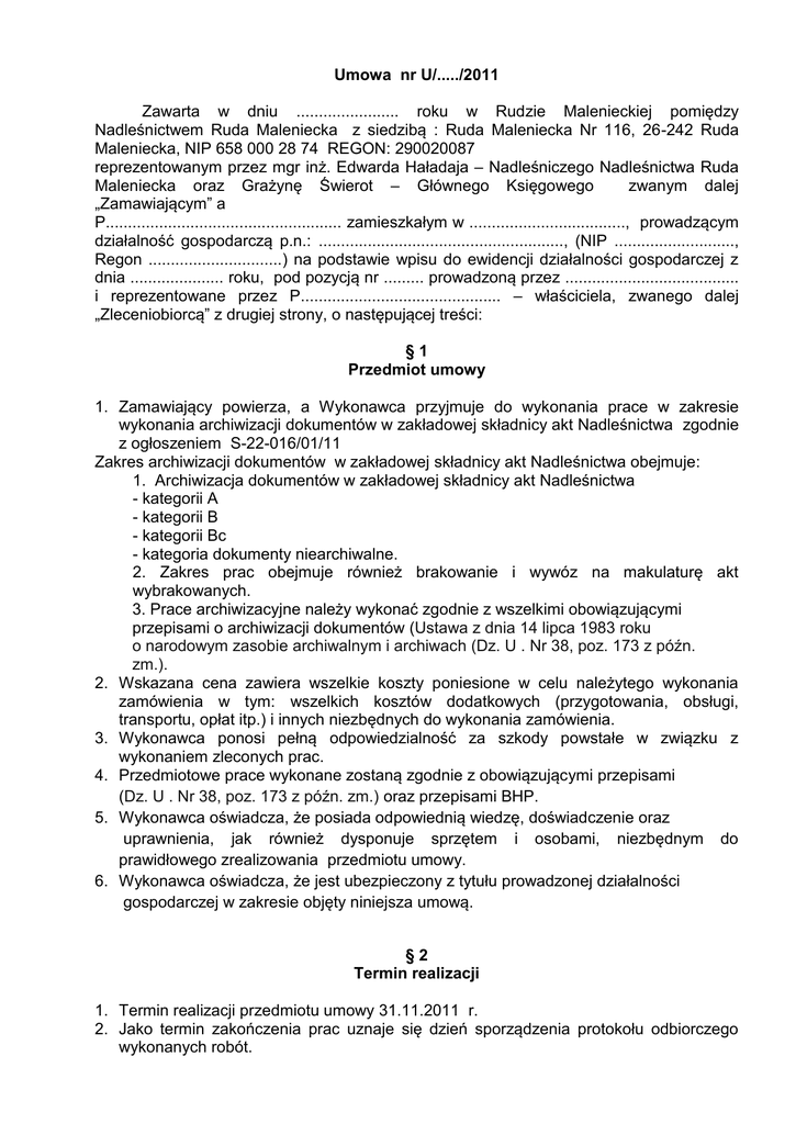 Umowa nr U/...../2011 Zawarta w dniu ....................... roku w Rudzie Malenieckiej pomiędzy Nadleśnictwem Ruda Maleniecka z siedzibą : Ruda Maleniecka Nr 116, 26-242 Ruda Maleniecka, NIP 658 000 28 74 REGON: 290020087 reprezentowanym przez mgr inż. Edwarda Haładaja – Nadleśniczego Nadleśnictwa Ruda Maleniecka oraz Grażynę Świerot – Głównego Księgowego zwanym dalej „Zamawiającym” a P..................................................... zamieszkałym w ..................................., prowadzącym działalność gospodarczą p.n.: ......................................................., (NIP ..........................., Regon ..............................) na podstawie wpisu do ewidencji działalności gospodarczej z dnia ..................... roku, pod pozycją nr ......... prowadzoną przez ....................................... i reprezentowane przez P............................................. – właściciela, zwanego dalej „Zleceniobiorcą” z drugiej strony, o następującej treści: §1 Przedmiot umowy 1. Zamawiający powierza, a Wykonawca przyjmuje do wykonania prace w zakresie wykonania archiwizacji dokumentów w zakładowej składnicy akt Nadleśnictwa zgodnie z ogłoszeniem S-22-016/01/11 Zakres archiwizacji dokumentów w zakładowej składnicy akt Nadleśnictwa obejmuje: 1. Archiwizacja dokumentów w zakładowej składnicy akt Nadleśnictwa - kategorii A - kategorii B - kategorii Bc - kategoria dokumenty niearchiwalne. 2. Zakres prac obejmuje również brakowanie i wywóz na makulaturę akt wybrakowanych. 3. Prace archiwizacyjne należy wykonać zgodnie z wszelkimi obowiązującymi przepisami o archiwizacji dokumentów (Ustawa z dnia 14 lipca 1983 roku o narodowym zasobie archiwalnym i archiwach (Dz. U . Nr 38, poz. 173 z późn. zm.). 2. Wskazana cena zawiera wszelkie koszty poniesione w celu należytego wykonania zamówienia w tym: wszelkich kosztów dodatkowych (przygotowania, obsługi, transportu, opłat itp.) i innych niezbędnych do wykonania zamówienia. 3. Wykonawca ponosi pełną odpowiedzialność za szkody powstałe w związku z wykonaniem zleconych prac. 4. Przedmiotowe prace wykonane zostaną zgodnie z obowiązującymi przepisami (Dz. U . Nr 38, poz. 173 z późn. zm.) oraz przepisami BHP. 5. Wykonawca oświadcza, że posiada odpowiednią wiedzę, doświadczenie oraz uprawnienia, jak również dysponuje sprzętem i osobami, niezbędnym do prawidłowego zrealizowania przedmiotu umowy. 6. Wykonawca oświadcza, że jest ubezpieczony z tytułu prowadzonej działalności gospodarczej w zakresie objęty niniejsza umową. §2 Termin realizacji 1. Termin realizacji przedmiotu umowy 31.11.2011 r. 2. Jako termin zakończenia prac uznaje się dzień sporządzenia protokołu odbiorczego wykonanych robót. §3 Rozliczenia 1. Wynagrodzenie za wykonanie zadania określonego w § 1 pkt.1 wynosi ................... zł netto (słownie: ...................................złoty), (brutto..........................zł). 2. Strony przyjmują zasadę, że należny podatek VAT naliczony zostanie do ceny netto na fakturze zgodnie z prawem obowiązującym w dniu wystawienia faktury. 3. Strony ustalają, że obowiązującą formą rozliczenia będzie rozliczenie za pomocą jednej faktury końcowej, przedstawionej w terminie 3 dni od dnia odbioru robót. 4. Rozliczenie o którym mowa w § 3 pkt.3 niniejszej umowy odbędzie się na podstawie końcowego protokołu odbioru robót. 5. Wynagrodzenie za wykonane roboty płatne będzie w formie przelewu na konto Wykonawcy podane na fakturze w terminie 14 dni roboczych. §4 Odstąpienie od umowy 1. Zamawiającemu przysługuje prawo do odstąpienia od umowy, gdy: a) wystąpi istotna zmiana okoliczności powodująca, ze wykonanie umowy nie leży w interesie publicznym, czego nie można było przewidzieć w chwili zawarcia umowy i Zamawiający odstąpi od umowy w terminie dwóch dni od powzięcia wiadomości o powyższych okolicznościach. W takim wypadku dostawca lub wykonawca może żądać jedynie wynagrodzenia należnego mu z tytułu wykonania części umowy. b) Wykonawca nie rozpoczął prac w terminie 5 -go dnia roboczego od daty podpisania umowy, c) wykonawca przerwał realizację prac i przerwa ta trwa dłużej niż 3 dni. d) w przypadku określonym w § 4 pkt. c Zamawiający może zlecić wykonanie umowy innemu Wykonawcy i wszelkimi kosztami z tym związanymi obciążyć Wykonawcę. 2. Odstąpienie od umowy, o którym mowa w ust. 1, powinno nastąpić w formie pisemnej i powinno zawierać uzasadnienie pod rygorem nieważności takiego oświadczenia. - W przypadku odstąpienia od umowy przez Zamawiającego z winy Wykonawcy, Wykonawcy nie przysługuje żadne wynagrodzenie, a dodatkowo zobowiązany będzie do zapłaty kar umownych określonych w § 5 umowy. §5 Kary umowne 1. W razie nienależytego wykonania lub nie wykonania przedmiotu umowy w ustalonym terminie, obowiązującą formą odszkodowania uzgodnioną między stronami będą kary umowne. 2. Wykonawca zapłaci Zamawiającemu kary umowne w następujących przypadkach: a) za nieterminową realizację przedmiotu umowy w wysokości 3 % wynagrodzeni umownego brutto za każdy dzień opóźnienia w stosunku do terminu ustalonego w § 2 ust.1, b) za nieterminowe usunięcie wszelkich błędów i wad w wysokości 3 % wynagrodzenia umownego brutto, za każdy dzień opóźnienia liczony od następnego dnia po określonym pisemnie przez Zamawiającego końcowym terminie wyznaczonym do usunięcia błędów i wad do dnia zgłoszenia pisemnego Zamawiającemu o ich usunięciu, c) w przypadku odstąpienia Zamawiającego od umowy z przyczyn wskazanych w § 4 pkt.1, ppkt.b/ lub c/ umowy, Wykonawca obowiązany będzie zapłacić w każdym wypadku na rzecz Zamawiającego karę umowną w wysokości 20 % wartości wynagrodzenia umownego brutto, określonego w § 3 ust.1. d) za nieterminowe usunięcie błędów i wad ujawnionych w trakcie odbioru części lub końcowego, 