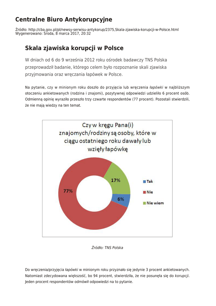 Centralne Biuro Antykorupcyjne Źródło: http://cba.gov.pl/pl/newsy-serwisu-antykorup/2375,Skala-zjawiska-korupcji-w-Polsce.html Wygenerowano: Środa, 8 marca 2017, 20:32 Skala zjawiska korupcji w Polsce W dniach od 6 do 9 września 2012 roku ośrodek badawczy TNS Polska przeprowadził badanie, którego celem było rozpoznanie skali zjawiska przyjmowania oraz wręczania łapówek w Polsce. Na pytanie, czy w minionym roku doszło do przyjęcia lub wręczenia łapówki w najbliższym otoczeniu ankietowanych (rodzina i znajomi), pozytywnej odpowiedzi udzieliło 6 procent osób. Odmienną opinię wyraziło przeszło trzy czwarte respondentów (77 procent). Pozostali stwierdzili, że nie mają wiedzy na ten temat. Źródło: TNS Polska Do wręczenia/przyjęcia łapówki w minionym roku przyznało się jedynie 3 procent ankietowanych. Natomiast zdecydowana większość, bo 94 procent, stwierdziła, że nie posunęła się do korupcji. Jeden procent respondentów odmówił odpowiedzi na to pytanie. Źródło: TNS Polska Zdaniem autorów badania, niski odsetek osób, które przyznają się lub mają wiedzę na temat przypadków korupcji może wiązać się z faktem, że jest to drażliwy temat. Ponadto drobne upominki mogą nie być postrzegane w charakterze łapówki. Badanie przeprowadzono techniką wywiadu bezpośredniego na reprezentatywnej, losowo wybranej próbie 1000 Polaków powyżej 15 roku życia. Opublikowano 1.02.2013 na www.antykorupcja.edu.pl oprac. Wydział Informacji i Edukacji Antykorupcyjnej GSz CBA
