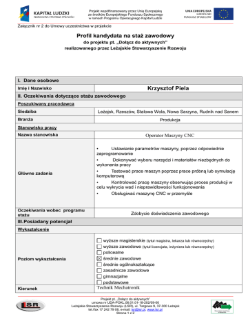 Projekt współfinansowany przez Unię Europejską ze środków Europejskiego Funduszu Społecznego w ramach Programu Operacyjnego Kapitał Ludzki Załącznik nr 2 do Umowy uczestnictwa w projekcie Profil kandydata na staż zawodowy do projektu pt. „Dołącz do aktywnych” realizowanego przez Leżajskie Stowarzyszenie Rozwoju I. Dane osobowe Imię i Nazwisko Krzysztof Piela II. Oczekiwania dotyczące stażu zawodowego Poszukiwany pracodawca Leżajsk, Rzeszów, Stalowa Wola, Nowa Sarzyna, Rudnik nad Sanem Siedziba Branża Produkcja Stanowisko pracy Nazwa stanowiska Operator Maszyny CNC • Ustawianie parametrów maszyny, poprzez odpowiednie zaprogramowanie • Dokonywać wyboru narzędzi i materiałów niezbędnych do wykonania pracy • Testować prace maszyn poprzez prace próbną lub symulację komputerową • Kontrolować pracę maszyny obserwując proces produkcji w celu wykrycia wad i nieprawidłowości funkcjonowania • Obsługiwać maszynę CNC w przemyśle Główne zadania Oczekiwania wobec programu stażu Zdobycie doświadczenia zawodowego III. Posiadany potencjał Wykształcenie Poziom wykształcenia Kierunek wyższe magisterskie (tytuł magistra, lekarza lub równorzędny) wyższe zawodowe (tytuł licencjata, inżyniera lub równorzędny) policealne średnie zawodowe średnie ogólnokształcące zasadnicze zawodowe gimnazjalne podstawowe Technik Mechatronik Projekt pt. „Dołącz do aktywnych” umowa nr UDA-POKL.06.01.01-18-202/09-00 Leżajskie Stowarzyszenie Rozwoju (LSR), ul. Targowa 9, 37-300 Leżajsk tel./fax 17 242 79 08, e-mail: [email protected], www.lsr.pl Strona 1 z 2 Projekt współfinansowany przez Unię Europejską ze środków Europejskiego Funduszu Społecznego w ramach Programu Operacyjnego Kapitał Ludzki Specjalizacja ---------------------- Zawód wyuczony Mechatronik Doświadczenie zawodowe Miejsce pracy/stażu ---------------------- Opis zadań wykonywanych ---------------------- Szkolenia i certyfikaty Szkolenia: ---------------------- Certyfikaty: ---------------------- Języki obce Poziom znajomości języków j. angielski słabo 1 2 3 4 5 biegle j. niemiecki słabo 1 2 3 4 5 biegle j. francuski słabo 1 2 3 4 5 biegle inny jaki? ……………………………… słabo 1 2 3 4 5 biegle Prawo jazdy A Kategoria B C D T BE CE DE brak Znajomość programów komputerowych Nazwa programu – poziom znajomości (słabo, dobrze, bardzo dobrze) MS Word, MS Excel,MS PowerPoint – bardzo dobrze Dodatkowe informacje Zainteresowania (np. hobby), aktywność (np. społeczna), przynależność do organizacji itp. Wędkowanie, Krwiodawstwo, Polityka, Dobra zabawa, Kręgle Projekt pt. „Dołącz do aktywnych” umowa nr UDA-POKL.06.01.01-18-202/09-00 Leżajskie Stowarzyszenie Rozwoju (LSR), ul. Targowa 9, 37-300 Leżajsk tel./fax 17 242 79 08, e-mail: [email protected], www.lsr.pl Strona 2 z 2