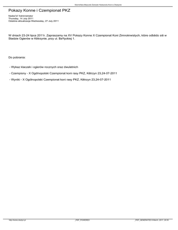Warmiñsko-Mazurski Zwi±zek Hodowców Koni w Olsztynie Pokazy Konne i Czempionat PKZ Nades³a³ Administrator Thursday, 14 July 2011 Ostatnia aktualizacja Wednesday, 27 July 2011 W dniach 23-24 lipca 2011r. Zapraszamy na XV Pokazy Konne X Czempionat Koni Zimnokrwistych, które odbêd± siê w Stadzie Ogierów w Kêtrzynie, przy ul. Ba³tyckiej 1. Do pobrania: - Wykaz klaczek i ogierów rocznych oraz dwuletnich - Czempiony - X Ogólnopolski Czempionat koni rasy PKZ, Kêtrzyn 23,24-07-2011 - Wyniki - X Ogólnopolski Czempionat koni rasy PKZ, Kêtrzyn 23,24-07-2011 http://konie.olsztyn.pl _PDF_POWERED _PDF_GENERATED 8 March, 2017, 20:35
