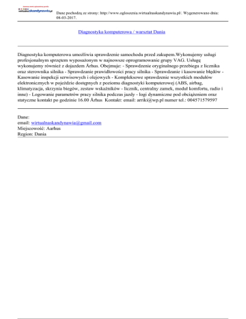 Dane pochodzą ze strony: http://www.ogloszenia.wirtualnaskandynawia.pl/. Wygenerowano dnia: 08-03-2017. Diagnostyka komputerowa / warsztat Dania Diagnostyka komputerowa umożliwia sprawdzenie samochodu przed zakupem.Wykonujemy usługi profesjonalnym sprzętem wyposażonym w najnowsze oprogramowanie grupy VAG. Usługę wykonujemy również z dojazdem Århus. Obejmuje: - Sprawdzenie oryginalnego przebiegu z licznika oraz sterownika silnika - Sprawdzanie prawidłowości pracy silnika - Sprawdzanie i kasowanie błędów Kasowanie inspekcji serwisowych i olejowych - Kompleksowe sprawdzenie wszystkich modułów elektronicznych w pojeździe dostępnych z poziomu diagnostyki komputerowej (ABS, airbag, klimatyzacja, skrzynia biegów, zestaw wskaźników - licznik, centralny zamek, moduł komfortu, radio i inne) - Logowanie parametrów pracy silnika podczas jazdy - logi dynamiczne pod obciążeniem oraz statyczne kontakt po godzinie 16.00 Århus Kontakt: email: [email protected] numer tel.: 004571579597 Dane: email: [email protected] Miejscowość: Aarhus Region: Dania