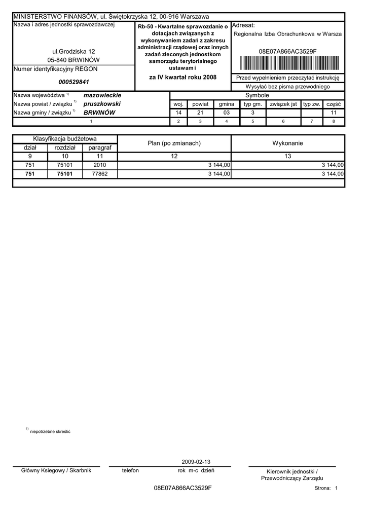 MINISTERSTWO FINANSÓW, ul. Świętokrzyska 12, 00-916 Warszawa Nazwa i adres jednostki sprawozdawczej ul.Grodziska 12 05-840 BRWINÓW Numer identyfikacyjny REGON Rb-50 - Kwartalne sprawozdanie o Adresat: dotacjach związanych z Regionalna Izba Obrachunkowa w Warsza wykonywaniem zadań z zakresu administracji rządowej oraz innych 08E07A866AC3529F zadań zleconych jednostkom samorządu terytorialnego ustawam i za IV kwartał roku 2008 000529841 Nazwa województwa 1) 1) Nazwa powiat / związku Nazwa gminy / związku 1) Przed wypełnieniem przeczytać instrukcję Wysyłać bez pisma przewodniego Symbole mazowieckie pruszkowski BRWINÓW 1 Klasyfikacja budŜetowa dział rozdział paragraf 9 10 11 woj. powiat gmina typ gm. 14 21 03 3 2 3 4 5 Plan (po zmianach) związek jst typ zw. 6 7 część 11 8 Wykonanie 12 13 751 75101 2010 3 144,00 3 144,00 751 75101 77862 3 144,00 3 144,00 1) niepotrzebne skreślić 2009-02-13 Główny Ksiegowy / Skarbnik telefon rok m-c dzień 08E07A866AC3529F Kierownik jednostki / Przewodniczący Zarządu Strona: 1 MINISTERSTWO FINANSÓW, ul. Świętokrzyska 12, 00-916 Warszawa Nazwa i adres jednostki sprawozdawczej ul.Grodziska 12 05-840 BRWINÓW Numer identyfikacyjny REGON Rb-50 - Kwartalne sprawozdanie o dotacjach związanych z wykonywaniem zadań z zakresu administracji rządowej oraz innych zadań zleconych jednostkom samorządu terytorialnego ustawam i Nazwa województwa Nazwa powiatu / związku Nazwa gminy / związku 1) 1) 08E07A866AC3529F Przed wypełnieniem przeczytać instrukcję za IV kwartał roku 2008 Wysyłać bez pisma przewodniego Symbole mazowieckie pruszkowski BRWINÓW 1 Klasyfikacja budŜetowa dział rozdział paragraf 9 10 11 zbiorczo dla działu woj. powiat gmina typ gm. 14 21 03 3 2 3 4 5 Plan (po zmianach) związek jst typ zw. 6 7 część 11 8 Wykonanie 12 751 zbiorczo dla wszystkich działów 1) Regionalna Izba Obrachunkowa w Warszawie zbiorczo 000529841 1) Adresat: 13 3 144,00 3 144,00 3 144,00 3 144,00 niepotrzebne skreślić 2009-02-13 Główny Ksiegowy / Skarbnik telefon rok m-c dzień 08E07A866AC3529F Kierownik jednostki / Przewodniczący Zarządu Strona: 2 sprawozdania Rb-50, Dział , Rozdział , BRWINÓW Wyjaśnienia do sprawozdania Rb-50 2009-02-13 Główny Ksiegowy / Skarbnik telefon 08E07A866AC3529F rok m-c dzień Kiero wnik jednostki / Prze wodniczący Zarządu Strona: 3