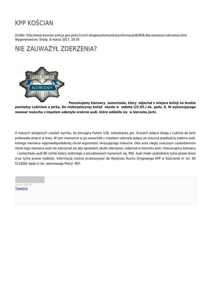 KPP KOŚCIAN Źródło: http://www.koscian.policja.gov.pl/w11/ruch-drogowy/komunikatyinformacje/62836,Nie-zauwazyl-zderzenia.html Wygenerowano: Środa, 8 marca 2017, 20:35 NIE ZAUWAŻYŁ ZDERZENIA? Poszukujemy kierowcy samochodu, który odjechał z miejsca kolizji na drodze pomiędzy Lubiniem a Jerką. Do niebezpiecznej kolizji doszło w sobotę (22.05.) ok. godz. 8. W wykonującego manewr malucha z impetem uderzyło srebrne audi, które oddaliło sie w kierunku Jerki. Z naszych wstępnych ustaleń wynika, że kierująca fiatem 126, mieszkanka gm. Krzywiń jadąca drogą z Lubinia do Jerki próbowała skręcić w lewo. W tym momencie w jej samochód z impetem uderzyło jadące ze znaczną prędkością srebrne audi, którego kierowca najprawdopodobniej chciał wyprzedzić skręcającego malucha. Oba auta uległy znacznym uszkodzeniom mimo tego kierowca audi nie zatrzymał się aby sprawdzić skutki zderzenia i odjechał w kierunku Jerki. Poszukujemy kierowcy i samochodu audi 80 combi kolory srebrnego o początkowych numerach rej, PKS. Audi miało uszkodzone tylne prawe drzwi oraz tylne prawe nadkole. Informacje można przekazywać do Wydziału Ruchu Drogowego KPP w Kościanie nr tel. 65 5116261 bądź nr tel. alarmowego Policji -997. Ocena: 0/5 (0) Tweetnij