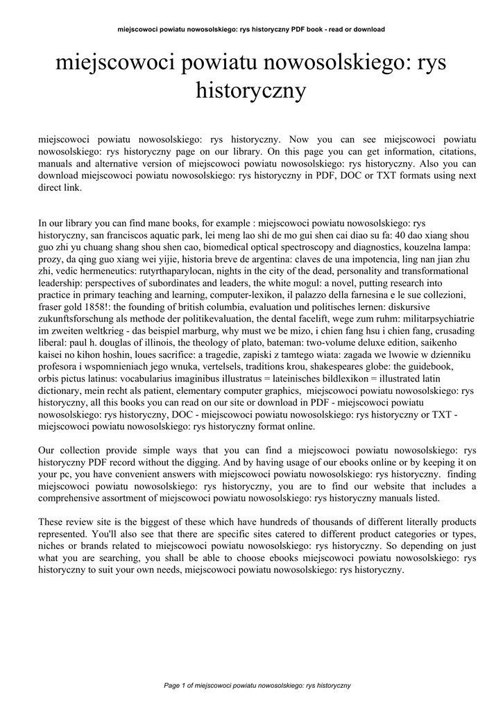 miejscowoci powiatu nowosolskiego: rys historyczny PDF book - read or download miejscowoci powiatu nowosolskiego: rys historyczny miejscowoci powiatu nowosolskiego: rys historyczny. Now you can see miejscowoci powiatu nowosolskiego: rys historyczny page on our library. On this page you can get information, citations, manuals and alternative version of miejscowoci powiatu nowosolskiego: rys historyczny. Also you can download miejscowoci powiatu nowosolskiego: rys historyczny in PDF, DOC or TXT formats using next direct link. In our library you can find mane books, for example : miejscowoci powiatu nowosolskiego: rys historyczny, san franciscos aquatic park, lei meng lao shi de mo gui shen cai diao su fa: 40 dao xiang shou guo zhi yu chuang shang shou shen cao, biomedical optical spectroscopy and diagnostics, kouzelna lampa: prozy, da qing guo xiang wei yijie, historia breve de argentina: claves de una impotencia, ling nan jian zhu zhi, vedic hermeneutics: rutyrthaparylocan, nights in the city of the dead, personality and transformational leadership: perspectives of subordinates and leaders, the white mogul: a novel, putting research into practice in primary teaching and learning, computer-lexikon, il palazzo della farnesina e le sue collezioni, fraser gold 1858!: the founding of british columbia, evaluation und politisches lernen: diskursive zukunftsforschung als methode der politikevaluation, the dental facelift, wege zum ruhm: militarpsychiatrie im zweiten weltkrieg - das beispiel marburg, why must we be mizo, i chien fang hsu i chien fang, crusading liberal: paul h. douglas of illinois, the theology of plato, bateman: two-volume deluxe edition, saikenho kaisei no kihon hoshin, loues sacrifice: a tragedie, zapiski z tamtego wiata: zagada we lwowie w dzienniku profesora i wspomnieniach jego wnuka, vertelsels, traditions krou, shakespeares globe: the guidebook, orbis pictus latinus: vocabularius imaginibus illustratus = lateinisches bildlexikon = illustrated latin dictionary, mein recht als patient, elementary computer graphics, miejscowoci powiatu nowosolskiego: rys historyczny, all this books you can read on our site or download in PDF - miejscowoci powiatu nowosolskiego: rys historyczny, DOC - miejscowoci powiatu nowosolskiego: rys historyczny or TXT miejscowoci powiatu nowosolskiego: rys historyczny format online. Our collection provide simple ways that you can find a miejscowoci powiatu nowosolskiego: rys historyczny PDF record without the digging. And by having usage of our ebooks online or by keeping it on your pc, you have convenient answers with miejscowoci powiatu nowosolskiego: rys historyczny. finding miejscowoci powiatu nowosolskiego: rys historyczny, you are to find our website that includes a comprehensive assortment of miejscowoci powiatu nowosolskiego: rys historyczny manuals listed. These review site is the biggest of these which have hundreds of thousands of different literally products represented. You'll also see that there are specific sites catered to different product categories or types, niches or brands related to miejscowoci powiatu nowosolskiego: rys historyczny. So depending on just what you are searching, you shall be able to choose ebooks miejscowoci powiatu nowosolskiego: rys historyczny to suit your own needs, miejscowoci powiatu nowosolskiego: rys historyczny. Page 1 of miejscowoci powiatu nowosolskiego: rys historyczny