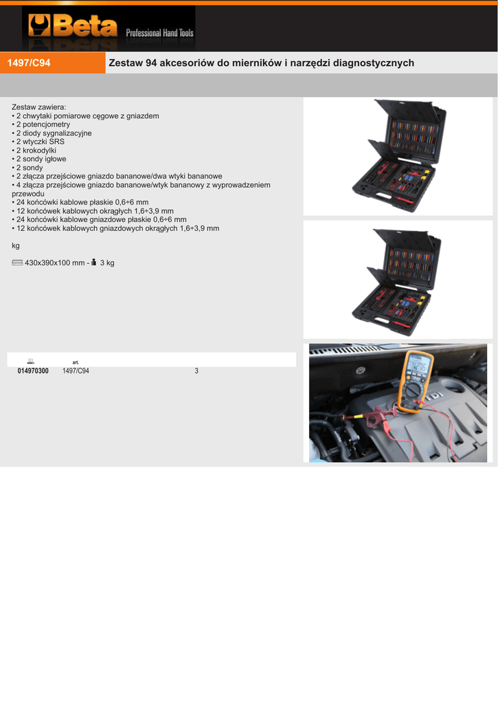 1497/C94 Zestaw 94 akcesoriów do mierników i narzędzi diagnostycznych Zestaw zawiera: • 2 chwytaki pomiarowe cęgowe z gniazdem • 2 potencjometry • 2 diody sygnalizacyjne • 2 wtyczki SRS • 2 krokodylki • 2 sondy igłowe • 2 sondy • 2 złącza przejściowe gniazdo bananowe/dwa wtyki bananowe • 4 złącza przejściowe gniazdo bananowe/wtyk bananowy z wyprowadzeniem przewodu • 24 końcówki kablowe płaskie 0,6÷6 mm • 12 końcówek kablowych okrągłych 1,6÷3,9 mm • 24 końcówki kablowe gniazdowe płaskie 0,6÷6 mm • 12 końcówek kablowych gniazdowych okrągłych 1,6÷3,9 mm kg 430x390x100 mm - 3 kg 014970300 art. 1497/C94 3