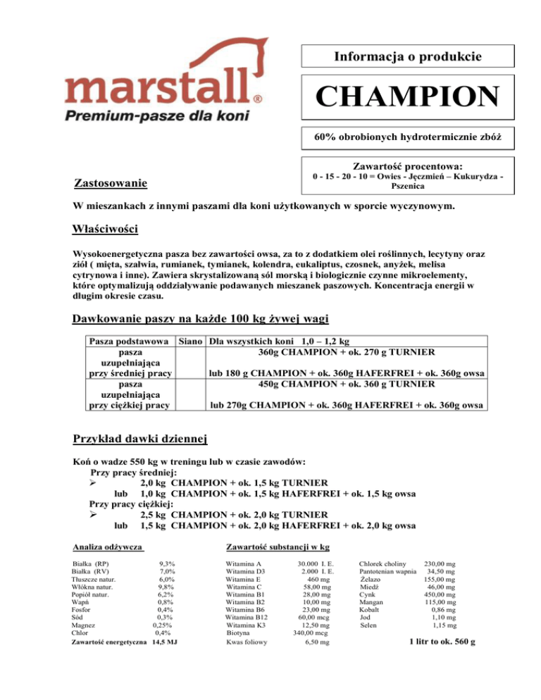 Informacja o produkcie CHAMPION 60% obrobionych hydrotermicznie zbóż Zawartość procentowa: 0 - 15 - 20 - 10 = Owies - Jęczmień – Kukurydza Pszenica Zastosowanie W mieszankach z innymi paszami dla koni użytkowanych w sporcie wyczynowym. Właściwości Wysokoenergetyczna pasza bez zawartości owsa, za to z dodatkiem olei roślinnych, lecytyny oraz ziół ( mięta, szałwia, rumianek, tymianek, kolendra, eukaliptus, czosnek, anyżek, melisa cytrynowa i inne). Zawiera skrystalizowaną sól morską i biologicznie czynne mikroelementy, które optymalizują oddziaływanie podawanych mieszanek paszowych. Koncentracja energii w długim okresie czasu. Dawkowanie paszy na każde 100 kg żywej wagi Pasza podstawowa Siano Dla wszystkich koni 1,0 – 1,2 kg pasza 360g CHAMPION + ok. 270 g TURNIER uzupełniająca przy średniej pracy lub 180 g CHAMPION + ok. 360g HAFERFREI + ok. 360g owsa pasza 450g CHAMPION + ok. 360 g TURNIER uzupełniająca przy ciężkiej pracy lub 270g CHAMPION + ok. 360g HAFERFREI + ok. 360g owsa Przykład dawki dziennej Koń o wadze 550 kg w treningu lub w czasie zawodów: Przy pracy średniej: 2,0 kg CHAMPION + ok. 1,5 kg TURNIER lub 1,0 kg CHAMPION + ok. 1,5 kg HAFERFREI + ok. 1,5 kg owsa Przy pracy ciężkiej: 2,5 kg CHAMPION + ok. 2,0 kg TURNIER lub 1,5 kg CHAMPION + ok. 2,0 kg HAFERFREI + ok. 2,0 kg owsa Analiza odżywcza Zawartość substancji w kg Białka (RP) 9,3% Białka (RV) 7,0% Tłuszcze natur. 6,0% Włókna natur. 9,8% Popiół natur. 6,2% Wapń 0,8% Fosfor 0,4% Sód 0,3% Magnez 0,25% Chlor 0,4% Zawartość energetyczna 14,5 MJ Witamina A Witamina D3 Witamina E Witamina C Witamina B1 Witamina B2 Witamina B6 Witamina B12 Witamina K3 Biotyna Kwas foliowy 30.000 I. E. 2.000 I. E. 460 mg 58,00 mg 28,00 mg 10,00 mg 23,00 mg 60,00 mcg 12,50 mg 340,00 mcg 6,50 mg Chlorek choliny Pantotenian wapnia Żelazo Miedź Cynk Mangan Kobalt Jod Selen 230,00 mg 34,50 mg 155,00 mg 46,00 mg 450,00 mg 115,00 mg 0,86 mg 1,10 mg 1,15 mg 1 litr to ok. 560 g