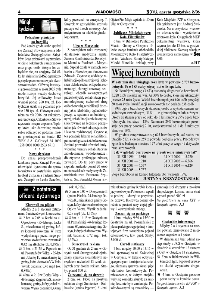 4 Min¹³ tydzieñ WIADOMOCI 4 4 Potrzebne pieni¹dze na bazylikê Pod koniec grudnia ubr. spotka³ siê Zarz¹d Stowarzyszenia Mi³oników wiêtogórskich Zabytków. Jego cz³onkami s¹ przedstawiciele lokalnych samorz¹dów oraz grupa osób, którym los zabytków nie jest obojêtny. Od kilku lat dzia³ania SMZ ograniczaj¹ siê do prac remontowych i konserwatorskich. G³ówn¹ inwestycj¹ prowadzon¹ w roku 2005 by³a modernizacja wiêby dachowej bazyliki. Jej ca³kowity koszt wynosi ponad 260 tys. z³. Dotychczas uda³o siê pozyskaæ prawie 150 tys. z³. G³ównym zadaniem na rok 2006 jest zakoñczenie renowacji. Cz³onkowie Stowarzyszenia licz¹ na wsparcie. Wp³aty, które jako darowiznê mo¿na sobie odliczyæ od podatku, mo¿na przekazywaæ na konto: BZ WBK S.A. O/Gostyñ 64 1090 1258 0000 0000 2503 6910. * * * Nowy dyrektor Do czasu przeprowadzenia konkursu przez Zarz¹d Powiatu, obowi¹zki dyrektora do spraw lecznictwa w gostyñskim szpitalu obj¹³ 2 stycznia Tadeusz Smyrek. Zast¹pi³ on Lecha Szaefera, p Z notatnika oficera dy¿urnego Kierowali po pijaku Miêdzy 2 a 8 stycznia zatrzymano 5 nietrzewych kierowców: p 2 bm. o 7:05 w Krobi na ul. Ogrodowej - 55-letniego Jacka S., mieszkañca tej gminy, który kierowa³ rowerem. W litrze wydychanego przez niego powietrza stwierdzono zawartoæ 0,42 mg alkoholu (ok. 0,89). p 3 bm. o 21:25 w Pêpowie na ul. Powstañców Wlkp. - 35-letni¹ Jolantê F., mieszkankê tej gminy, która kierowa³a VW Polo. Wynik badania: 0,46 mg/l (ok. 0,89). p 4 bm. o 9:10 w Borku Wkp. 48-letniego Zygmunta S., mieszkañca tej gminy, który jecha³ rowerem. Wynik badania: 0,43 mg/ NOWA gazeta gostyñska 2/06 który przeszed³ na emeryturê. T. Smyrek w gostyñskim szpitalu pracuje od trzech miesiêcy. Jest ordynatorem na oddziale ginekologicznym. * * * Ulga w Marysinie Z pocz¹tkiem roku rozpocz¹³ dzia³alnoæ medyczn¹ szpital Zakonu Bonifratrów w. Benedykta Menni w Piaskach - Marysinie. Szpital dzia³a w ramach kontraktu z Narodowym Funduszem Zdrowia. Czynne s¹ oddzia³y: rehabilitacji ogólnoustrojowej (schorzeñ uk³adu ruchu, ortopedii, reumatologii, chirurgii urazowej, neurologii, chorób wewnêtrznych przewlek³ych), rehabilitacji pulmonologicznej (schorzeñ dróg oddechowych), rehabilitacji dziennej (jak w rehabilitacji ogólnoustrojowej, w systemie ambulatoryjnym), rehabilitacji ambulatoryjnej (skierowanie na leczenie poszpitalne, jak równie¿ od specjalistów i lekarza rodzinnego). Czynne s¹ te¿ poradnie lekarza rehabilitacji, pulmonologiczna i zio³olecznicza. Szpital prowadzi równie¿ indywidualne turnusy rehabilitacyjne zio³olecznicze, wodolecznicze i dietetyczne preferuj¹c zdrow¹ ¿ywnoæ. Do tej pory pracê w szpitalu znalaz³o ponad 20 osób na stanowiskach medycznych. Zatrudnianie trwa. Patronami Szpitala s¹: w. Benedykt Menni i w. Ojciec Pio. Misja szpitala to Dom Ulgi w Cierpieniu. * * * Jubileusz M³odzie¿owego Ko³a Filatelistów 6 bm. w Bibliotece Publicznej Miasta i Gminy w Gostyniu 10lecie swego istnienia obchodzi³o M³odzie¿owe Ko³o Filatelistyczne im. Wac³awa Boratyñskiego. M³odzi filatelici dzia³aj¹ przy l (ok. 0,91). p 5 bm. o 0:05 w Drzêczewie II (gmina Piaski) - 24-letniego Dawida K., mieszkañca gminy Gostyñ, który kierowa³ osobowym Oplem Vectr¹. Wynik badania: 0,55 mg/l (ok. 1,16). p 8 bm. o 14:15 w Gostyniu na ul. Poznañskiej - 44-letniego Romana W., mieszkañca gminy Gostyñ, który jecha³ rowerem. Wynik badania: 0,72 mg/l (ok. 1,52). Niszczyciel reklam Od 31 grudnia do 2 bm. w Gostyniu na ul. Starogostyñskiej nieznany sprawca nieustalonym narzêdziem uszkodzi³ 13 sztuk stoj¹cych przy drodze reklam. Straty: ponad 800 z³. Zatrzyma³ siê na drzewie 2 bm. ok. 18:40 na prostym odcinku drogi Gumienice - Babkowice (gmina Pêpowo) 21-letni mieszkaniec gminy Krobia kieruj¹cy osobowym Polonezem wpad³ w polizg i uderzy³ w przydro¿ne drzewo. Kierowca dozna³ obra¿eñ w postaci rany ciêtej g³owy i wstrz¹nienia mózgu. Zaczai³ siê na parkingu 4 bm. miêdzy 9:30 a 15:30 w Gostyniu na ul. Poznañskiej z placu parkingowego jednej z tamtejszych firm skradziono pojazd czteroko³owy, tzw. quad. Straty: 5.000 z³. Okrad³ siatkarzy 7 bm. miêdzy 10:00 a 13:15 w hali sportowej na ul. Kocielnej w Gostyniu, w trakcie odbywaj¹cego siê tam turnieju siatkarskiego, nieznany sprawca skrad³ piêæ telefonów komórkowych. Pomieszczenie, w którym znajdowa³y siê komórki, s³u¿y³o za szatniê, lecz nie by³o zamkniête. Poszkodowanymi s¹ zawodnicy Kole Miejskim PZF w Gostyniu. Ich opiekunem jest Andrzej widurski. Na uroczystoci wrêczono odznaczenia i wyró¿nienia cz³onkom ko³a. Osi¹gniêcia MKF dokumentuje wystawa, która czynna jest do 13 bm. w gostyñskiej bibliotece. Szersz¹ relacjê z uroczystoci zamiecimy w Ngg 3/06. o-HF Wiêcej bezrobotnych W ostatnim dniu ubieg³ego roku by³o w powiecie 5.737 bezrobotnych. To o 183 osoby wiêcej ni¿ w listopadzie. Najliczniejsz¹ grupê (3.673) stanowi¹ d³ugotrwale bezrobotni. 3.228 osób mieszka na wsi. A¿ 30% to osoby, które nie ukoñczy³y jeszcze 25 roku ¿ycia. Wród bezrobotnych jest 696 osób powy¿ej 50 roku ¿ycia, kwalifikacji zawodowych nie posiada 638 osób. 39% ogó³u bezrobotnych stanowi¹ osoby z wykszta³ceniem zasadniczym zawodowym, 31% z gimnazjalnym lub ni¿szym. Osoby ze sta¿em pracy od roku do 5 lat stanowi¹ 29% ogó³u bezrobotnych, bez sta¿u - 18%. Natomiast 29% bezrobotnych pozostaje bez pracy powy¿ej 2 lat, zarejestrowani od 1 do 3 miesiêcy stanowi¹ 19%. W grudniu zarejestrowa³o siê 695 bezrobotnych, za status ten utraci³o 512, z czego 259 z powodu podjêcia pracy. Pracodawcy zg³osili w badanym miesi¹cu 127 ofert pracy, z czego 49 dotyczy³o prac sezonowych. Jak wygl¹da³o bezrobocie na przestrzeniu minionych lat? 31 XII 1999 4.910 31 XII 2000 5.220 31 XII 2001 6.210 31 XII 2002 6.866 31 XII 2003 6.577 31 XII 2004 6.129 31 XII 2005 5.737 Stopa bezrobocia na koniec listopada ubr. wynosi³a 17%. JUSTYNA KRZY¯OST