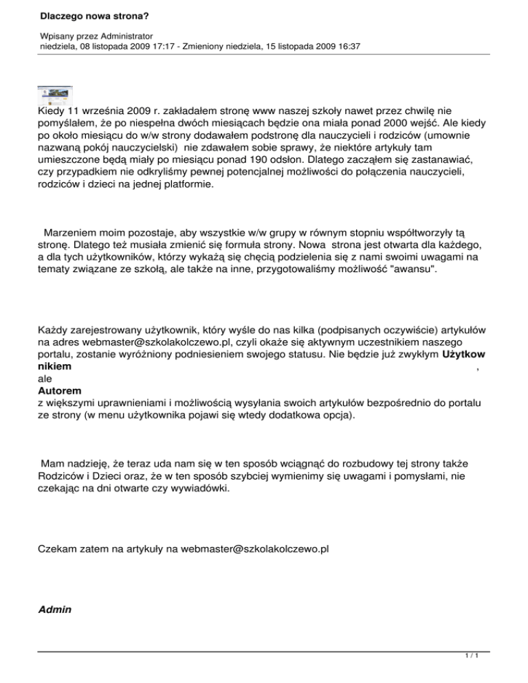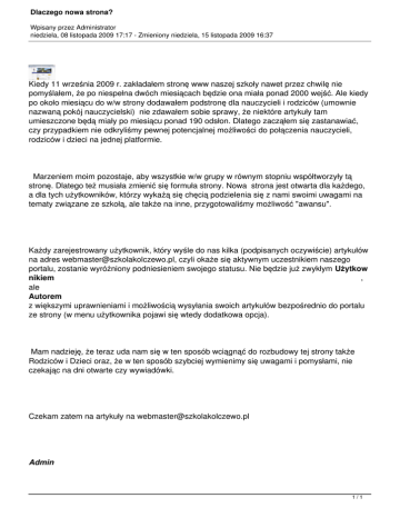 Dlaczego nowa strona? Wpisany przez Administrator niedziela, 08 listopada 2009 17:17 - Zmieniony niedziela, 15 listopada 2009 16:37 Kiedy 11 września 2009 r. zakładałem stronę www naszej szkoły nawet przez chwilę nie pomyślałem, że po niespełna dwóch miesiącach będzie ona miała ponad 2000 wejść. Ale kiedy po około miesiącu do w/w strony dodawałem podstronę dla nauczycieli i rodziców (umownie nazwaną pokój nauczycielski) nie zdawałem sobie sprawy, że niektóre artykuły tam umieszczone będą miały po miesiącu ponad 190 odsłon. Dlatego zacząłem się zastanawiać, czy przypadkiem nie odkryliśmy pewnej potencjalnej możliwości do połączenia nauczycieli, rodziców i dzieci na jednej platformie. Marzeniem moim pozostaje, aby wszystkie w/w grupy w równym stopniu współtworzyły tą stronę. Dlatego też musiała zmienić się formuła strony. Nowa strona jest otwarta dla każdego, a dla tych użytkowników, którzy wykażą się chęcią podzielenia się z nami swoimi uwagami na tematy związane ze szkołą, ale także na inne, przygotowaliśmy możliwość "awansu". Każdy zarejestrowany użytkownik, który wyśle do nas kilka (podpisanych oczywiście) artykułów na adres [email protected], czyli okaże się aktywnym uczestnikiem naszego portalu, zostanie wyróżniony podniesieniem swojego statusu. Nie będzie już zwykłym Użytkow nikiem , ale Autorem z większymi uprawnieniami i możliwością wysyłania swoich artykułów bezpośrednio do portalu ze strony (w menu użytkownika pojawi się wtedy dodatkowa opcja). Mam nadzieję, że teraz uda nam się w ten sposób wciągnąć do rozbudowy tej strony także Rodziców i Dzieci oraz, że w ten sposób szybciej wymienimy się uwagami i pomysłami, nie czekając na dni otwarte czy wywiadówki. Czekam zatem na artykuły na [email protected] Admin 1/1