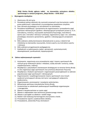 Wójt Gminy Brody ogłasza nabór na stanowisko animatora obiektu sportowego w ramach programu „Moje Boisko – Orlik 2012” I. Wymagania niezbędne: 1. Ukończony 18 rok życia. 2. Posiadanie pełnej zdolności do czynności prawnych oraz korzystanie z pełni praw publicznych, niekaralność za przestępstwa popełnione umyślnie. 3. Stan zdrowia pozwalający na zatrudnienie na stanowisku. 4. Posiadane kwalifikacje i uprawnienia do organizowania i prowadzenia zajęć sportowo-rekreacyjnych zgodnie z obowiązującymi przepisami prawa tj. m.in. instruktorzy, trenerzy, nauczyciele wychowania fizycznego, instruktorzy sportu (ew. instruktor rekreacji ruchowej), organizatorzy zajęć i ew. zawodów, posiadający stosowne uprawnienia, zgodnie z obowiązującymi przepisami prawa. 5. Mile widziane udokumentowane doświadczenie w pracy z dziećmi lub młodzieżą na stanowisku nauczyciela, trenera sportu czy instruktora sportu i rekreacji. 6. Mile widziane przygotowanie pedagogiczne. 7. Dokładność w wykonywaniu zadań, uprzejmość, systematyczność, obowiązkowość, punktualność, dyspozycyjność. II. Zakres wykonywanych czynności: 1. Inicjowanie, organizacja oraz prowadzenie zajęć i imprez sportowych dla różnych grup wiekowych (dzieci i młodzież, osoby dorosłe i seniorzy, osoby niepełnosprawne, rodziny). 2. Współpraca z placówkami oświatowymi działającymi na terenie Gminy Brody w celu organizacji zajęć sportowych oraz promocji aktywności fizycznej. 3. Współpraca z klubami sportowymi i organizacjami pozarządowymi w zakresie popularyzacji zajęć sportowych i rekreacyjnych. 4. Organizowanie i współorganizowanie imprez sportowych oraz innych wydarzeń promujących zdrowy styl życia i sprzyjających wyłączeniu społecznemu. 5. Organizowanie, promowanie i rozwijanie wolontariatu. 6. Aktywizacja sportowa mieszkańców Gminy Brody. 7. Uczestnictwo w szkoleniach podnoszących kwalifikacje organizacyjne i managerskie. 8. Dbanie o bezpieczeństwo w czasie zajęć. 9. Dbanie o odpowiedni stan techniczny powierzonego mienia. 10. Dbanie o porządek na obiekcie i wokół niego. 11. Nadzór nad realizacją harmonogramu korzystania z boisk. 12. Prowadzenie rejestru użytkowników obiektu. 13. Prowadzenie „Dziennika Pracy Animatora". III. Wymagane dokumenty: 1. Życiorys (CV) wraz z podpisaną klauzulą „Wyrażam zgodę na przetwarzanie danych osobowych zawartych w ofercie pracy dla potrzeb niezbędnych do realizacji procesu rekrutacji (zgodnie z ustawa z dnia 29.08.97r. o ochronie danych osobowych (t. j. Dz .U z 2014r., poz.1182 z późń. zm.).” 2. Kserokopie pierwszych stron dowodu osobistego do informacji o zameldowaniu lub kserokopia nowego dowodu osobistego. 3. Kserokopie dokumentów potwierdzających kwalifikacje w odniesieniu do punktu I ustęp 4) niniejszego ogłoszenia. 4. Kserokopie świadectw pracy w przypadku posiadania stażu pracy. 5. Dokumenty poświadczające doświadczenie zawodowe w zakresie organizowania i prowadzenia zajęć sportowo-rekreacyjnych. 6. Oświadczenie o braku przeciwwskazań zdrowotnych do wykonywania zadań animatora i oświadczenie o posiadaniu pełnej zdolności do czynności prawnych oraz korzystaniu w pełni z praw publicznych – załącznik nr 1. 7. Oświadczenie kandydata na Animatora – załącznik nr 2. 8. Program planowanych do realizacji przez Animatora działań – załącznik nr 3. IV. Miejsce wykonywania pracy – Boisko ORLIK w Brodach ul. Sportowa 1. V. Forma i okres zatrudnienia - Umowa zlecenie w okresie od 1 marca do 30 listopada 2015 r. VI. Sposób i termin składania ofert: 1. Oferty należy składać w zamkniętych kopertach w terminie do 30 stycznia 2015 r. do godz. 15:00 w Urzędzie Gminy Brody ul. Rynek 2, z dopiskiem „Animator - Moje Boisko - Orlik 2012". 2. Oferty złożone po terminie nie będą rozpatrywane. 3. Dokumentów nie odsyłamy. 4. Informacja o wyniku naboru zawierająca imię i nazwisko oraz miejsce zamieszkania wyłonionych kandydatów będzie umieszczana na stronie internetowej Biuletynu Informacji Publicznej (http://bip.brody.pl). 5. Informacji o naborze udziela Halina Wysługocka – sekretarz gminy tel. 68 3712205. VII. Informacje dodatkowe 1. Wójt Gminy Brody zastrzega sobie prawo rozstrzygnięcia naboru i podpisania umowy z chwilą uzyskania dofinansowania w ramach projektu „Animator Moje Boisko ORLIK 2012" w 2015 r. 2. Zostaną zatrudnione 2 osoby na podstawie umowy zlecenia zawartej pomiędzy Dysponentem środków Funduszu Rozwoju Kultury (I umowa zlecenia obejmująca 40 h zajęć miesięcznie) oraz z Urzędem Gminy Brody (II umowa zlecenia obejmująca 40 h zajęć miesięcznie) albo 1 osoba na podstawie umowy zlecenia zawartej pomiędzy Dysponentem środków Funduszu Rozwoju Kultury (I umowa zlecenia obejmująca 80 h zajęć miesięcznie ) oraz z Urzędem Gminy Brody (II umowa zlecenia obejmująca 80 h zajęć miesięcznie). 3. Praca będzie wykonywana w godzinach popołudniowych we wszystkie dni tygodnia. Wójt (-) Ryszard Kowalczuk