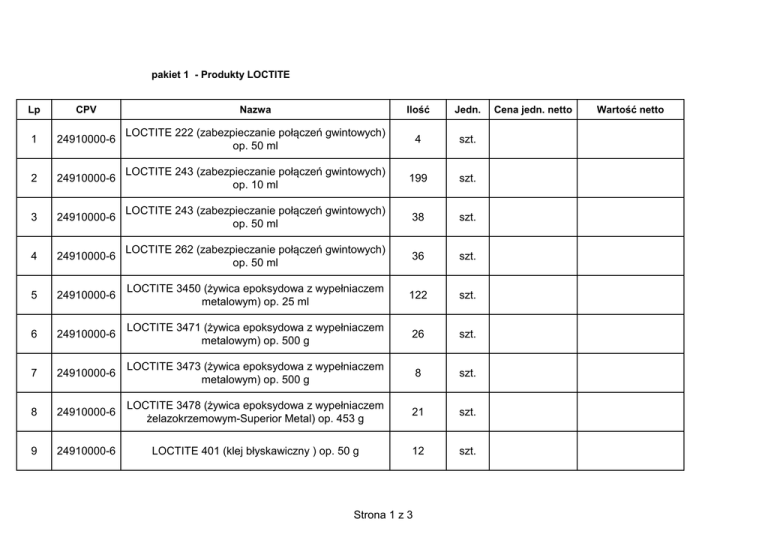pakiet 1 - Produkty LOCTITE Lp CPV Nazwa Ilość Jedn. 1 24910000-6 LOCTITE 222 (zabezpieczanie połączeń gwintowych) op. 50 ml 4 szt. 2 24910000-6 LOCTITE 243 (zabezpieczanie połączeń gwintowych) op. 10 ml 199 szt. 3 24910000-6 LOCTITE 243 (zabezpieczanie połączeń gwintowych) op. 50 ml 38 szt. 4 24910000-6 LOCTITE 262 (zabezpieczanie połączeń gwintowych) op. 50 ml 36 szt. 5 24910000-6 LOCTITE 3450 (żywica epoksydowa z wypełniaczem metalowym) op. 25 ml 122 szt. 6 24910000-6 LOCTITE 3471 (żywica epoksydowa z wypełniaczem metalowym) op. 500 g 26 szt. 7 24910000-6 LOCTITE 3473 (żywica epoksydowa z wypełniaczem metalowym) op. 500 g 8 szt. 8 24910000-6 LOCTITE 3478 (żywica epoksydowa z wypełniaczem żelazokrzemowym-Superior Metal) op. 453 g 21 szt. 9 24910000-6 LOCTITE 401 (klej błyskawiczny ) op. 50 g 12 szt. Strona 1 z 3 Cena jedn. netto Wartość netto 10 24910000-6 LOCTITE 406 (klej błyskawiczny) op. 20 g 472 szt. 11 24910000-6 LOCTITE 406 (klej błyskawiczny) op. 50 g 168 szt. 12 24910000-6 LOCTITE 460 (klej błyskawiczny) op. 20 g 62 szt. 13 24910000-6 LOCTITE 480 (klej blyskawiczny - wzmocniony, czarny, szybko sie utwardzajacy) op. 20 g 23 szt. 14 24910000-6 LOCTITE 510 (uszczelniacz metalowych złączy kołnierzowych) op. 250 ml 12 szt. 15 24910000-6 LOCTITE 572 (uszczelniacz połączeń gwintowych) op. 250 ml 3 szt. 16 24910000-6 LOCTITE 577 (uszczelniacz połączeń gwintowych) op. 250 ml 23 szt. 17 24910000-6 LOCTITE 595 (silikon bezbarwny) op. 315 ml 44 szt. 18 24910000-6 LOCTITE 603 op. 50 ml 3 szt. 19 24910000-6 LOCTITE 620 (mocowanie części współosiowych) op. 50 ml 12 szt. 20 24910000-6 LOCTITE 638 (trudno demontowalny produkt do mocowania ogólnego zastosowania) op. 50 ml 12 szt. Strona 2 z 3 21 24910000-6 LOCTITE 660 (mocowanie części współosiowych) op. 50 ml 10 szt. 22 24910000-6 LOCTITE 7039 (zmywacz do styków elektrycznych) op. 400 ml 9 szt. 23 24911200-5 LOCTITE 7061 (środek odtłuszczacjący do metali) op.400 ml 42 szt. 24 24910000-6 LOCTITE 8021 (olej silikonowy ) spray 400 ml 8 szt. 25 24911200-5 LOCTITE 8151 (zabezpieczenie połączeń gwintowych, zapobiegający zacieraniu i korozji) op. 150 ml aerozol 12 szt. suma Strona 3 z 3