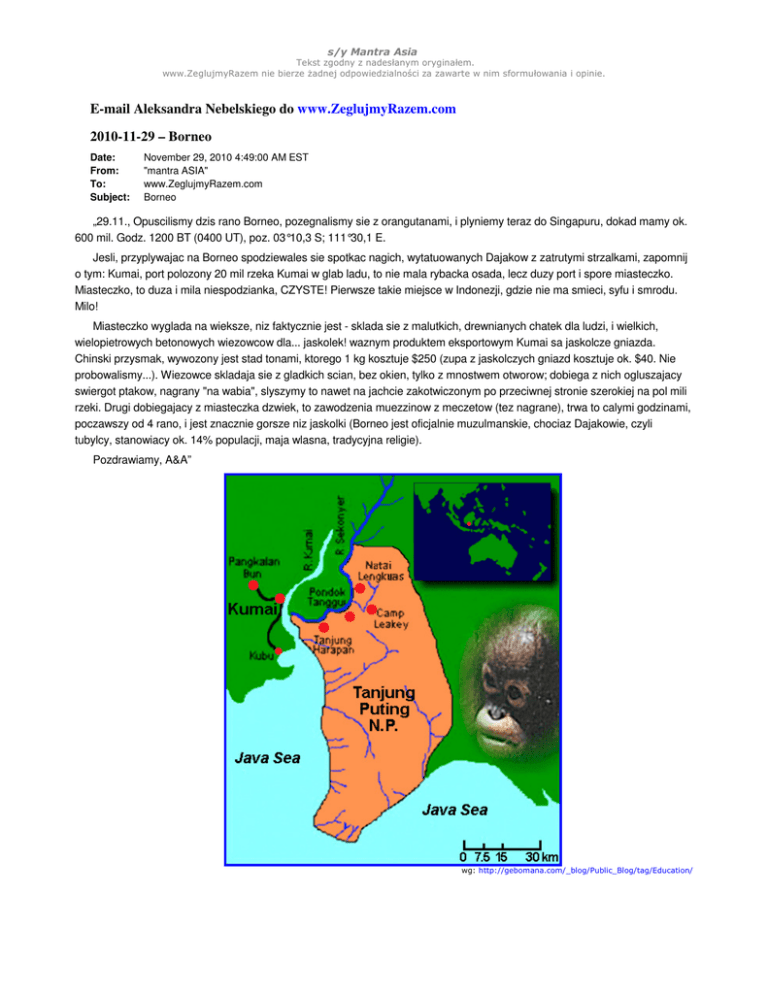 s/y Mantra Asia Tekst zgodny z nadesłanym oryginałem. www.ZeglujmyRazem nie bierze żadnej odpowiedzialności za zawarte w nim sformułowania i opinie. E-mail Aleksandra Nebelskiego do www.ZeglujmyRazem.com 2010-11-29 – Borneo Date: From: To: Subject: November 29, 2010 4:49:00 AM EST "mantra ASIA" www.ZeglujmyRazem.com Borneo „29.11., Opuscilismy dzis rano Borneo, pozegnalismy sie z orangutanami, i plyniemy teraz do Singapuru, dokad mamy ok. 600 mil. Godz. 1200 BT (0400 UT), poz. 03°10,3 S; 111°30,1 E. Jesli, przyplywajac na Borneo spodziewales sie spotkac nagich, wytatuowanych Dajakow z zatrutymi strzalkami, zapomnij o tym: Kumai, port polozony 20 mil rzeka Kumai w glab ladu, to nie mala rybacka osada, lecz duzy port i spore miasteczko. Miasteczko, to duza i mila niespodzianka, CZYSTE! Pierwsze takie miejsce w Indonezji, gdzie nie ma smieci, syfu i smrodu. Milo! Miasteczko wyglada na wieksze, niz faktycznie jest - sklada sie z malutkich, drewnianych chatek dla ludzi, i wielkich, wielopietrowych betonowych wiezowcow dla... jaskolek! waznym produktem eksportowym Kumai sa jaskolcze gniazda. Chinski przysmak, wywozony jest stad tonami, ktorego 1 kg kosztuje $250 (zupa z jaskolczych gniazd kosztuje ok. $40. Nie probowalismy...). Wiezowce skladaja sie z gladkich scian, bez okien, tylko z mnostwem otworow; dobiega z nich ogluszajacy swiergot ptakow, nagrany "na wabia", slyszymy to nawet na jachcie zakotwiczonym po przeciwnej stronie szerokiej na pol mili rzeki. Drugi dobiegajacy z miasteczka dzwiek, to zawodzenia muezzinow z meczetow (tez nagrane), trwa to calymi godzinami, poczawszy od 4 rano, i jest znacznie gorsze niz jaskolki (Borneo jest oficjalnie muzulmanskie, chociaz Dajakowie, czyli tubylcy, stanowiacy ok. 14% populacji, maja wlasna, tradycyjna religie). Pozdrawiamy, A&A” wg: http://gebomana.com/_blog/Public_Blog/tag/Education/ s/y Mantra Asia 2 wg: http://www.kutztown.edu/kumunc/img/scsmap.jpg
