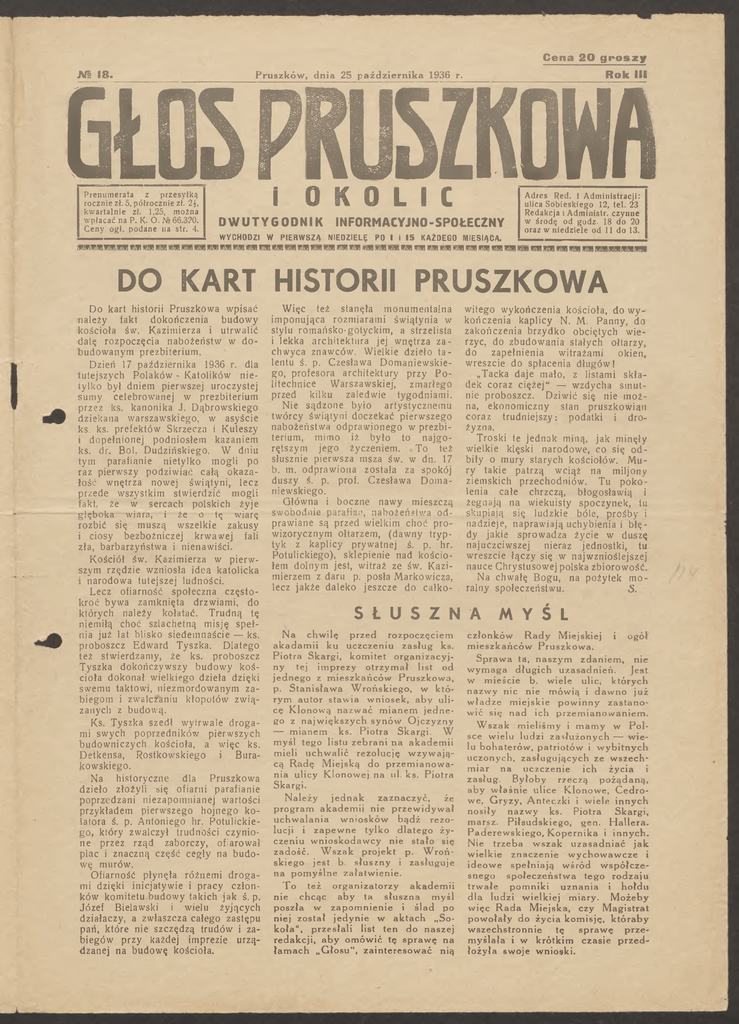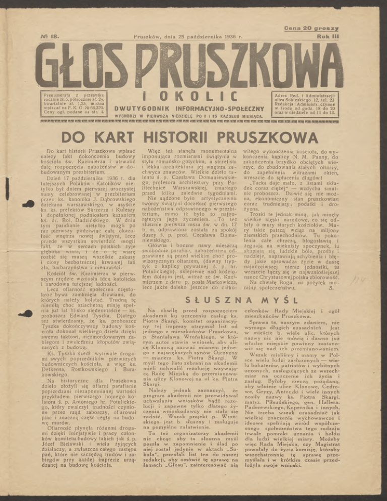 Cena 20 g r o s z y Жй m . R o k III Pruszków , dnia 25 p aźd ziern ik a 1936 r. GŁOS PRUSZKOWA Prenumerata z przesyłką rocznie zł. 5, półrocznie zł. 2£, kwartalnie zł. 1,25, można wpłacać па P. K- O. № 66,320. Ceny ogł, podane na str. 4. i O K O L I C D WU T Y G O D N I K W YCHODZI W PIER W SZA INFORMACYJNO -SPOŁECZNY NIEDZIELĘ PO I I 1 5 KAŻDEGO MIESIĄCA. Adres Red. i Administracji: ulica Sobieskiego 12, tel. 23 Redakcja i Administr. czynne w środę od godz. 18 do 20 oraz w niedziele od 11 do 13. ейпШГИШііІШ SlflSIwllffl flHfl wffl.wnfl wsnłl łlWI ffliWIWIWlłllWIЛШJłllłti winił ŃIMłnirri ХІМІ ?fMtf!W! fłilffl wilii тля; ffilfił W iTW IMłrthwirtfl miWSM ШИ Kffiłl W TUfl RinnШИ1ТШКЩѴПИffM IW IIW iiffl!ff)IW IIRI!W lfflł DO KART HISTORII PRUSZKOWA Do kart historii Pruszkowa wpisać należy fakt dokończenia budowy kościoła św. Kazimierza i utrwalić datę rozpoczęcia nabożeństw w do budowanym prezbiterium. Dzień 17 października 1936 r. dla tutejszych Polaków - Katolików nietylko był dniem pierwszej uroczystej sumy celebrowanej w prezbiterium przez ks. kanonika J. Dąbrowskiego dziekana warszawskiego, w asyście ks. ks. prefektów Skrzeczą i Kuleszy i dopełnionej podniosłem kazaniem ks. dr. Boi. Dudzińskiego. W dniu tym parafianie nietylko mogli po raz pierwszy podziwiać całą okaza łość wnętrza nowej świątyni, lecz przede wszystkim stwierdzić mogli fakt. że w sercach polskich żyje głęboka wiara, i że o tę wiarę rozbić się muszą wszelkie zakusy i ciosy bezbożniczej krwawej fali zła, barbarzyństwa i nienawiści. Kościół św. Kazimierza w pierw szym rzędzie wzniosła idea katolicka i narodowa tutejszej ludności. Lecz ofiarność społeczna często kroć bywa zamknięta drzwiami, do których należy kołatać. Trudną tę niemiłą choć szlachetną misję speł nia już lat blisko siedemnaście — ks. proboszcz Edward Tyszka. Dlatego też stwierdzamy, że ks. proboszcz Tyszka dokończywszy budowy koś cioła dokonał wielkiego dzieła dzięki swemu taktowi, niezmordowanym za biegom i zwalczaniu kłopotów zwią zanych z budową. Ks. Tyszka szedł wytrwale droga mi swych poprzedników pierwszych budowniczych kościoła, a więc ks. Detkensa, Rostkowskiego i Bura kowskiego. Na historyczne dla Pruszkowa dzieło złożyli się ofiarni parafianie poprzedzani niezapomnianej wartości przykładem pierwszego hojnego ko latora ś. p. Antoniego hr. Potulickiego, który zwalczył trudności czynio ne przez rząd zaborczy, ofiarował plac i znaczną część cegły na budo wę murów. Ofiarność płynęła różnemi droga mi dzięki inicjatywie i pracy człon ków komitetu budowy takich jak ś. p. Józef Bielawski i wielu żyjących działaczy, a zwłaszcza całego zastępu pań, które nie szczędzą trudów i za biegów przy każdej imprezie urzą dzanej na budowę kościoła. Więc też stanęła monumentalna imponująca rozmiarami świątynia w stylu romańsko-gotyckim, a strzelista i lekka architektura jej wnętrza za chwyca znawców. Wielkie dzieło ta lentu ś. p. Czesława Domaniewskie go, profesora architektury przy Po litechnice Warszawskiej, zmarłego przed kilku zaledwie tygodniami. Nie sądzone było artystycznemu twórcy świątyni doczekać pierwszego nabożeństwa odprawionego w prezbi terium, mimo iż było to najgo rętszym jego życzeniem. To też słusznie pierwsza msza św. w dn. 17 b. m. odprawiona została za spokój duszy ś. p. prof. Czesława Doma niewskiego. Główna i boczne nawy mieszczą swobodnie parafian, nabożeństwa od prawiane są przed wielkim choć pro wizorycznym ołtarzem, (dawny tryp tyk z kaplicy prywatnej ś. p. hr. Potulickiego), sklepienie nad kościo łem dolnym jest, witraż ze św. Kazi mierzem z daru p. posła Markowicza, lecz jakże daleko jeszcze do całko- witego wykończenia kościoła, do wy kończenia kaplicy N. M. Panny, do zakończenia brzydko obciętych wie rzyć, do zbudowania stałych ołtarzy, do zapełnienia witrażami okien, wreszcie do spłacenia długów! „Tacka daje mało, z listami skła dek coraz ciężej" — wzdycha smut nie proboszcz. Dziwić się nie moż na, ekonomiczny stan pruszkowian coraz trudniejszy: podatki i dro żyzna. Troski te jednak miną, jak minęły wielkie klęski narodowe, co się od biły o mury starych kościołów. Mu ry takie patrzą wciąż na miljony ziemskich przechodniów. Tu poko lenia całe chrzczą, błogosławią i żegnają na wiekuisty spoczynek, tu skupiają się ludzkie bóle, prośby i nadzieje, naprawiają uchybienia i błę dy jakie sprowadza życie w duszę najuczciwszej nieraz jednostki, tu wreszcie łączy się w najwznioślejszej nauce Chrystusowej polska zbiorowość. Na chwałę Bogu, na pożytek mo ralny społeczeństwu. 5. S Ł U S Z N A MYŚL N a chwilę przed rozpoczęciem a k a d a m i i k u u c z c z e n i u z a s ł u g ks. Piotra Skargi, kom itet o rg a n iz a c y j n y tej i m p r e z y o t r z y m a ł l ist o d jednego z m ieszkańców Pruszkowa, p. S t a n i s ł a w a W r o ń s k i e g o , w k t ó r y m autor staw ia wniosek, a b y uli cę K lonow ą n a z w a ć m i a n e m j e d n e go z n a j w i ę k s z y c h s y n ó w O j c z y z n y — m i a n e m ks. P i o t r a S k a r g i . W m y ś l t e g o listu z e b r a n i n a a k a d e m i i mi el i u c h w a l i ć r e z o l u c j ę w z y w a j ą cą R a d ę M iejską do p r z e m i a n o w a n i a u l i c y K l o n o w e j n a ul. ks. P i o t r a S ka r g i . Należy jednak zaznaczyć, że p r o g r a m a k a d e m ii nie p r z e w id y w a ł uchw alania wniosków bądź rezo lucji i z a p e w n e t y l k o d l a t e g o ż y c z e n i u w n i o s k o d a w c y n i e s t a ł o się z a d o ś ć . W s z a k p r o j e k t p. W r o ń s k i e g o j e s t b. s ł u s z n y i z a s ł u g u j e na pom yślne załatwienie. T o też o r g a n iz a to rzy a k a d e m ii nie chcąc a b y ta s łu sz n a myśl p 