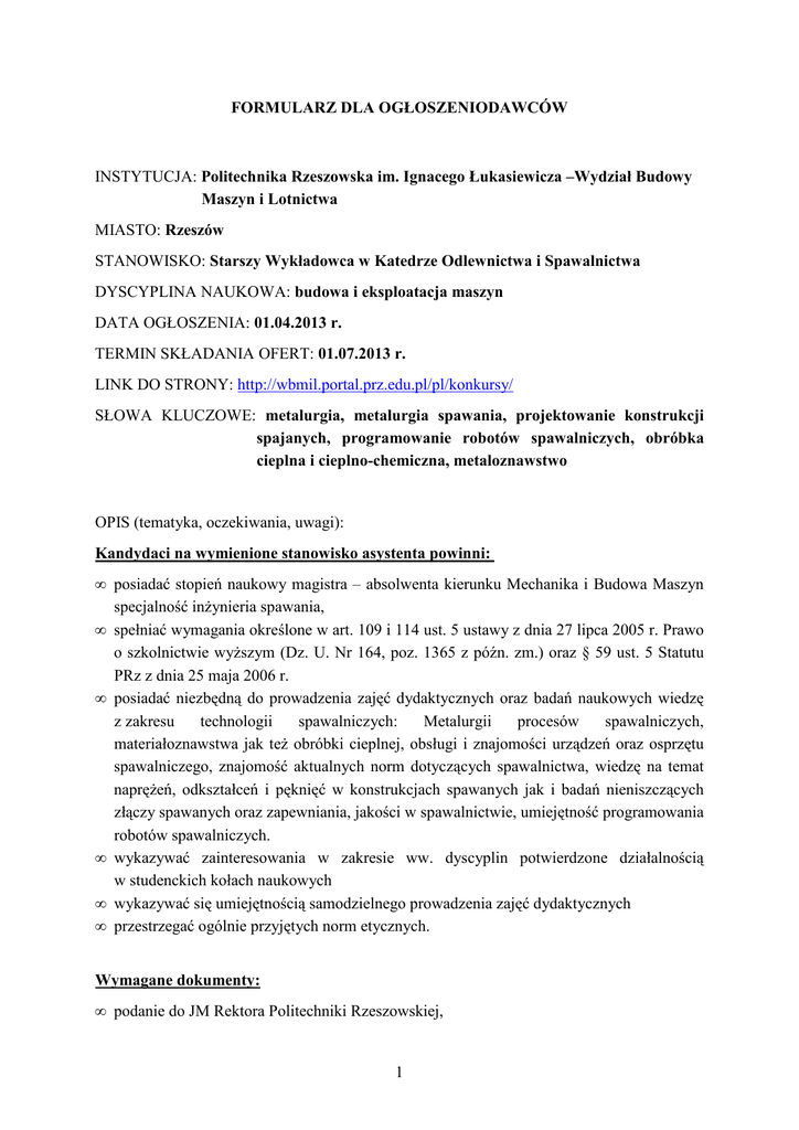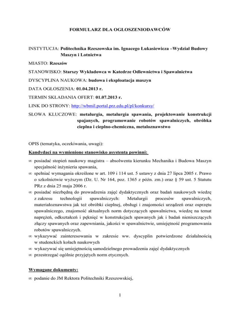 FORMULARZ DLA OGŁOSZENIODAWCÓW INSTYTUCJA: Politechnika Rzeszowska im. Ignacego Łukasiewicza –Wydział Budowy Maszyn i Lotnictwa MIASTO: Rzeszów STANOWISKO: Starszy Wykładowca w Katedrze Odlewnictwa i Spawalnictwa DYSCYPLINA NAUKOWA: budowa i eksploatacja maszyn DATA OGŁOSZENIA: 01.04.2013 r. TERMIN SKŁADANIA OFERT: 01.07.2013 r. LINK DO STRONY: http://wbmil.portal.prz.edu.pl/pl/konkursy/ SŁOWA KLUCZOWE: metalurgia, metalurgia spawania, projektowanie konstrukcji spajanych, programowanie robotów spawalniczych, obróbka cieplna i cieplno-chemiczna, metaloznawstwo OPIS (tematyka, oczekiwania, uwagi): Kandydaci na wymienione stanowisko asystenta powinni: • posiadać stopień naukowy magistra – absolwenta kierunku Mechanika i Budowa Maszyn specjalność inŜynieria spawania, • spełniać wymagania określone w art. 109 i 114 ust. 5 ustawy z dnia 27 lipca 2005 r. Prawo o szkolnictwie wyŜszym (Dz. U. Nr 164, poz. 1365 z późn. zm.) oraz § 59 ust. 5 Statutu PRz z dnia 25 maja 2006 r. • posiadać niezbędną do prowadzenia zajęć dydaktycznych oraz badań naukowych wiedzę z zakresu technologii spawalniczych: Metalurgii procesów spawalniczych, materiałoznawstwa jak teŜ obróbki cieplnej, obsługi i znajomości urządzeń oraz osprzętu spawalniczego, znajomość aktualnych norm dotyczących spawalnictwa, wiedzę na temat napręŜeń, odkształceń i pęknięć w konstrukcjach spawanych jak i badań nieniszczących złączy spawanych oraz zapewniania, jakości w spawalnictwie, umiejętność programowania robotów spawalniczych. • wykazywać zainteresowania w zakresie ww. dyscyplin potwierdzone działalnością w studenckich kołach naukowych • wykazywać się umiejętnością samodzielnego prowadzenia zajęć dydaktycznych • przestrzegać ogólnie przyjętych norm etycznych. Wymagane dokumenty: • podanie do JM Rektora Politechniki Rzeszowskiej, 1 • CV, kwestionariusz osobowy, • Odpis (kopia) dyplomu ukończenia studiów • oświadczenie kandydata, Ŝe Politechnika Rzeszowska będzie podstawowym miejscem pracy w przypadku wygrania konkursu, • oświadczenie o wyraŜeniu zgody na przetwarzanie danych osobowych zawartych w ofercie pracy dla potrzeb niezbędnych do realizacji procesu rekrutacji zgodnie z ustawą z dnia 29.08.1997 r. o ochronie danych osobowych (tj.: Dz. U. z 2002 r. Nr 101, poz. 926 ze zm.). Dokumenty naleŜy złoŜyć do dnia 01.07.2013 roku, w Dziekanacie Wydziału Budowy Maszyn i Lotnictwa Politechniki Rzeszowskiej, al. Powstańców Warszawy 8, 35-959 Rzeszów. Politechnika Rzeszowska zastrzega sobie prawo do zamknięcia konkursu bez wyłaniania kandydata. Niepoinformowanie kandydata o wynikach konkursu jest równoznaczne z odrzuceniem jego oferty. 2