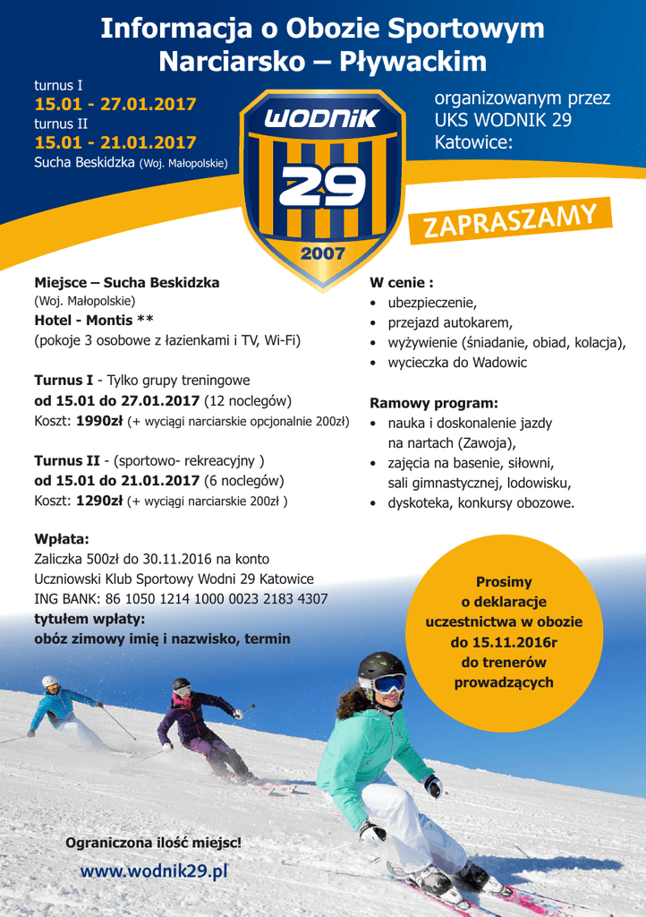 Informacja o Obozie Sportowym Narciarsko – Pływackim turnus I organizowanym przez UKS WODNIK 29 Katowice: 15.01 - 27.01.2017 turnus II 15.01 - 21.01.2017 Sucha Beskidzka (Woj. Małopolskie) 2007 Miejsce – Sucha Beskidzka (Woj. Małopolskie) Hotel - Montis ** (pokoje 3 osobowe z łazienkami i TV, Wi-Fi) Turnus I - Tylko grupy treningowe od 15.01 do 27.01.2017 (12 noclegów) Koszt: 1990zł (+ wyciągi narciarskie opcjonalnie 200zł) Turnus II - (sportowo- rekreacyjny ) od 15.01 do 21.01.2017 (6 noclegów) Koszt: 1290zł (+ wyciągi narciarskie 200zł ) Wpłata: Zaliczka 500zł do 30.11.2016 na konto Uczniowski Klub Sportowy Wodni 29 Katowice ING BANK: 86 1050 1214 1000 0023 2183 4307 tytułem wpłaty: obóz zimowy imię i nazwisko, termin Ograniczona ilość miejsc! www.wodnik29.pl ZAPRASZAMY W cenie : • ubezpieczenie, • przejazd autokarem, • wyżywienie (śniadanie, obiad, kolacja), • wycieczka do Wadowic Ramowy program: • nauka i doskonalenie jazdy na nartach (Zawoja), • zajęcia na basenie, siłowni, sali gimnastycznej, lodowisku, • dyskoteka, konkursy obozowe. Prosimy o deklaracje uczestnictwa w obozie do 15.11.2016r do trenerów prowadzących