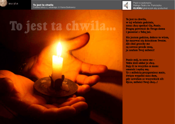 muzyka To jest ta chwila Przekład tekstu z j. włoskiego: © Hanna Bartkiewicz To jest ta chwila... Pieśń w wykonaniu Małego Teatru św. Franciszka. KLIKNIJ głośniczek aby posłuchać To jest ta chwila, w tej właśnie godzinie, teraz chcę spotkać Cię, Panie. Pragnę powrócić do Twego domu i pozostać z Tobą już. Nie jestem godzien, dobrze to wiem, by nazywać się dzieckiem Twoim. Ale choć grzechy me są zawsze przede mną, ja zaufam Twej miłości! Panie mój, to serce me – Tobie dziś oddać je chcę. Daję Ci to wszytko co mam: smutek i nędzę mą. Ty z miłością przygarniesz mnie, święto wypełni nasz dom, gdy zawołam ze wszystkich sił: Ojcze, miłości Twej chcę...!