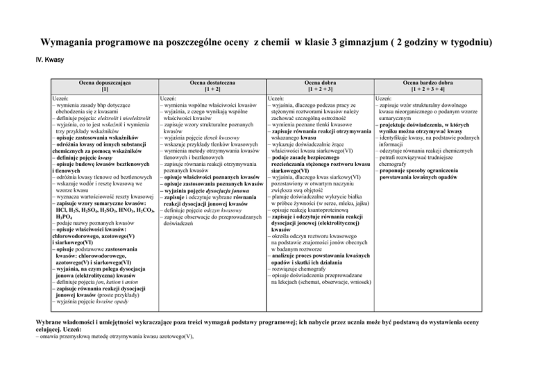 Wymagania programowe na poszczególne oceny z chemii w klasie 3 gimnazjum ( 2 godziny w tygodniu) IV. Kwasy Ocena dopuszczająca [1] Ocena dostateczna [1 + 2] Ocena dobra [1 + 2 + 3] Ocena bardzo dobra [1 + 2 + 3 + 4] Uczeń: – wymienia zasady bhp dotyczące obchodzenia się z kwasami – definiuje pojęcia: elektrolit i nieelektrolit – wyjaśnia, co to jest wskaźnik i wymienia trzy przykłady wskaźników – opisuje zastosowania wskaźników – odróżnia kwasy od innych substancji chemicznych za pomocą wskaźników – definiuje pojęcie kwasy – opisuje budowę kwasów beztlenowych i tlenowych – odróżnia kwasy tlenowe od beztlenowych – wskazuje wodór i resztę kwasową we wzorze kwasu – wyznacza wartościowość reszty kwasowej – zapisuje wzory sumaryczne kwasów: HCl, H2S, H2SO4, H2SO3, HNO3, H2CO3, H3PO4 – podaje nazwy poznanych kwasów – opisuje właściwości kwasów: chlorowodorowego, azotowego(V) i siarkowego(VI) – opisuje podstawowe zastosowania kwasów: chlorowodorowego, azotowego(V) i siarkowego(VI) – wyjaśnia, na czym polega dysocjacja jonowa (elektrolityczna) kwasów – definiuje pojęcia jon, kation i anion – zapisuje równania reakcji dysocjacji jonowej kwasów (proste przykłady) – wyjaśnia pojęcie kwaśne opady Uczeń: – wymienia wspólne właściwości kwasów – wyjaśnia, z czego wynikają wspólne właściwości kwasów – zapisuje wzory strukturalne poznanych kwasów – wyjaśnia pojęcie tlenek kwasowy – wskazuje przykłady tlenków kwasowych – wymienia metody otrzymywania kwasów tlenowych i beztlenowych – zapisuje równania reakcji otrzymywania poznanych kwasów – opisuje właściwości poznanych kwasów – opisuje zastosowania poznanych kwasów wyjaśnia pojęcie dysocjacja jonowa – zapisuje i odczytuje wybrane równania reakcji dysocjacji jonowej kwasów – definiuje pojęcie odczyn kwasowy – zapisuje obserwacje do przeprowadzanych doświadczeń Uczeń: – wyjaśnia, dlaczego podczas pracy ze stężonymi roztworami kwasów należy zachować szczególną ostrożność – wymienia poznane tlenki kwasowe – zapisuje równania reakcji otrzymywania wskazanego kwasu – wykazuje doświadczalnie żrące właściwości kwasu siarkowego(VI) – podaje zasadę bezpiecznego rozcieńczania stężonego roztworu kwasu siarkowego(VI) – wyjaśnia, dlaczego kwas siarkowy(VI) pozostawiony w otwartym naczyniu zwiększa swą objętość – planuje doświadczalne wykrycie białka w próbce żywności (w serze, mleku, jajku) – opisuje reakcję ksantoproteinową – zapisuje i odczytuje równania reakcji dysocjacji jonowej (elektrolitycznej) kwasów – określa odczyn roztworu kwasowego na podstawie znajomości jonów obecnych w badanym roztworze – analizuje proces powstawania kwaśnych opadów i skutki ich działania – rozwiązuje chemografy – opisuje doświadczenia przeprowadzane na lekcjach (schemat, obserwacje, wniosek) Uczeń: – zapisuje wzór strukturalny dowolnego kwasu nieorganicznego o podanym wzorze sumarycznym – projektuje doświadczenia, w których wyniku można otrzymywać kwasy – identyfikuje kwasy, na podstawie podanych informacji – odczytuje równania reakcji chemicznych – potrafi rozwiązywać trudniejsze chemografy – proponuje sposoby ograniczenia powstawania kwaśnych opadów Wybrane wiadomości i umiejętności wykraczające poza treści wymagań podstawy programowej; ich nabycie przez ucznia może być podstawą do wystawienia oceny celującej. Uczeń: – omawia przemysłową metodę otrzymywania kwasu azotowego(V), – definiuje pojęcie stopień dysocjacji, – dzieli elektrolity ze względu na stopień dysocjacji. V. Wodorotlenki Ocena dopuszczająca [1] Ocena dostateczna [1 + 2] Ocena dobra [1 + 2 + 3] Ocena bardzo dobra [1 + 2 + 3 + 4] Uczeń: – wymienia zasady bhp dotyczące obchodzenia się z zasadami – odróżnia zasady od innych substancji chemicznych za pomocą wskaźników – definiuje pojęcia wodorotlenek i zasada – opisuje budowę wodorotlenków – podaje wartościowość grupy wodorotlenowej – zapisuje wzory sumaryczne wodorotlenków: NaOH, KOH, Ca(OH)2, Al(OH)3 – opisuje właściwości oraz zastosowania wodorotlenków: sodu, potasu i wapnia – wyjaśnia, na czym polega dysocjacja jonowa (elektrolityczna) zasad – zapisuje równania dysocjacji jonowej zasad (proste przykłady) podaje nazwy jonów powstałych w wyniku – odróżnia zasady od kwasów za pomocą wskaźników – wymienia rodzaje odczynu roztworów – określa zakres pH i barwy wskaźników dla poszczególnych odczynów Uczeń: – wymienia wspólne właściwości zasad – wyjaśnia, z czego wynikają wspólne właściwości zasad – definiuje pojęcie tlenek zasadowy – podaje przykłady tlenków zasadowych – wymienia dwie główne metody otrzymywania wodorotlenków – zapisuje równania reakcji otrzymywania wodorotlenku sodu, potasu i wapnia – wyjaśnia pojęcia woda wapienna, wapno palone i wapno gaszone – określa rozpuszczalność wodorotlenków na podstawie tabeli rozpuszczalności – odczytuje proste równania dysocjacji jonowej (elektrolitycznej) zasad – definiuje pojęcie odczyn zasadowy – omawia skalę pH – bada odczyn i pH roztworu – zapisuje obserwacje do przeprowadzanych doświadczeń Uczeń: – rozróżnia pojęcia wodorotlenek i zasada – wymienia przykłady wodorotlenków i zasad – wyjaśnia, dlaczego podczas pracy z zasadami należy zachować szczególną ostrożność – wymienia poznane tlenki zasadowe – zapisuje równania reakcji otrzymywania wybranego wodorotlenku – planuje doświadczenia, w których wyniku, można otrzymać wodorotlenek: sodu, potasu lub wapnia – planuje sposób otrzymywania wodorotlenków trudno rozpuszczalnych – zapisuje i odczytuje równania dysocjacji jonowej (elektrolitycznej) zasad – określa odczyn roztworu zasadowego na podstawie znajomości jonów obecnych w badanym roztworze – rozwiązuje chemografy – 