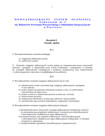 1 WEWNĄTRZSZKOLNY SYSTEM O CENIANIA Gimnazjum nr 2 im. Bohaterów Powstania Warszawskiego z Oddziałami Integracyjnymi w Piastowie Rozdział I Zasady ogólne & 1. 1. Wewnątrzszkolnemu ocenianiu podlegają: a) osiągnięcia edukacyjne ucznia, b) zachowanie ucznia. 2. Ocenianie osiągnięć edukacyjnych ucznia polega na rozpoznawaniu przez nauczycieli poziomu i postępów w opanowaniu przez ucznia wiadomości i umiejętności w stosunku do wymagań edukacyjnych wynikających z podstawy programowej oraz realizowanych w szkole programów nauczania, uwzględniających tę podstawę. & 2. 1. Wewnątrzszkolne ocenianie osiągnięć edukacyjnych ma na celu: a) informowanie ucznia o poziomie jego osiągnięć edukacyjnych i postępach w tym zakresie, b) pomoc poprzez przekazanie informacji uczniowi o tym, co zrobił dobrze i jak powinien się dalej uczyć, b) pomoc uczniowi w planowaniu procesu uczenia się i rozwoju, c) motywowanie do pracy, d) dostarczanie informacji o uczniu jego rodzicom i nauczycielom, e) umożliwienie nauczycielom doskonalenia organizacji i metod pracy. 2. Wewnątrzszkolne ocenianie osiągnięć edukacyjnych obejmuje: a) formułowanie przez nauczycieli wymagań edukacyjnych niezbędnych uczniowi do otrzymania poszczególnych śródrocznych i rocznych ocen klasyfikacyjnych z obowiązkowych i dodatkowych zajęć edukacyjnych, b) ocenianie bieżące oraz ustalanie śródrocznych ocen klasyfikacyjnych z obowiązkowych i dodatkowych zajęć edukacyjnych według skali i w formach przyjętych w gimnazjum, c) przeprowadzanie egzaminów klasyfikacyjnych i poprawkowych, 2 d) ustalanie rocznych ocen klasyfikacyjnych z obowiązkowych i dodatkowych zajęć edukacyjnych, e) realizację przewidzianych procedur poprawiania ocen, w tym ustalanie warunków i trybu uzyskania wyższych niż przewidywane rocznych ocen klasyfikacyjnych z zajęć obowiązkowych i dodatkowych, f) ustalanie kryteriów oceniania zachowania, g) ustalanie warunków i sposobu przekazywania rodzicom informacji o postępach i trudnościach w nauce i zachowaniu ucznia oraz jego uzdolnieniach. &.3. 1. Ocenianie zachowania ucznia polega na rozpoznawaniu poprzez wychowawcę klasy, nauczycieli oraz uczniów danej klasy stopnia respektowania norm etycznych i zasad współżycia społecznego oraz obowiązków ucznia określonych w Statucie Gimnazjum. 2. Ocenianie zachowania ucznia ma na celu: a) wspieranie rozwoju psychicznego, kształtowanie dojrzałości, samodzielności i odpowiedzialności za siebie oraz umiejętności współżycia w grupie, b) dostarczanie rodzicom informacji o postawie dziecka oraz pomoc w ich pracy wychowawczej. 3. Ocenianie zachowania ucznia obejmuje: a) b) ustalanie kryteriów oceny zachowania, bieżące obserwowanie uczniów, gromadzenie informacji w „zeszycie obserwacji” oraz systematyczne przekazywanie ich rodzicom, c) ustalanie śródrocznej i rocznej oceny zachowania, d) ustalanie warunków i trybu uzyskania wyższej niż przewidywana rocznej oceny klasyfikacyjnej zachowania. Rozdział II. Zasady informowania o ocenianiu & 4. 1. Do 15 września każdego roku szkolnego nauczyciele informują uczniów oraz ich rodziców o: a) wymaganiach edukacyjnych i kryteriach oceniania, b) sposobach sprawdzania osiągnięć edukacyjnych. 2. Nauczyciel jest obowiązany dostosować wymagania edukacyjne oraz sposób oceniania, o których mowa w ust. 1 pkt 1, do indywidualnych potrzeb rozwojowych i edukacyjnych a także możliwości psychofizycznych ucznia. 3 3. Proces oceniania ucznia jest jawny w każdej jego fazie zarówno dla ucznia, jak i jego rodziców. Ocena powinna być uzasadniona w oparciu o przedmiotowe wymagania edukacyjne. 4. Sprawdzone i ocenione pisemne prace ucznia są na bieżąco udostępniane uczniowi oraz rodzicom w obecności nauczyciela po wcześniejszym uzgodnieniu terminu. 5. Po uzgodnieniu z rodzicem szkoła może dokonać kserokopii pracy ucznia. Druk prośby o wydanie kserokopii znajduje się w sekretariacie szkoły oraz jest udostępniony na stronie internetowej szkoły. 6. Propozycje oceny rocznej ustala się na dwa tygodnie przed posiedzeniem rady klasyfikacyjnej. Ostatecznym terminem ustalenia oceny semestralnej/rocznej jest ostatni dzień tygodnia poprzedzającego posiedzenie Rady Pedagogicznej. 7. Na miesiąc przed rocznym posiedzeniem klasyfikacyjnym wychowawcy klas są zobowiązani do poinformowania rodziców o przewidywanych niedostatecznych ocenach z zajęć edukacyjnych oraz o obniżonej ocenie zachowania ucznia. Informacji należy udzielić ustnie (zapis w dzienniku) lub listownie (list polecony). Jeżeli obniżenie oceny zachowania nastąpiło na skutek zdarzeń mających miejsce na mniej niż miesiąc przed posiedzeniem Rady Pedagogicznej, zawiadomienie może nastąpić w terminie późniejszym. Jeśli uczeń dopuścił się czynu nagannego po wystawieniu oceny, można ją zmienić na nadzwyczajnym posiedzeniu Rady Pedagogicznej. 8. Nie później niż dwa tygodnie przed terminem wystawiania ocen nauczyciel jest zobowiązany w formie informacji zapisanej w dzienniku poinformować uczniów a za ich pośrednictwem rodziców o przewidywanych ocenach rocznych. Obowiązek ten nie dotyczy przypadku nieusprawiedliwionej nieobecności ucznia w szkole. Ocena ostateczna może się różnić od prognozowanej nie więcej niż o jeden stopień. & 5. Informacje dotyczące przebiegu i wyniku procesu oceniania są poufne dla osób postronnych. Za osoby takie nie uznaje się pracowników pedagogicznych szkoły oraz uczniów tej samej klasy. & 6. Okres przechowywania dokumentacji związanej z ocenianiem (dzienniki zajęć, arkusze ocen) określają odrębne przepisy. W przypadkach nimi nieuregulowanych okres ten nie może być krótszy niż do końca roku szkolnego. 4 Rozdział III. Tryb oceniania i skala ocen & 7. 1. Ocenianie przedmiotowe odbywa się w ramach poszczególnych zajęć w formie wystawianych systematycznie i na bieżąco ocen cząstkowych oraz formułowania oceny okresowej