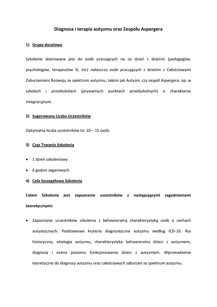 Diagnoza i terapia autyzmu oraz Zespołu Aspergera 1) Grupa docelowa Szkolenie skierowane jest do osób pracujących na co dzień z dziećmi (pedagogów, psychologów, terapeutów SI, etc) zwłaszcza osób pracujących z dziećmi z Całościowymi Zaburzeniami Rozwoju ze spektrum autyzmu, takimi jak Autyzm, czy zespół Aspergera, np. w szkołach i przedszkolach (prywatnych punktach przedszkolnych) o charakterze integracyjnym. 2) Sugerowana Liczba Uczestników Optymalna liczba uczestników to: 10 – 15 osób. 3) Czas Trwania Szkolenia 1 dzień szkoleniowy 6 godzin zegarowych 4) Cele Szczegółowe Szkolenia Celem Szkolenia jest zapoznanie uczestników z następującymi zagadnieniami teoretycznymi: Zapoznanie uczestników szkolenia z behawioralną charakterystyką osób o cechach autystycznych. Podstawowe kryteria diagnostyczne autyzmu według ICD-10. Rys historyczny, etiologia autyzmu, charakterystyka behawioralna dzieci z autyzmem, diagnoza i ocena poziomu funkcjonowania dzieci z autyzmem. Wprowadzenie teoretyczne do diagnozy autyzmu oraz całościowych zaburzeń ze spektrum autyzmu. Zapoznanie uczestników szkolenia ze sposobem doboru procedur behawioralnych w odniesieniu do pracy z osobami z zaburzeniami ze spektrum autyzmu. Teorie uczenia się oparte na zasadzie warunkowania klasycznego i warunkowania sprawczego, główne cele terapii behawioralnej. Omówienie sposobów planowania i monitorowania pracy edukacyjno-terapeutycznej z dzieckiem o profilu autystycznym w oparciu o techniki behawioralne. Wzbogacanie warsztatu pracy nauczyciela poprzez dostarczenie propozycji oddziaływań wychowawczych i edukacyjnych adekwatnych do specyficznych potrzeb ucznia/dziecka z autyzmem. 5) Metody Pracy Szkoleniowej Szkolenie prowadzone jest metodami aktywnymi, takimi jak: ćwiczenia zespołowe, praca w parach i małych grupach, dyskusje grupowe, mini-wykład. 6) Korzyści dla Uczestników Po szkoleniu każdy uczestnik: potrafi scharakteryzować dziecko o cechach autystycznych, zna podstawowe narzędzia diagnostyczne, zna ogólne cele i zasady terapii behawioralnej, potrafi samodzielnie skonstruować program edukacyjno – terapeutyczny, potrafi dobrać właściwe procedury postępowania behawioralnego.