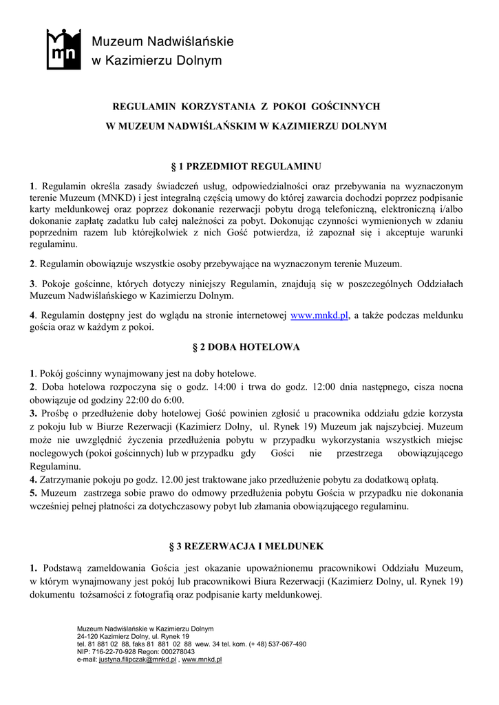 REGULAMIN KORZYSTANIA Z POKOI GOŚCINNYCH W MUZEUM NADWIŚLAŃSKIM W KAZIMIERZU DOLNYM § 1 PRZEDMIOT REGULAMINU 1. Regulamin określa zasady świadczeń usług, odpowiedzialności oraz przebywania na wyznaczonym terenie Muzeum (MNKD) i jest integralną częścią umowy do której zawarcia dochodzi poprzez podpisanie karty meldunkowej oraz poprzez dokonanie rezerwacji pobytu drogą telefoniczną, elektroniczną i/albo dokonanie zapłatę zadatku lub całej należności za pobyt. Dokonując czynności wymienionych w zdaniu poprzednim razem lub którejkolwiek z nich Gość potwierdza, iż zapoznał się i akceptuje warunki regulaminu. 2. Regulamin obowiązuje wszystkie osoby przebywające na wyznaczonym terenie Muzeum. 3. Pokoje gościnne, których dotyczy niniejszy Regulamin, znajdują się w poszczególnych Oddziałach Muzeum Nadwiślańskiego w Kazimierzu Dolnym. 4. Regulamin dostępny jest do wglądu na stronie internetowej www.mnkd.pl, a także podczas meldunku gościa oraz w każdym z pokoi. § 2 DOBA HOTELOWA 1. Pokój gościnny wynajmowany jest na doby hotelowe. 2. Doba hotelowa rozpoczyna się o godz. 14:00 i trwa do godz. 12:00 dnia następnego, cisza nocna obowiązuje od godziny 22:00 do 6:00. 3. Prośbę o przedłużenie doby hotelowej Gość powinien zgłosić u pracownika oddziału gdzie korzysta z pokoju lub w Biurze Rezerwacji (Kazimierz Dolny, ul. Rynek 19) Muzeum jak najszybciej. Muzeum może nie uwzględnić życzenia przedłużenia pobytu w przypadku wykorzystania wszystkich miejsc noclegowych (pokoi gościnnych) lub w przypadku gdy Gości nie przestrzega obowiązującego Regulaminu. 4. Zatrzymanie pokoju po godz. 12.00 jest traktowane jako przedłużenie pobytu za dodatkową opłatą. 5. Muzeum zastrzega sobie prawo do odmowy przedłużenia pobytu Gościa w przypadku nie dokonania wcześniej pełnej płatności za dotychczasowy pobyt lub złamania obowiązującego regulaminu. § 3 REZERWACJA I MELDUNEK 1. Podstawą zameldowania Gościa jest okazanie upoważnionemu pracownikowi Oddziału Muzeum, w którym wynajmowany jest pokój lub pracownikowi Biura Rezerwacji (Kazimierz Dolny, ul. Rynek 19) dokumentu tożsamości z fotografią oraz podpisanie karty meldunkowej. Muzeum Nadwiślańskie w Kazimierzu Dolnym 24-120 Kazimierz Dolny, ul. Rynek 19 tel. 81 881 02 88, faks 81 881 02 88 wew. 34 tel. kom. (+ 48) 537-067-490 NIP: 716-22-70-928 Regon: 000278043 e-mail: [email protected] , www.mnkd.pl 2. Potwierdzenie dostępności terminu odbywa się na zasadzie pozyskania informacji w formie: telefonicznej, mailowo, osobiście. Rezerwację przyjmuje pracownik w Biurze Rezerwacji, Kazimierz Dolny, ul. Rynek 19, 8:30-16:30. 3. Jeżeli rezerwacja wyprzedza termin przyjazdu o więcej niż 5 dni, rezerwujący wpłaca na podany rachunek Bankowy Muzeum równowartość odpłatności za jedną dobę pobytu w wynajętym pokoju. Przedpłata nie podlega zwrotowi w przypadku rezygnacji rezerwującego z wykorzystania pokoju. 4. Gość nie może przekazywać pokoju innym osobom, nawet jeśli nie upłynął okres, za który uiścił należną za pobyt opłatę. 5. Osoby nie zameldowane w pokoju gościnnym mogą przebywać gościnnie od godz. 7:00 do godz. 22:00. 6. Muzeum może odmówić przyjęcia Gościa, który podczas poprzedniego pobytu rażąco naruszył Regulamin, w szczególności poprzez wyrządzenie szkody na mieniu Muzeum lub innych Gości przebywających na terenie Muzeum. 7. W przypadku nie odwołania rezerwacji pokoju w terminie do 18:00 w dniu przyjazdu lub w przypadku nie dotarcia Gościa w zaplanowanym terminie, Gość zostanie obciążony opłatą z pierwszą dobę. § 4 ODPOWIEDZIALNOŚĆ GOŚCI 1. Dzieci poniżej 12-tego roku życia powinny znajdować się na terenie Muzeum pod stałym nadzorem opiekunów prawnych. Opiekunowie prawni ponoszą odpowiedzialność materialną za wszelkie szkody powstałe w wyniku działania dzieci. 2. Gość hotelowy ponosi pełną odpowiedzialność materialną za wszelkiego rodzaju uszkodzenia lub zniszczenia wyposażenia i urządzeń technicznych pokoi gościnnych oraz innych udostępnionych pomieszczeń, powstałe z jego winy lub z winy odwiedzających go osób. 3. W przypadku naruszenia postanowień Regulaminu, Muzeum może odmówić świadczenia usług osobie, która je narusza. Osoba taka jest zobowiązana do niezwłocznego zastosowania się do żądań Muzeum, uregulowania należności za dotychczasowe świadczenia lub do zapłaty za ewentualne zniszczenia, a także do opuszczenia Muzeum. 4. Każdorazowo Gość opuszczający pokój, ze względów bezpieczeństwa, powinien wyłączyć telewizor, zgasić światło, zakręcić krany oraz zamknąć drzwi na klucz. 5. W udostępnianych pomieszczeniach obowiązuje bezwzględny zakaz wprowadzania zwierząt. 6. Ze względu na istniejący system sygnalizacji pożaru w pomieszczeniach obowiązuje bezwzględny zakaz palenia oraz używania otwartego ognia, a także urządzeń elektrycznych nie stanowiących wyposażenia pokoju. Złamania powyższego zakazu kosztuje 100,00 zł. 7. W przypadku uruchomienia przeciwpożarowego systemu alarmowego z winy gościa, ponosi on koszt 200,00 zł oraz koszt ewentualnej interwencji straży pożarnej. Muzeum Nadwiślańskie w Kazimierzu Dolnym 24-120 Kazimierz Dolny, ul. Rynek 19 tel. 81 881 02 88, faks 81 881 02 88 wew. 34 tel. kom. (+ 48) 537-067-490 NIP: 716-22-70-928 Regon: 000278043 e-mail: [email protected] , www.mnkd.pl § 5 ODPOWIEDZIALNOŚĆ MUZEUM 1. Muzeum nie ponosi odpowiedzialność za utratę lub uszkodzenie rzeczy wniesionych przez osoby korzystające z jego usług w zakresie określonym przepisami kodeksu cywilnego. 2. Gość powinien zawiadomić pracowników MNKD o wystąpieniu szkody, niezwłocznie po jej stwierdzeniu. 3. Muzeum nie ponosi odpowiedzialności za uszkodzenia i utratę samochodu lub innego pojazdu należącego do Gościa, przedmiotów w nim pozostawionych, niezależnie od tego, czy pojazdy te zostały zaparkowane na parkingu MNKD c