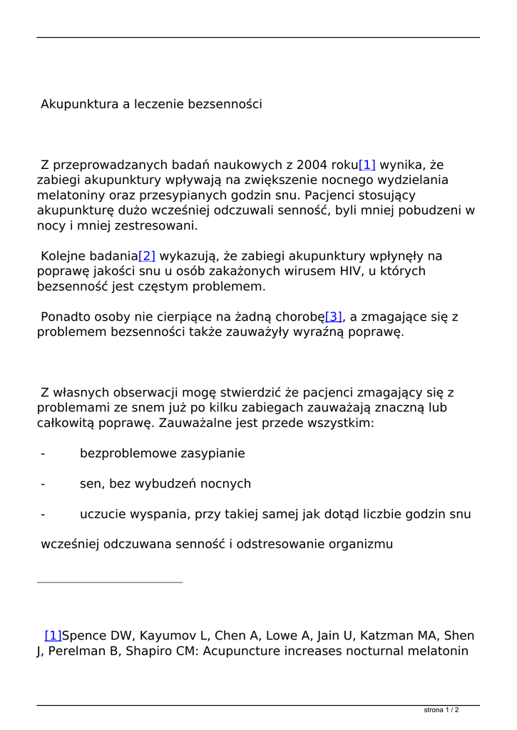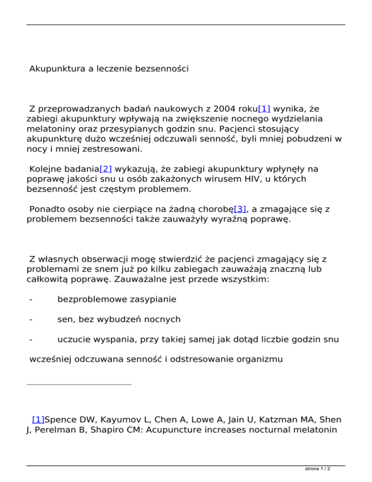 Akupunktura a leczenie bezsenności Z przeprowadzanych badań naukowych z 2004 roku[1] wynika, że zabiegi akupunktury wpływają na zwiększenie nocnego wydzielania melatoniny oraz przesypianych godzin snu. Pacjenci stosujący akupunkturę dużo wcześniej odczuwali senność, byli mniej pobudzeni w nocy i mniej zestresowani. Kolejne badania[2] wykazują, że zabiegi akupunktury wpłynęły na poprawę jakości snu u osób zakażonych wirusem HIV, u których bezsenność jest częstym problemem. Ponadto osoby nie cierpiące na żadną chorobę[3], a zmagające się z problemem bezsenności także zauważyły wyraźną poprawę. Z własnych obserwacji mogę stwierdzić że pacjenci zmagający się z problemami ze snem już po kilku zabiegach zauważają znaczną lub całkowitą poprawę. Zauważalne jest przede wszystkim: - bezproblemowe zasypianie - sen, bez wybudzeń nocnych - uczucie wyspania, przy takiej samej jak dotąd liczbie godzin snu wcześniej odczuwana senność i odstresowanie organizmu [1]Spence DW, Kayumov L, Chen A, Lowe A, Jain U, Katzman MA, Shen J, Perelman B, Shapiro CM: Acupuncture increases nocturnal melatonin strona 1 / 2 secretion and reduces insomnia and anxiety: a preliminary report. J Neuropsychiatry Clin Neurosci. 2004 Winter;16(1):19-28. [2]Phillips KD, Skelton WD: Effects of individualized acupuncture on sleep quality in HIV disease. J Assoc Nurses AIDS Care. 2001 Jan-Feb;12(1):27-39. [3]Montakab H.: Acupuncture and insomnia. Forsch Komplementarmed. 1999 Feb;6 Suppl 1:29-31. strona 2 / 2 Powered by TCPDF (www.tcpdf.org)